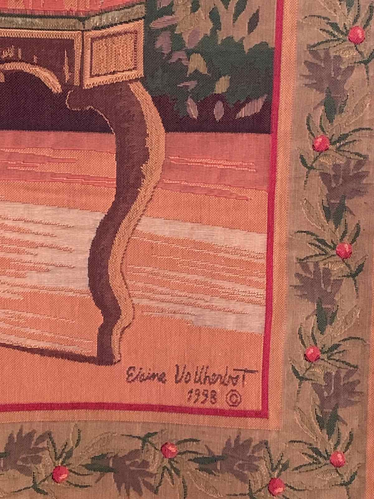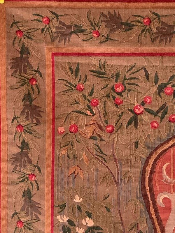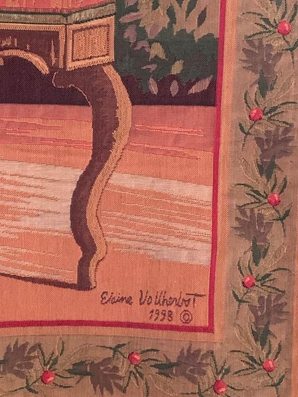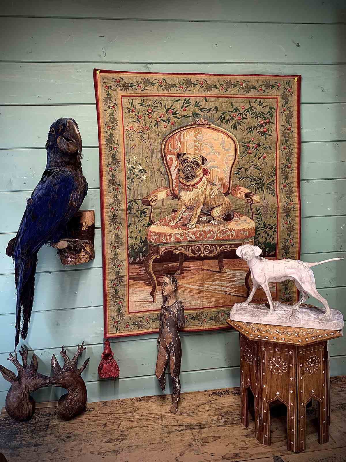 A charming late 20th Century wall hanging tapestry in lovely vintage condition depicting a pug seated on a French antique armchair.
