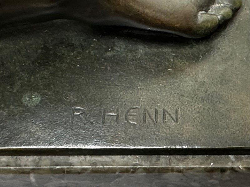 By the known listed German born sculptor Rudolph Henn he was born in 1880-1955) was born in Olsbrücken in Germany. Around the beginning of the 20th century Henn read figural sculpture at the Academy of Applied Arts in Munich, he fought as a soldier in WW1 in the German army. He moved together with his wide & children to America at the end of the 1920's when there was a terrible economic depressions & they lived in New York. He was known to have worked on housing design projects in New York with Heinz Warnecke & Theodore Barbarossa.