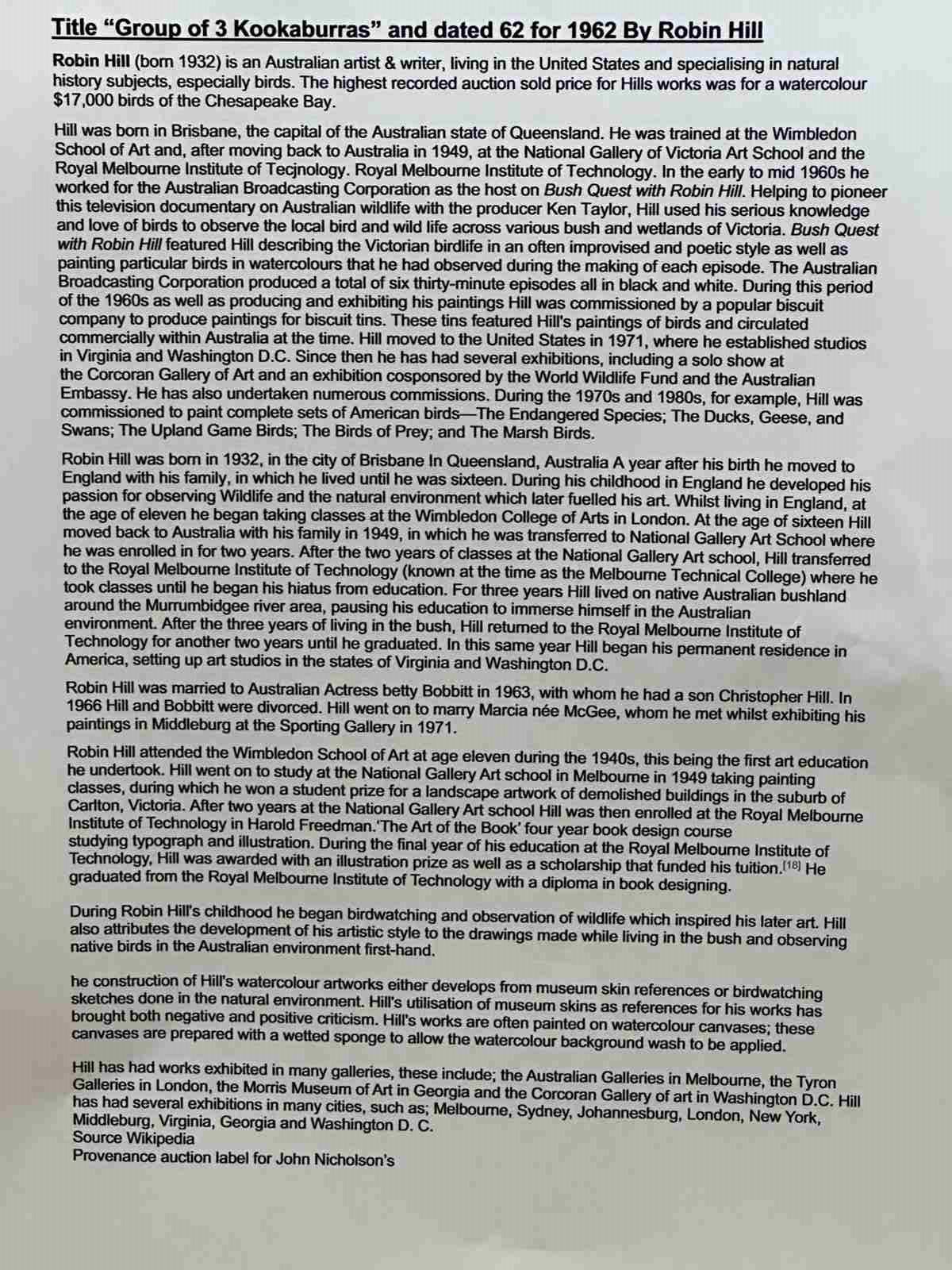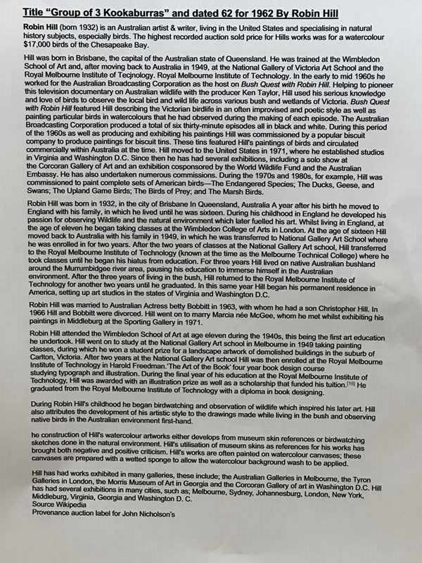 Robin Hill is a known Australian artist & also writer who was born in 1932, he specialising in natural subjects, particularly birds. The highest recorded auction sold price for his works was for a watercolour that fetched $17,000 birds of the Chesapeake Bay at auction.