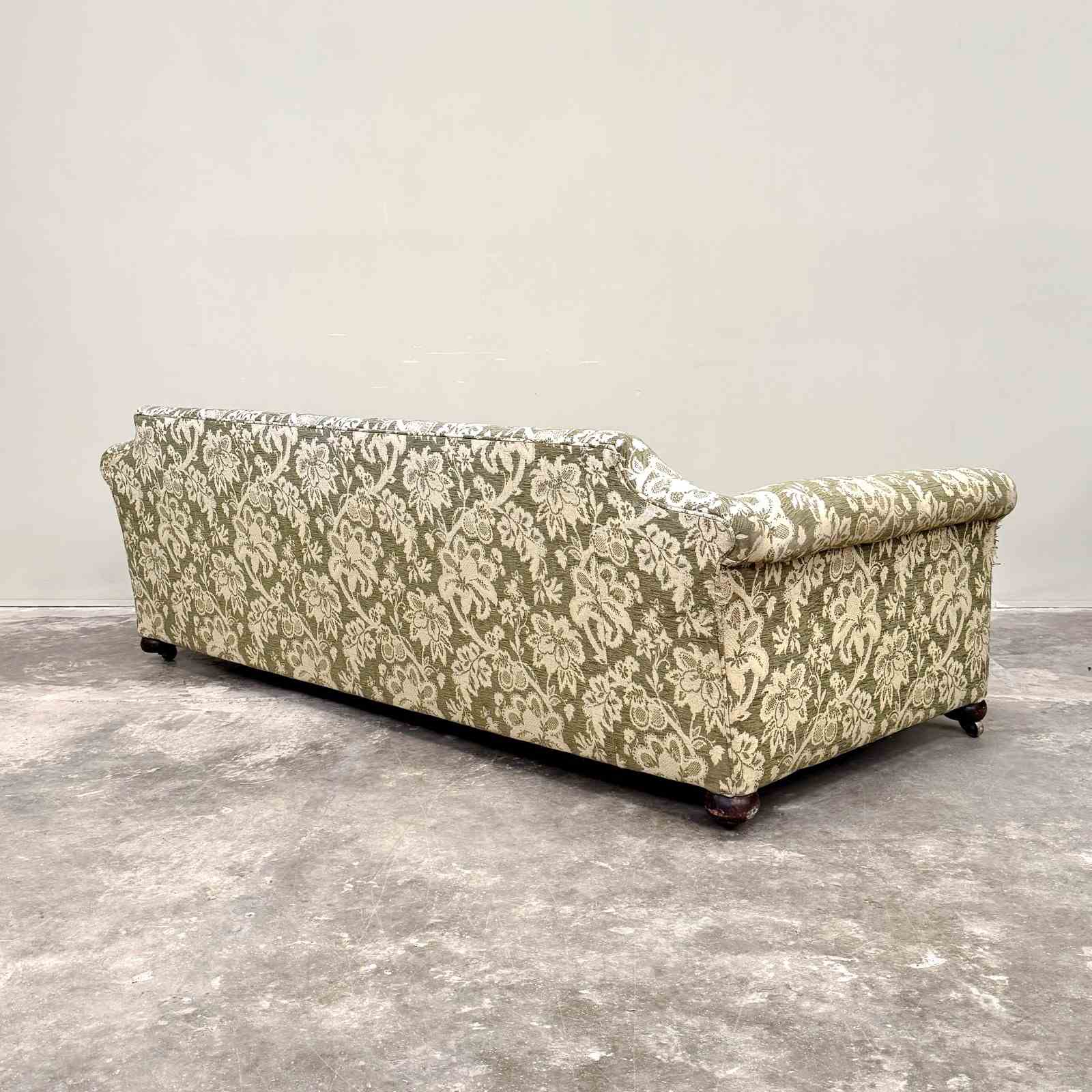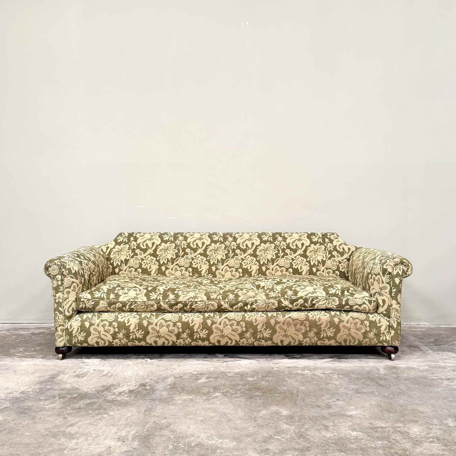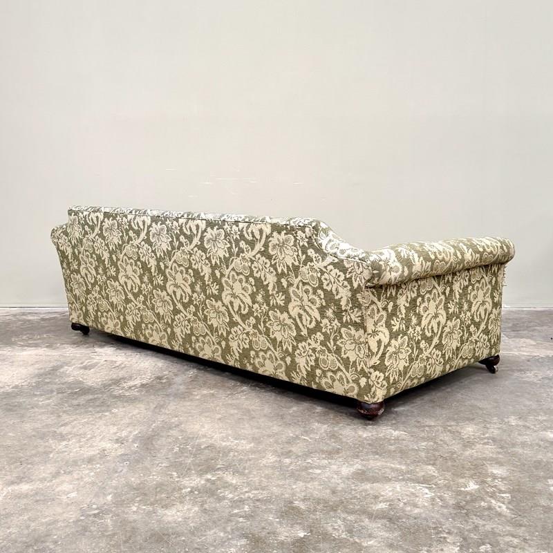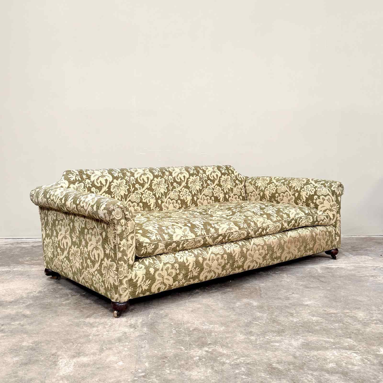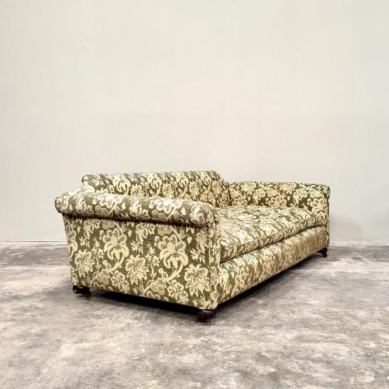 1930s very deep seated English country house sofa. Sprung seat and back with cut out corners and scroll arms. Standing on turned bun feet and brass castors. Now with one long seat cushion, but we would recommend two feather seat cushions.