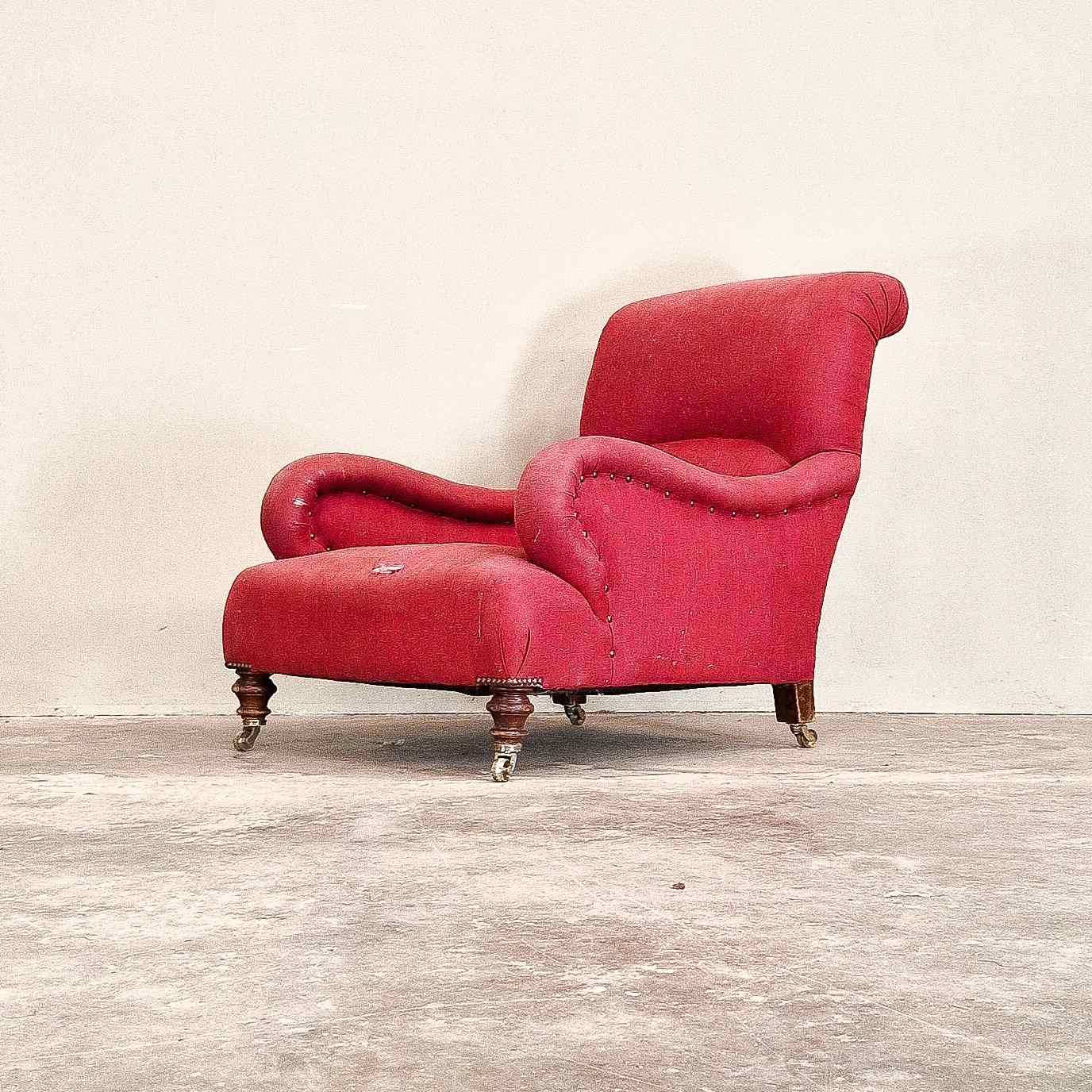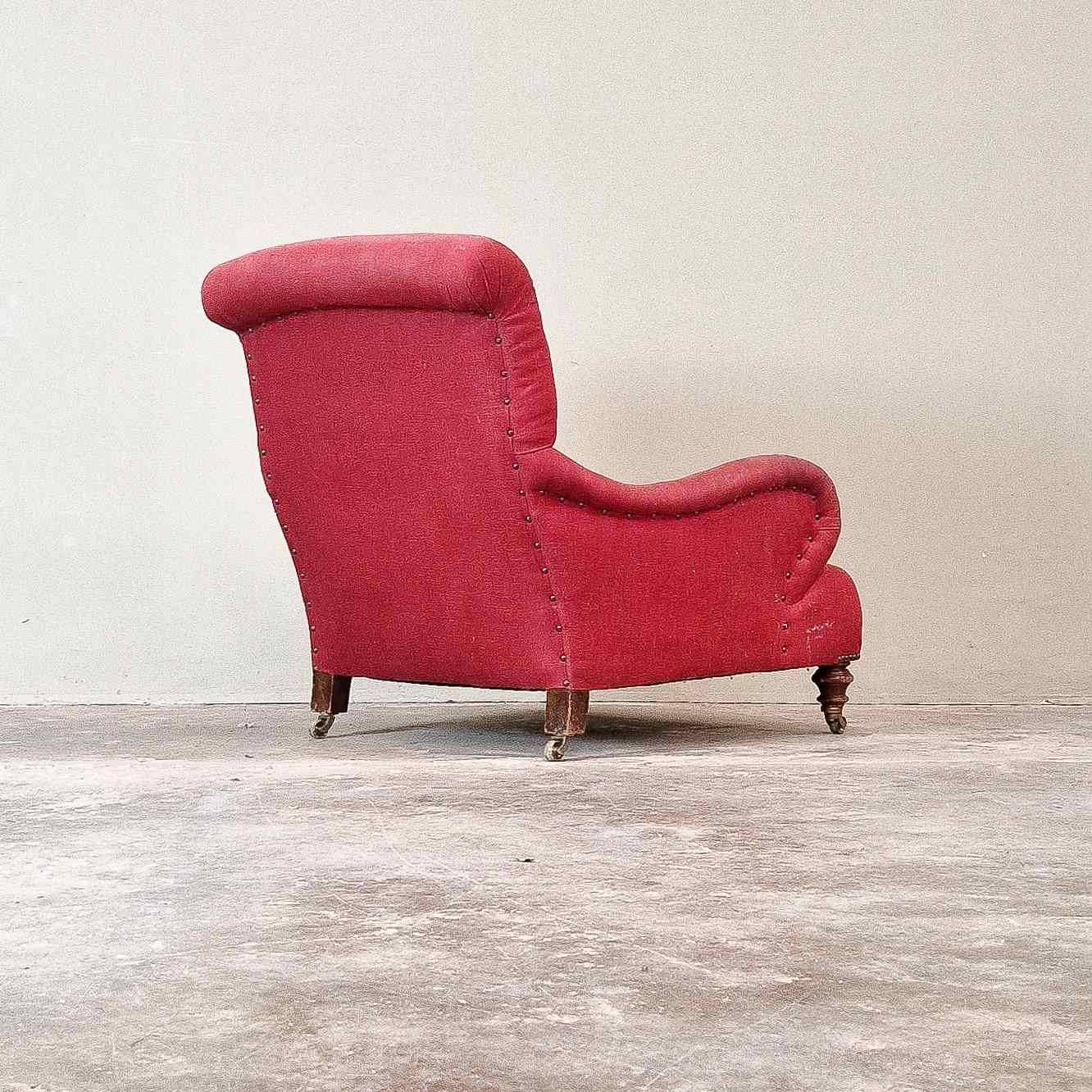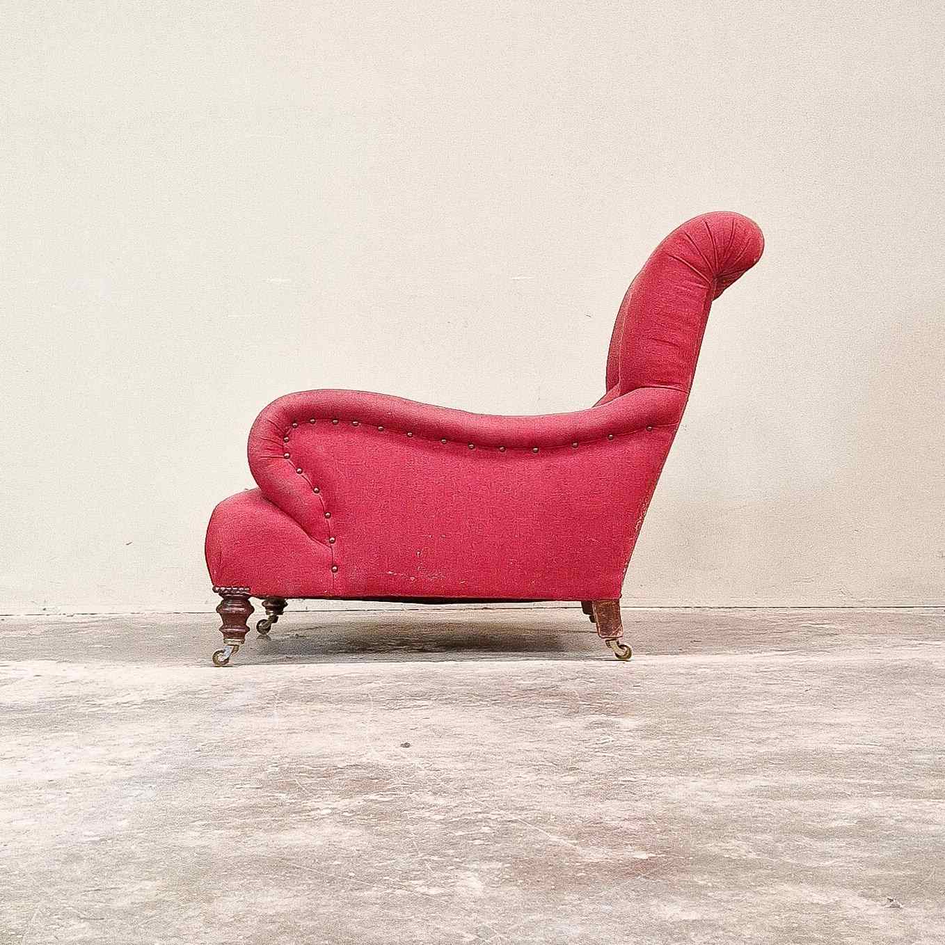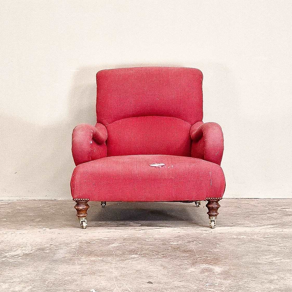 19th century English armchair, with 'P' arm. Standing on turned mahogany legs, and brass castors, with sprung seat and scroll to back. Circa 1880
