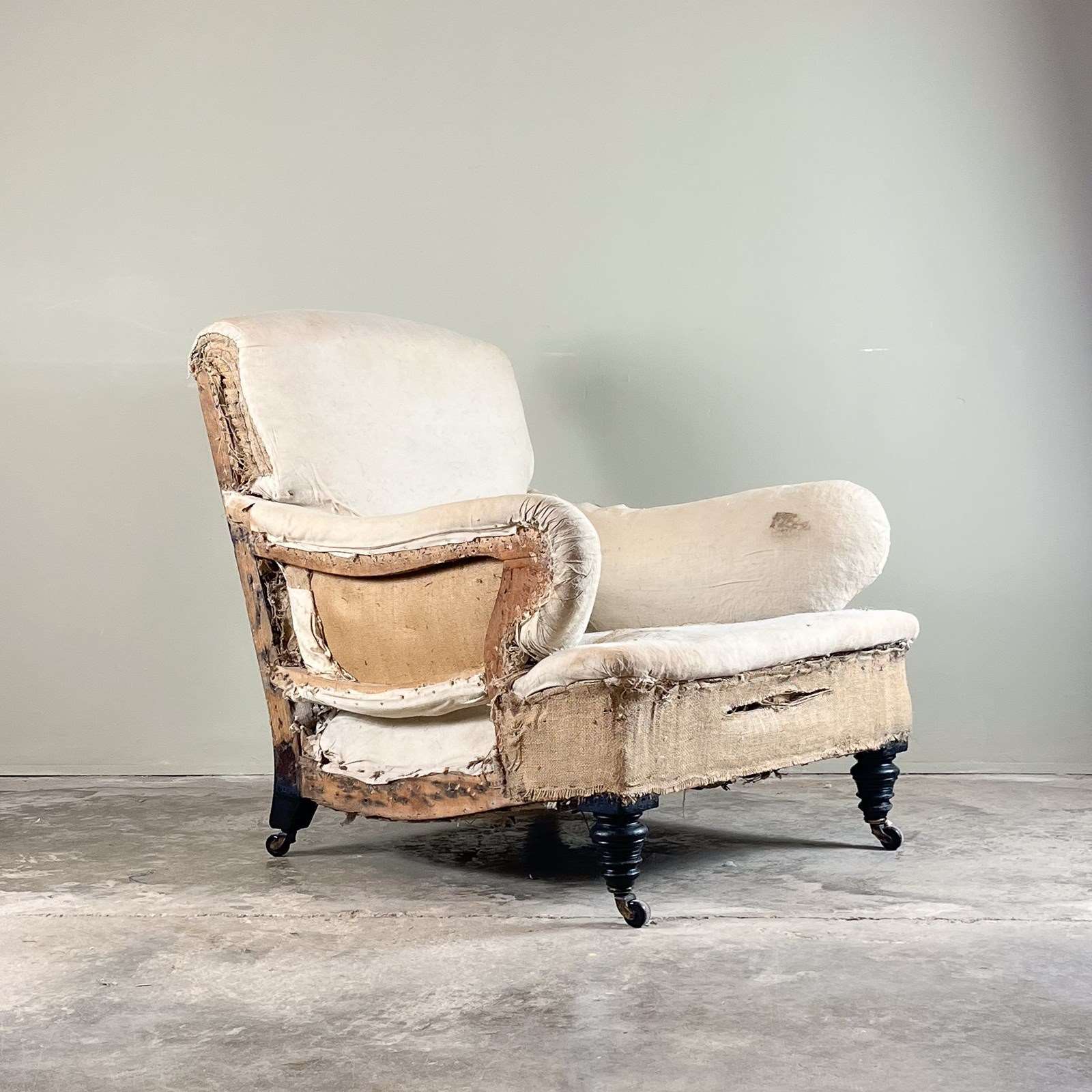 Very tatty the moment, but great shape to this 19th century armchair with 'P' arms, shaped swept serpentine side rails. Standing on turned ebonised legs, with a sprung seat and back. Circa 1880