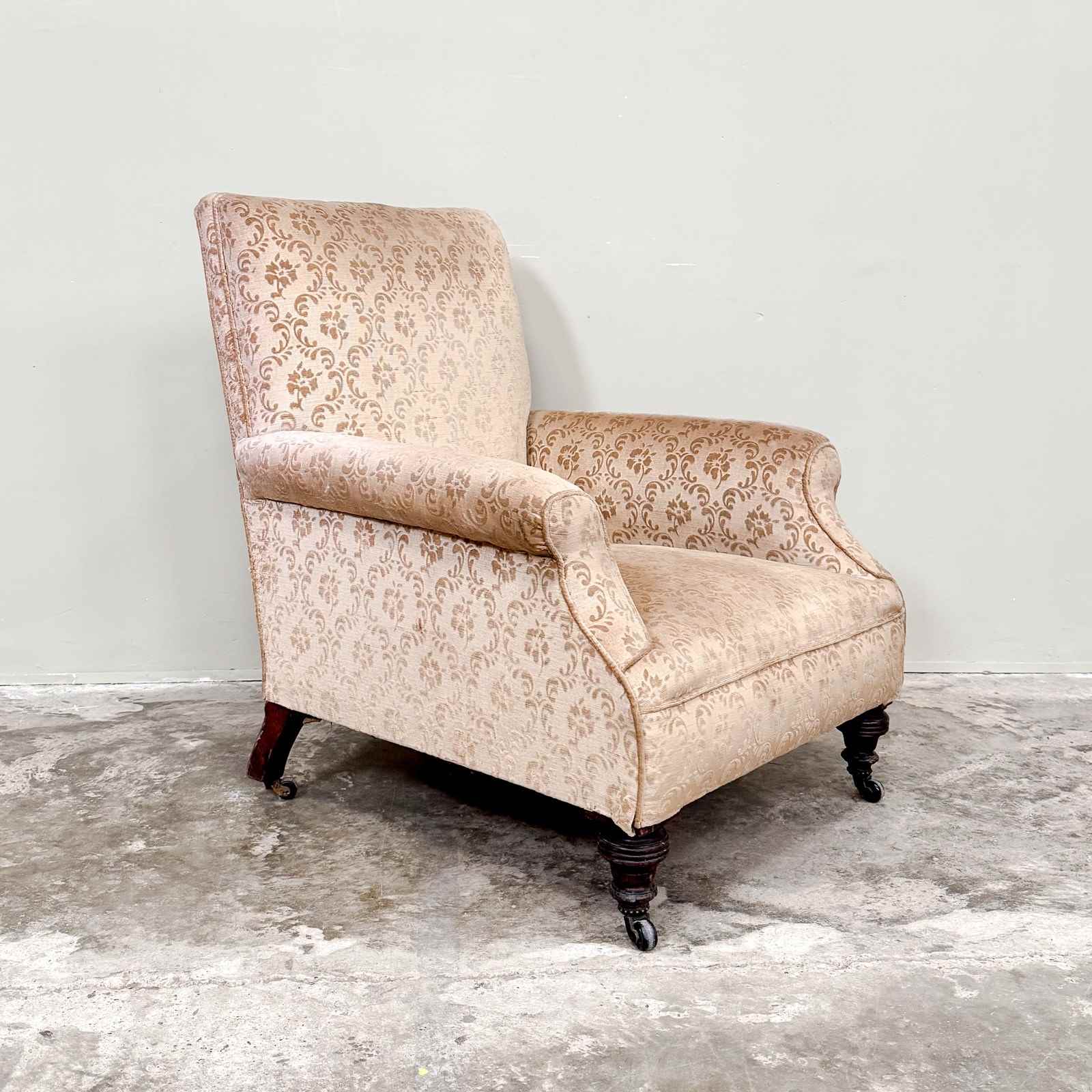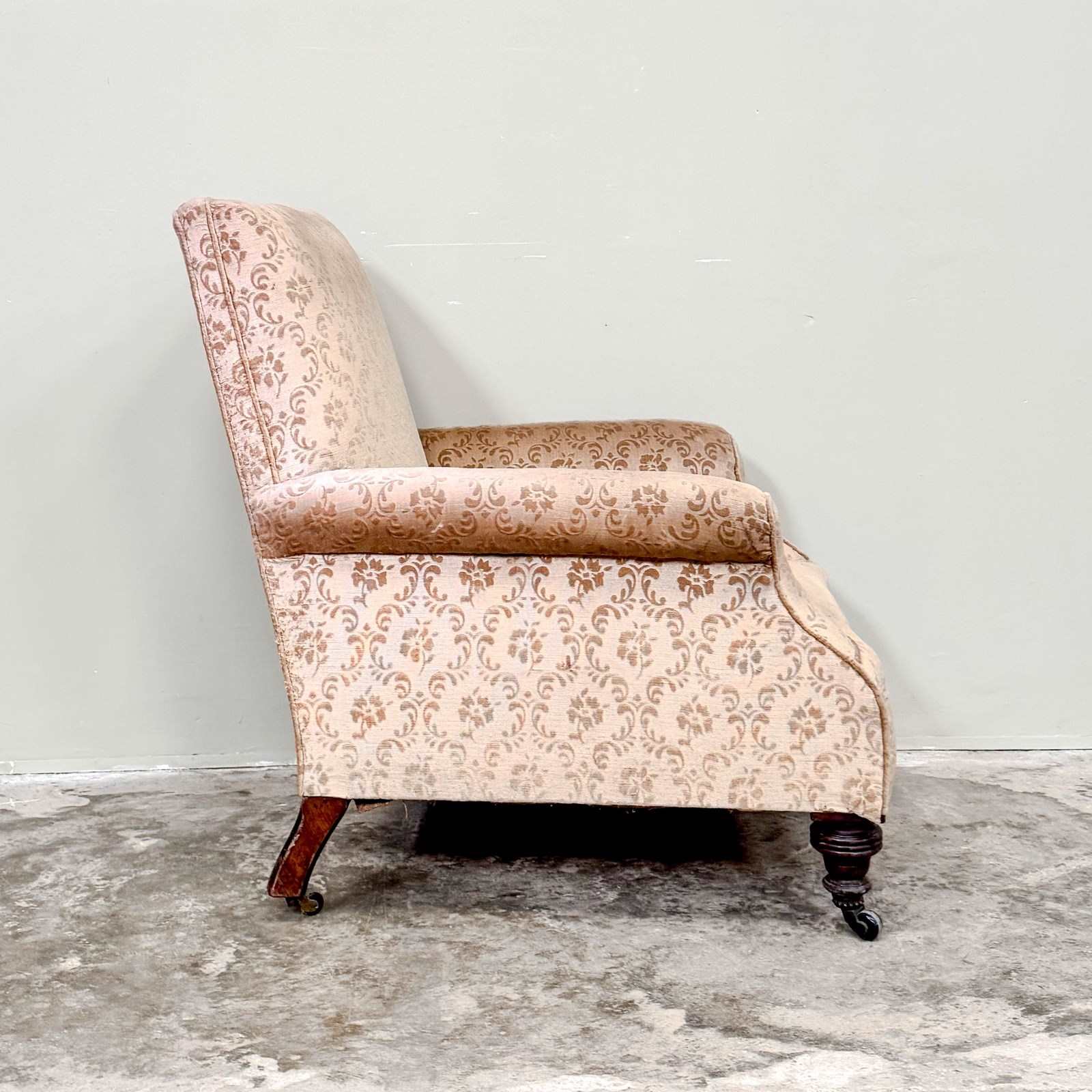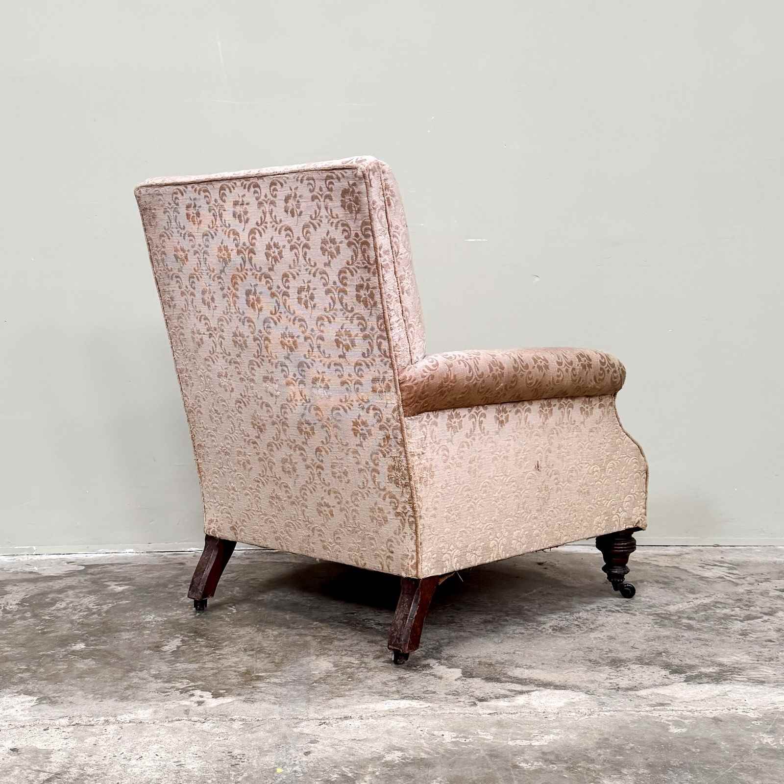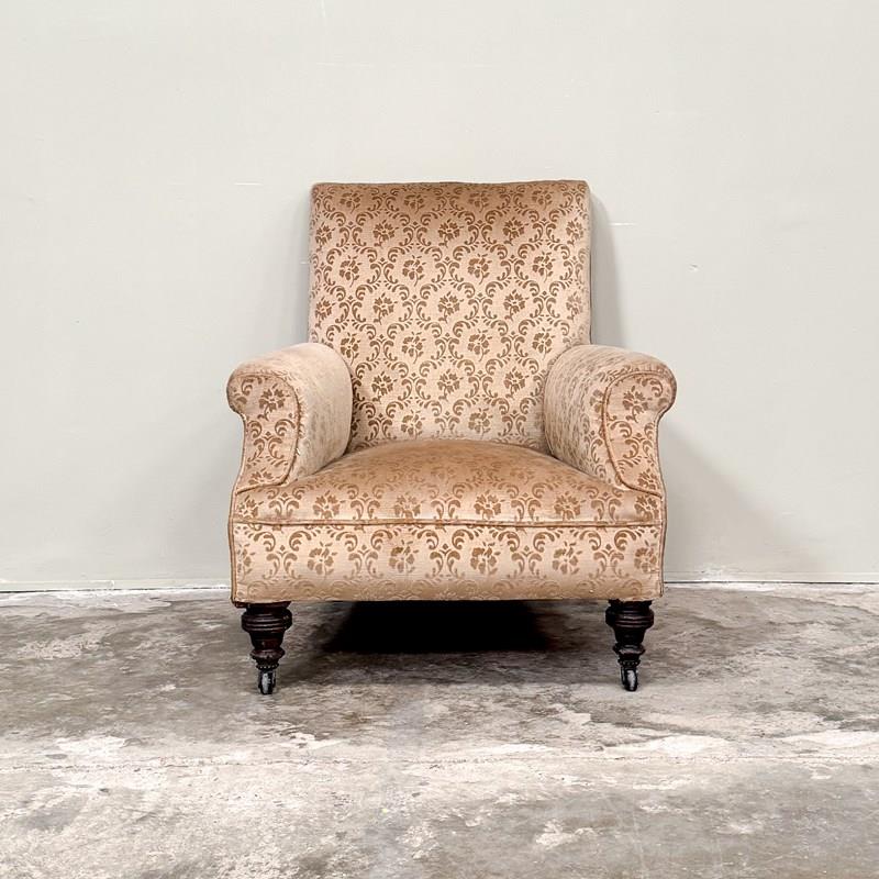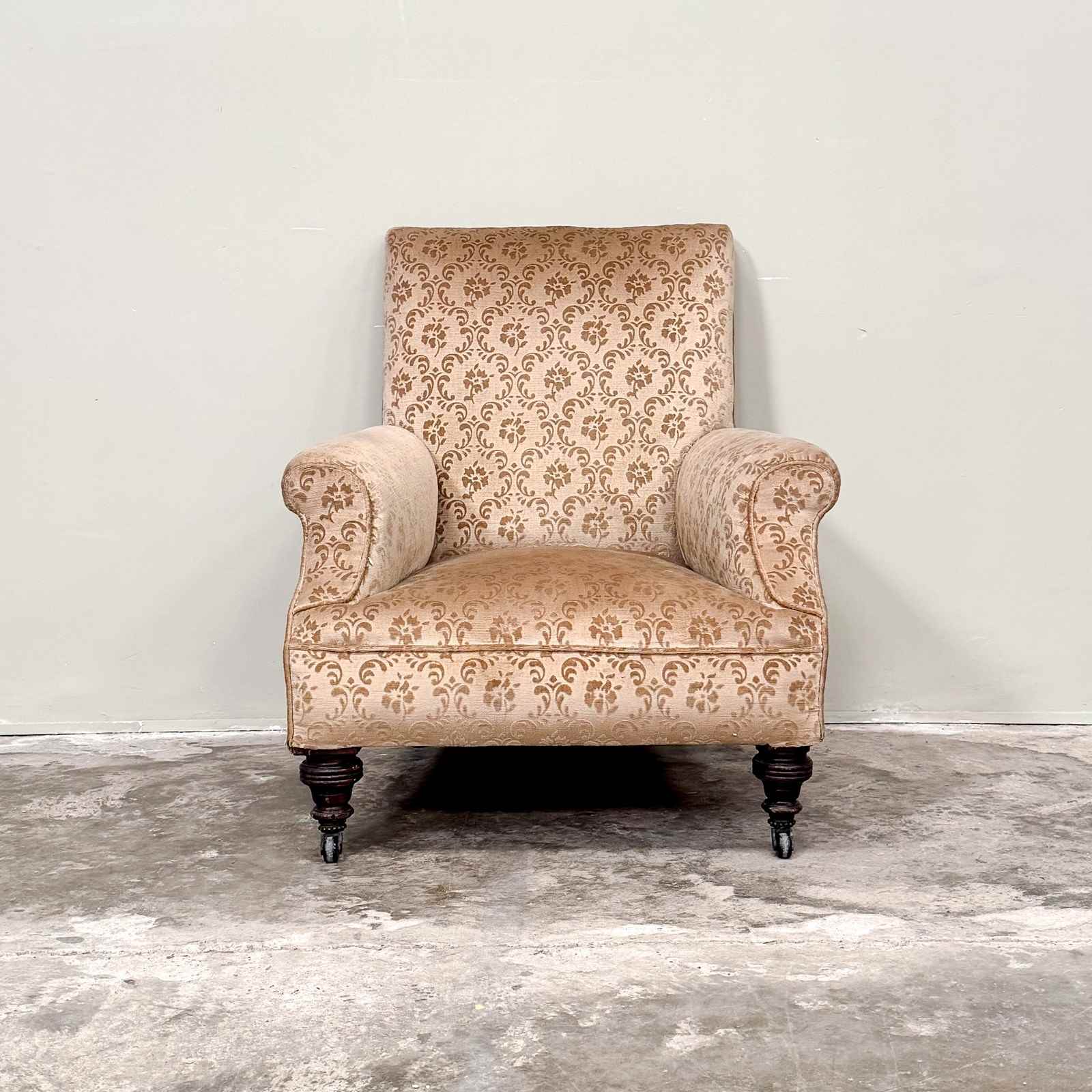 19th century deep seated English armchair. Standing on turned mahogany legs with original castors. With scroll arms and sprung seat and back.