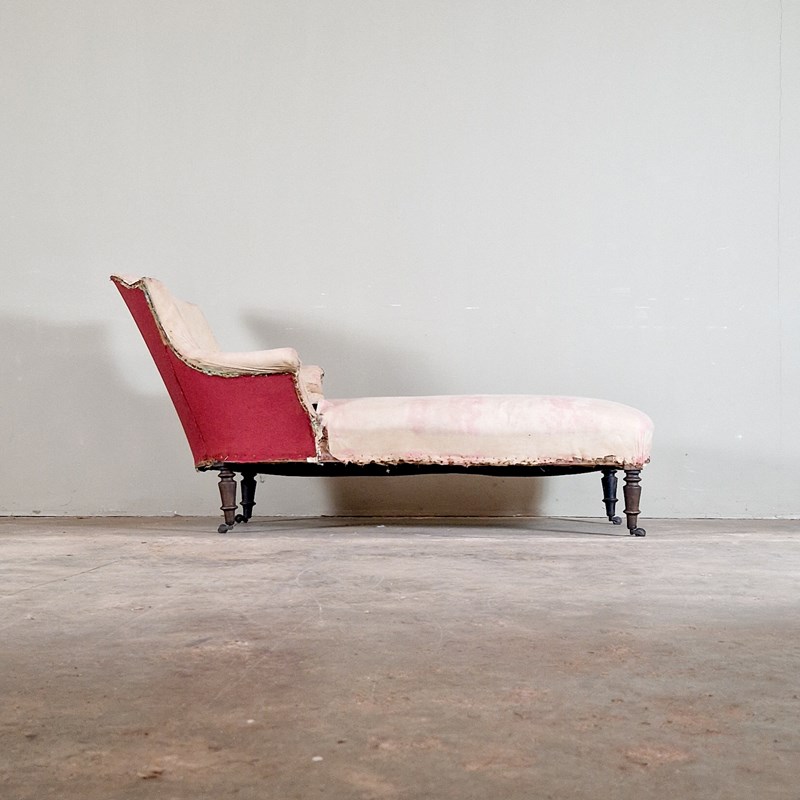A 19th century French daybed, standing on turned ebonised legs, with scroll arms, and sprung seat and back.