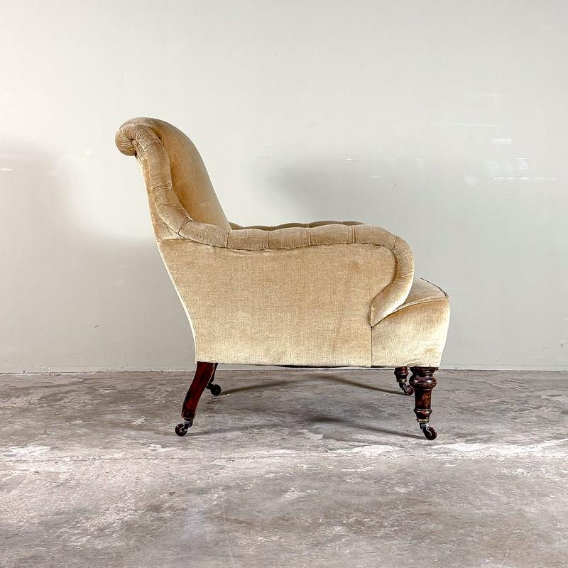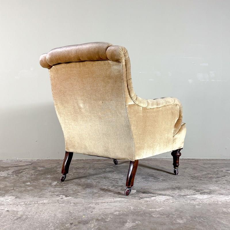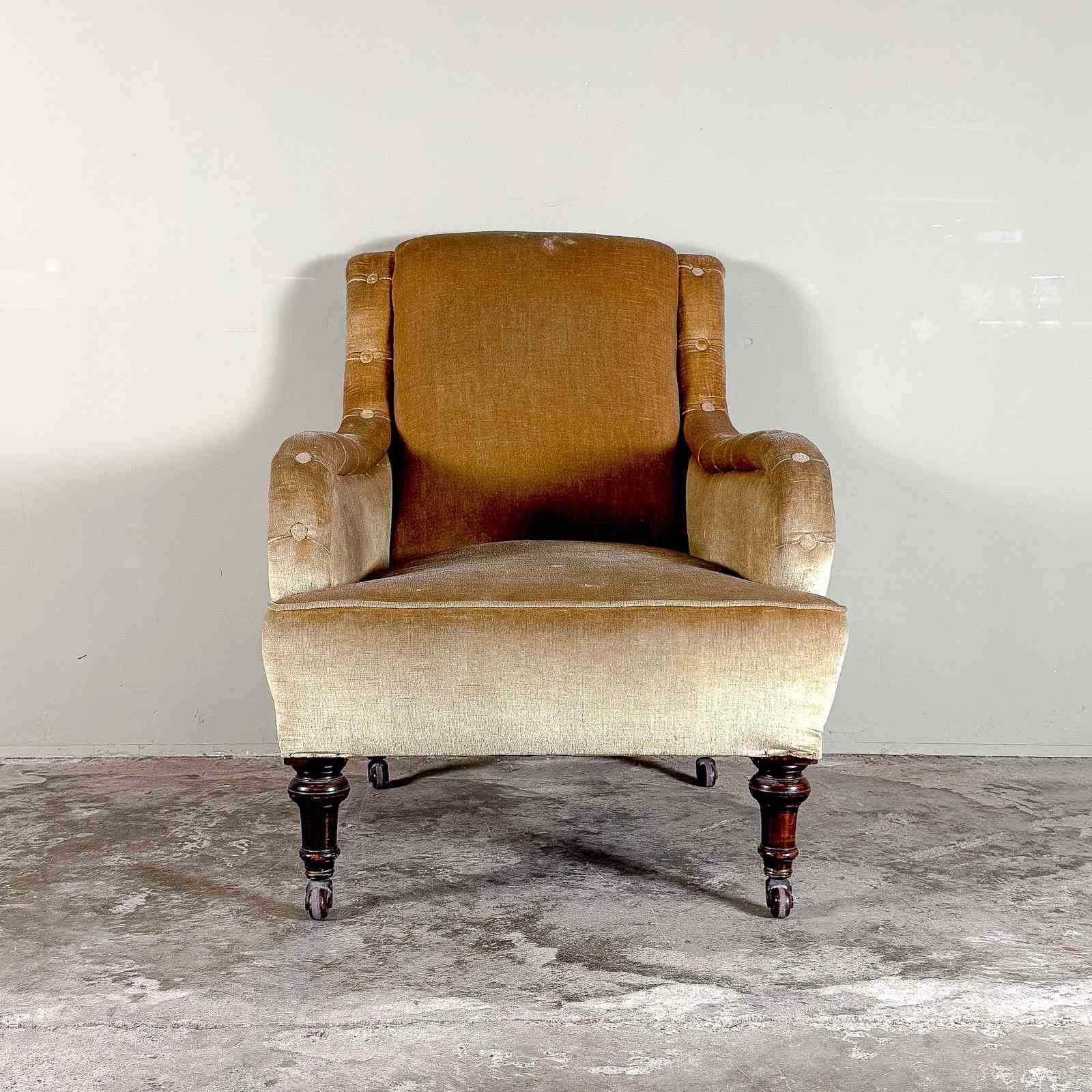 Elegant 'P' arm armchair with sweeping scroll back. Standing on turned mahogany legs and castors, with sprung back and seat. Circa 1900
