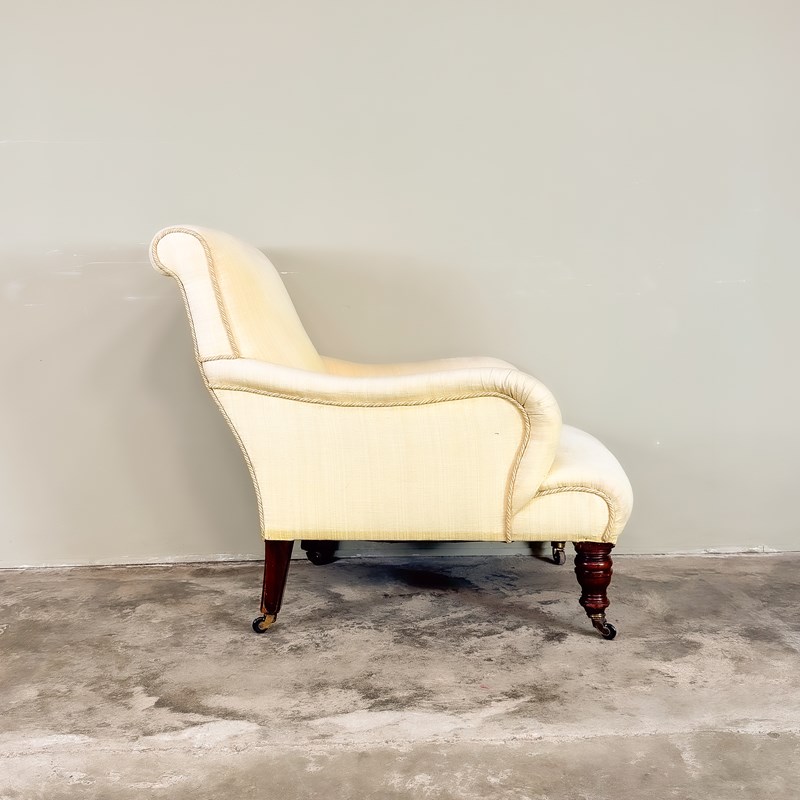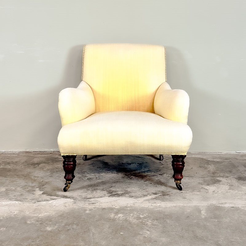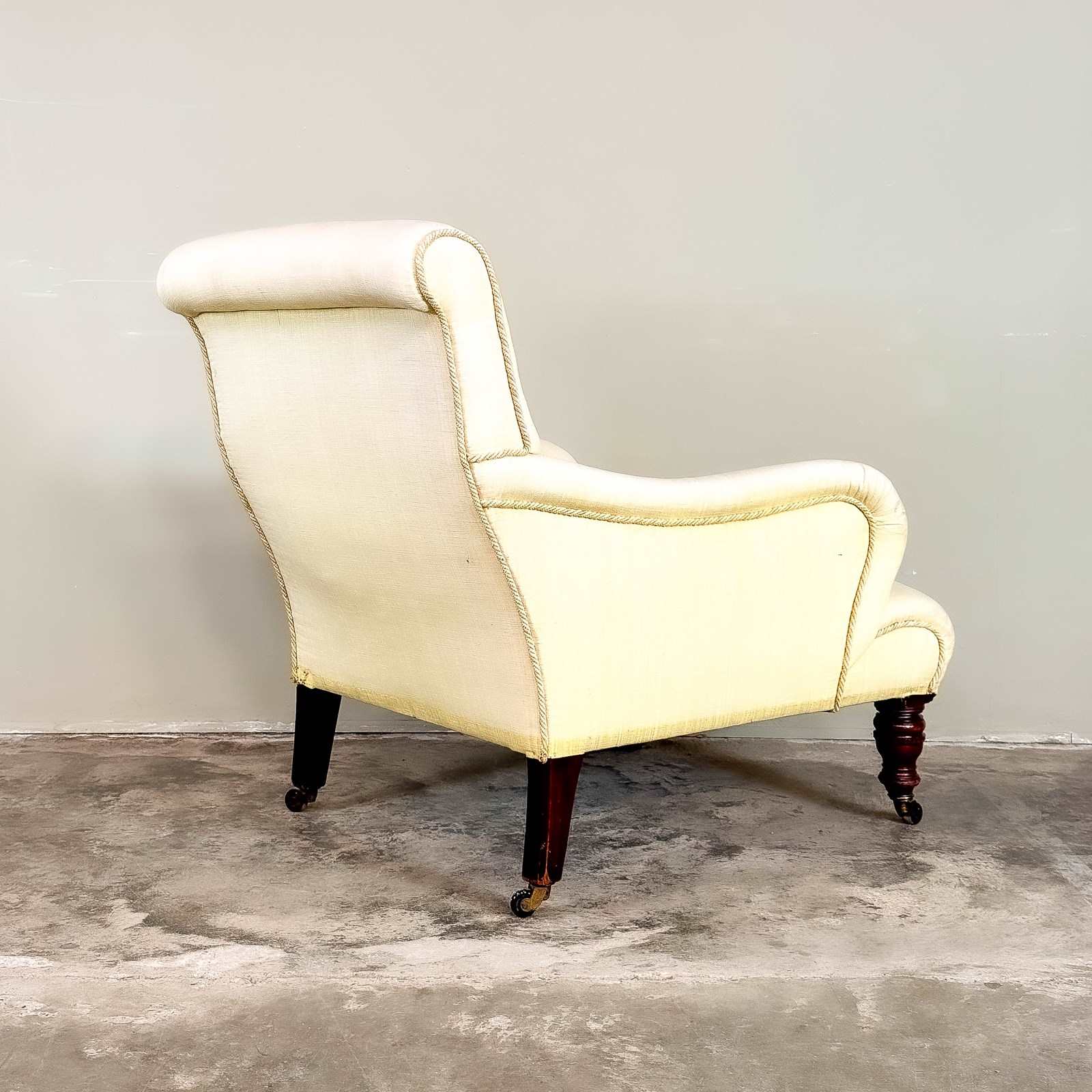 19th century English armchair, with 'P' arm. Standing on turned mahogany legs, and castors, with sprung seat and scroll to back. With nice deep seat. Circa 1890