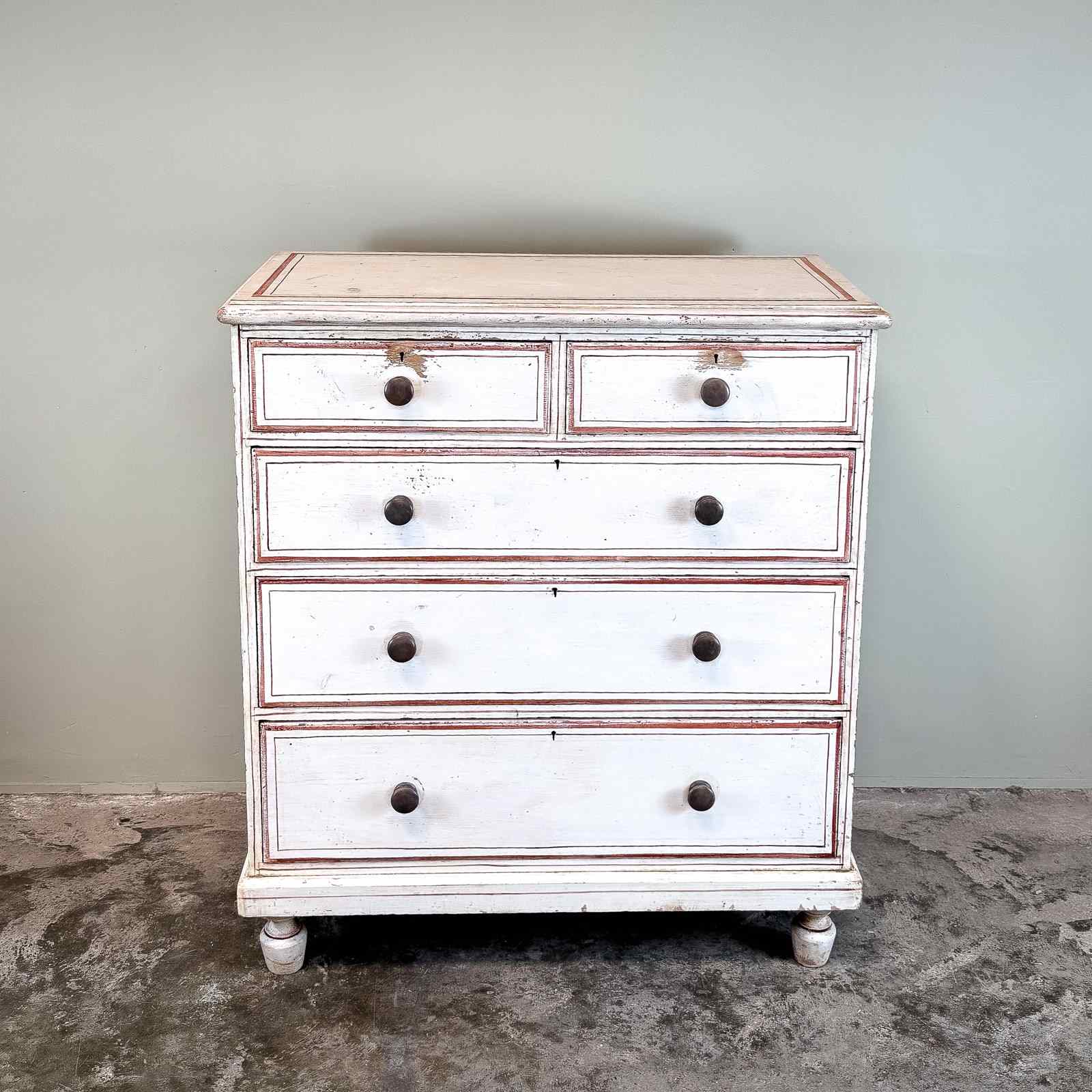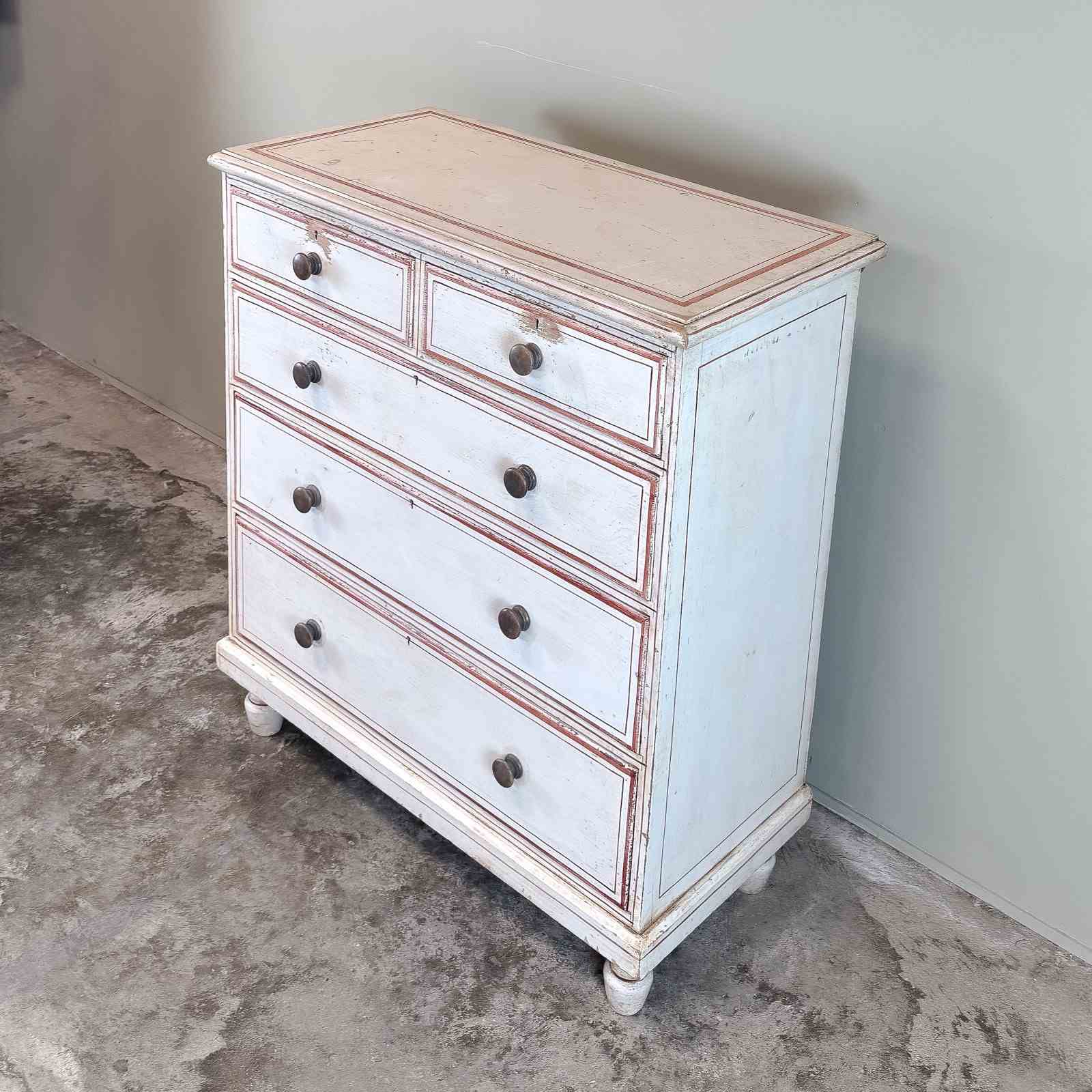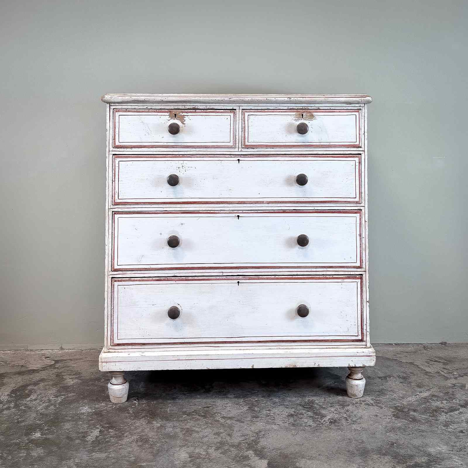 A late 19th century pine painted chest of drawers, standing on shaped feet, with 2 drawers over 3 long drawers. With turned wooden knobs. Circa 1880