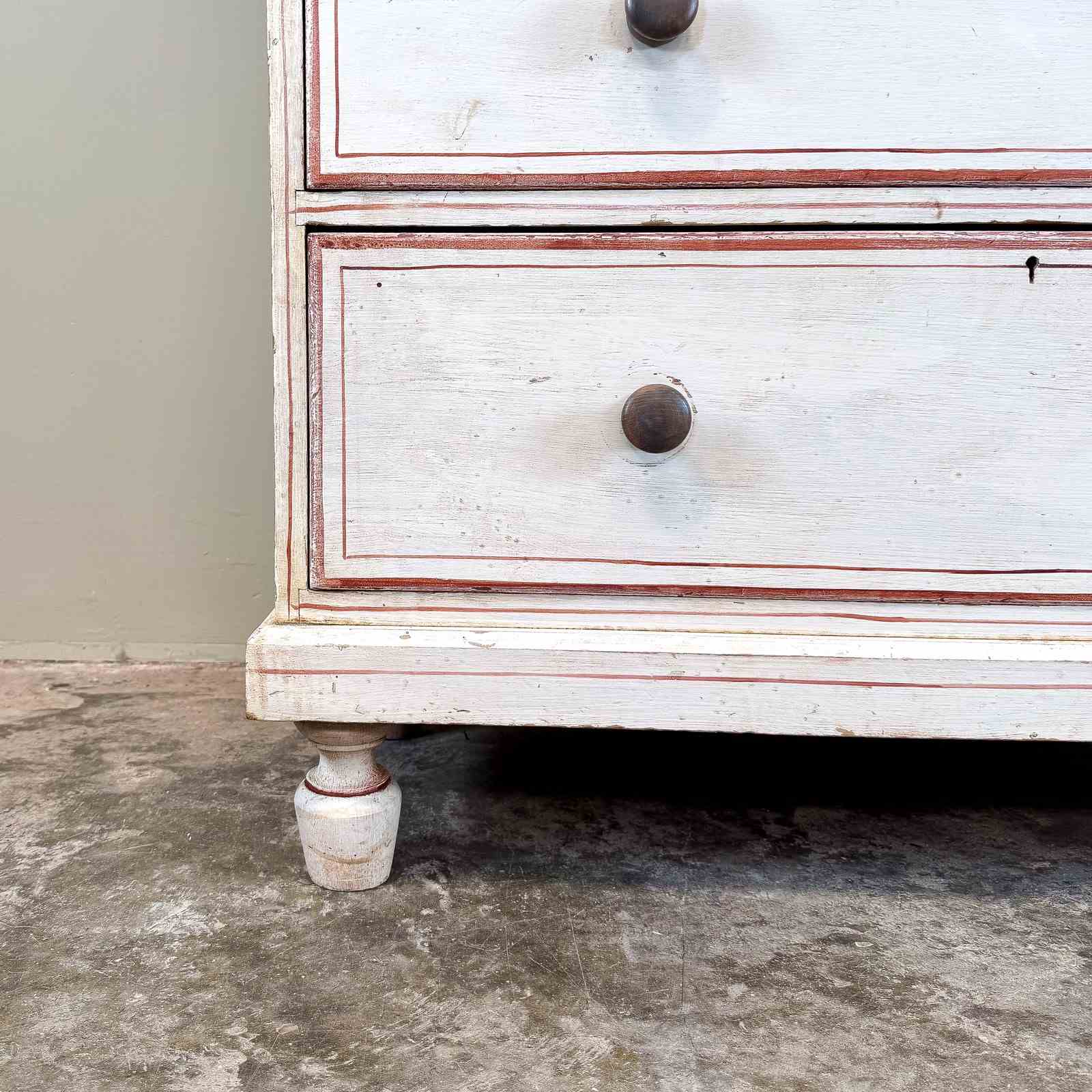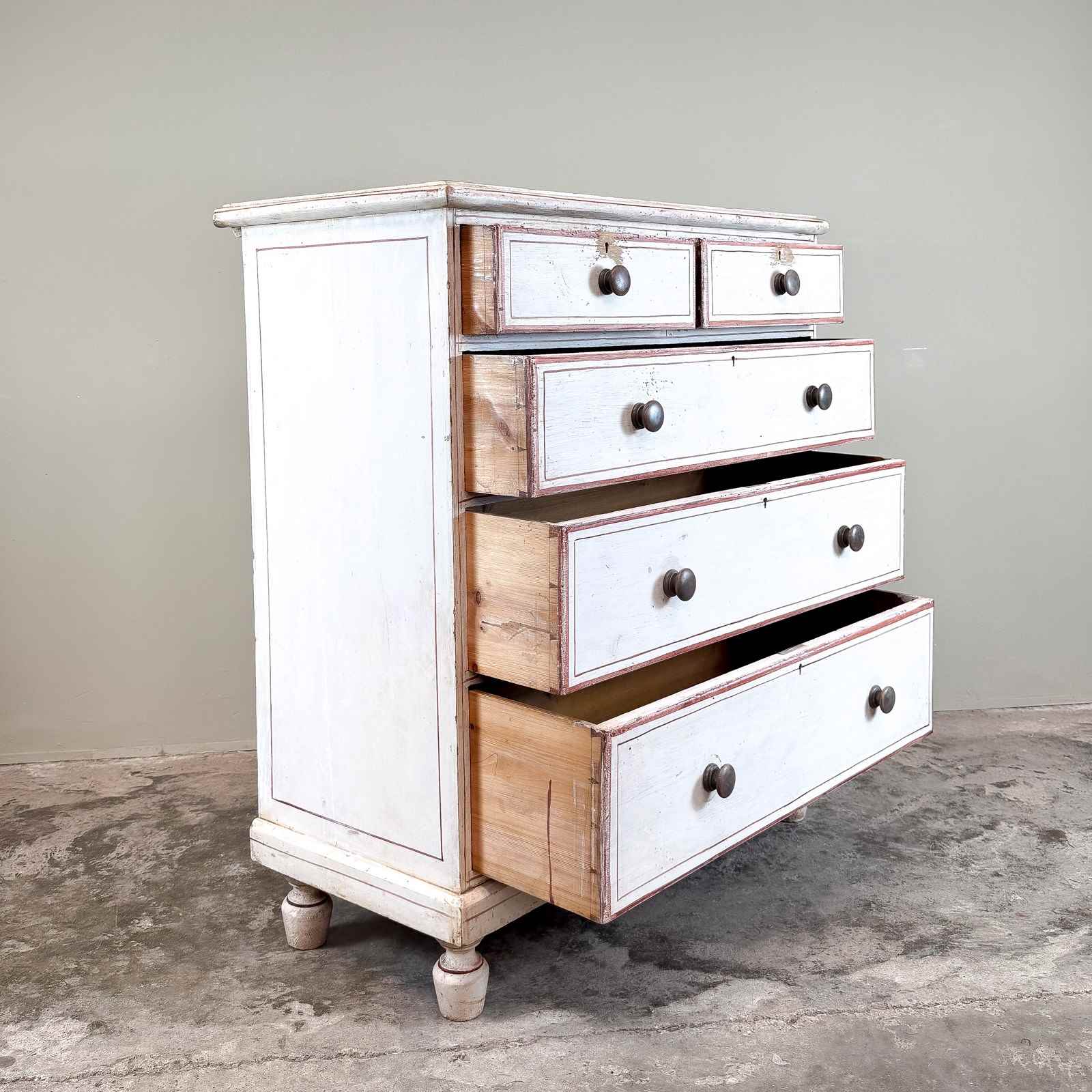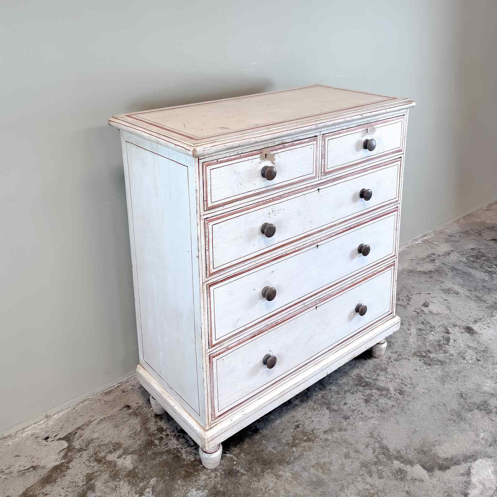 A late 19th century pine painted chest of drawers, standing on shaped feet, with 2 drawers over 3 long drawers. With turned wooden knobs. Circa 1880
