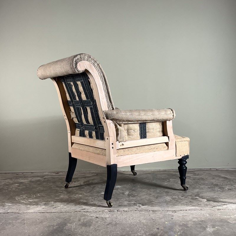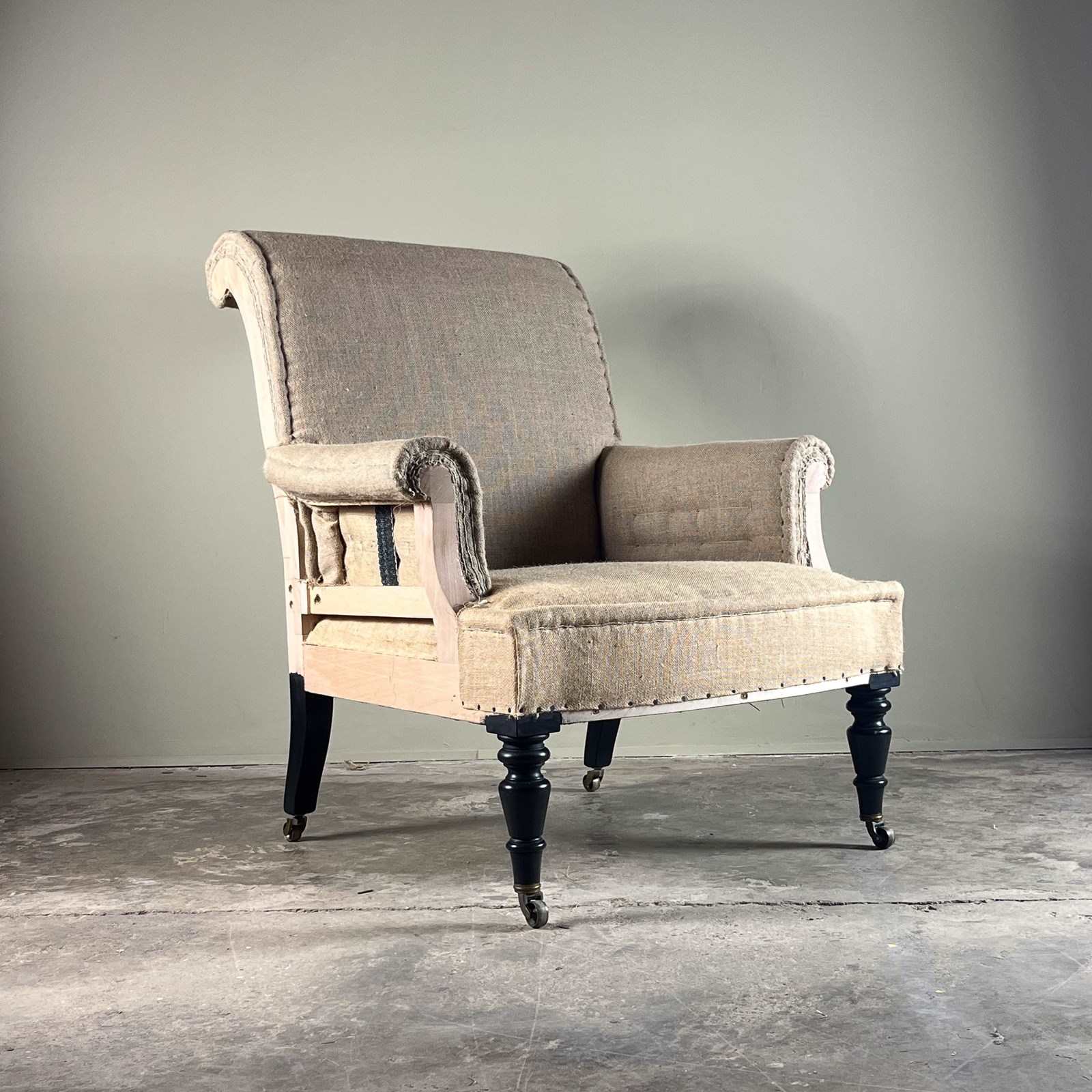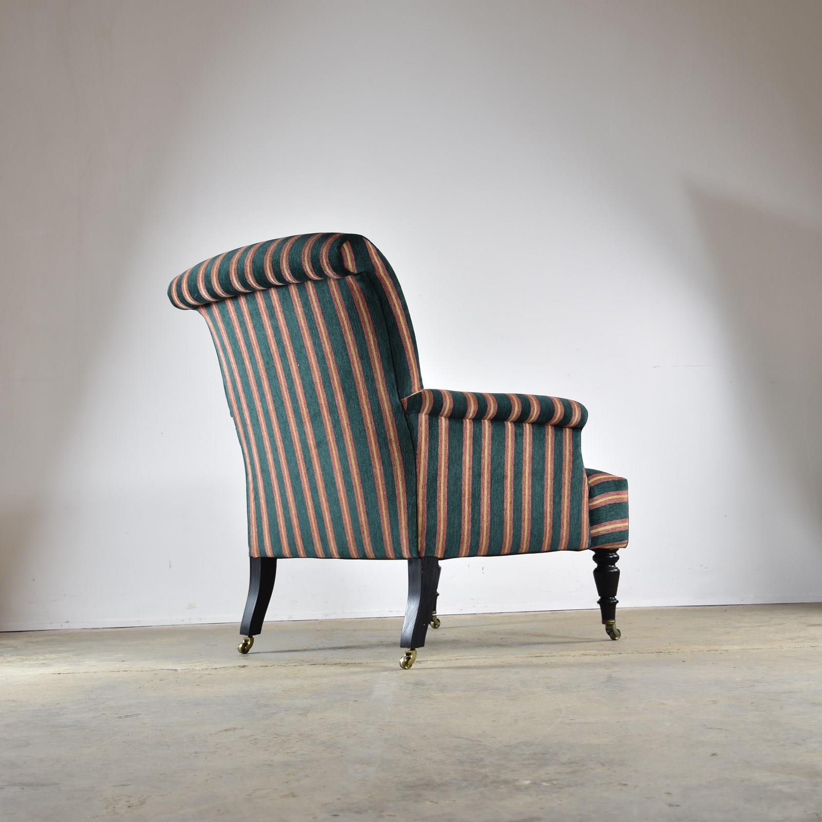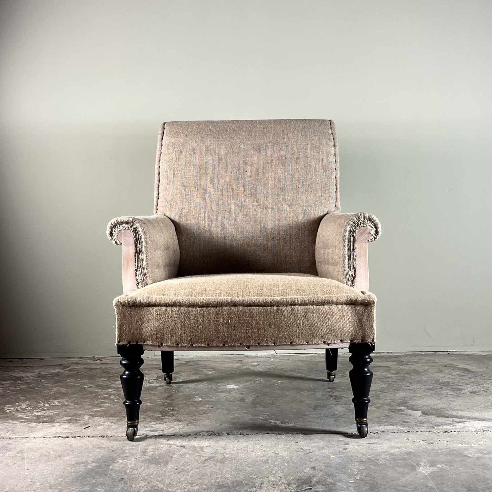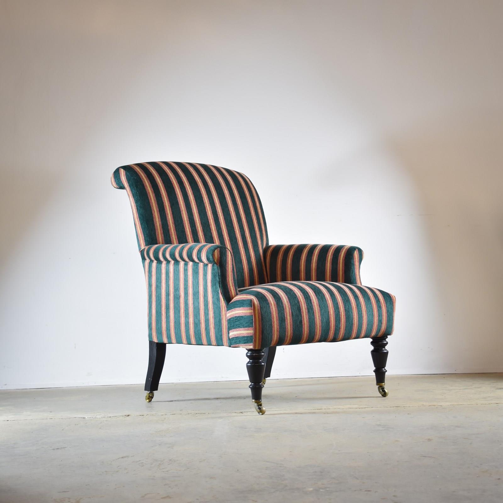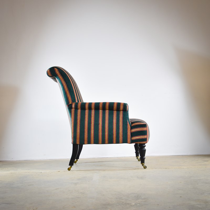 French Fauteuil, made by us, with sprung seat, scroll arms, standing on turned ebonised legs. (leg colour optional)