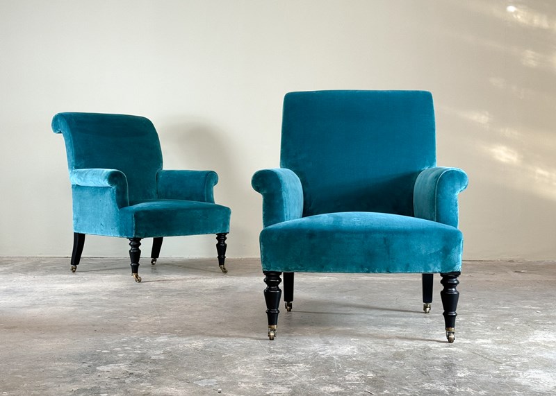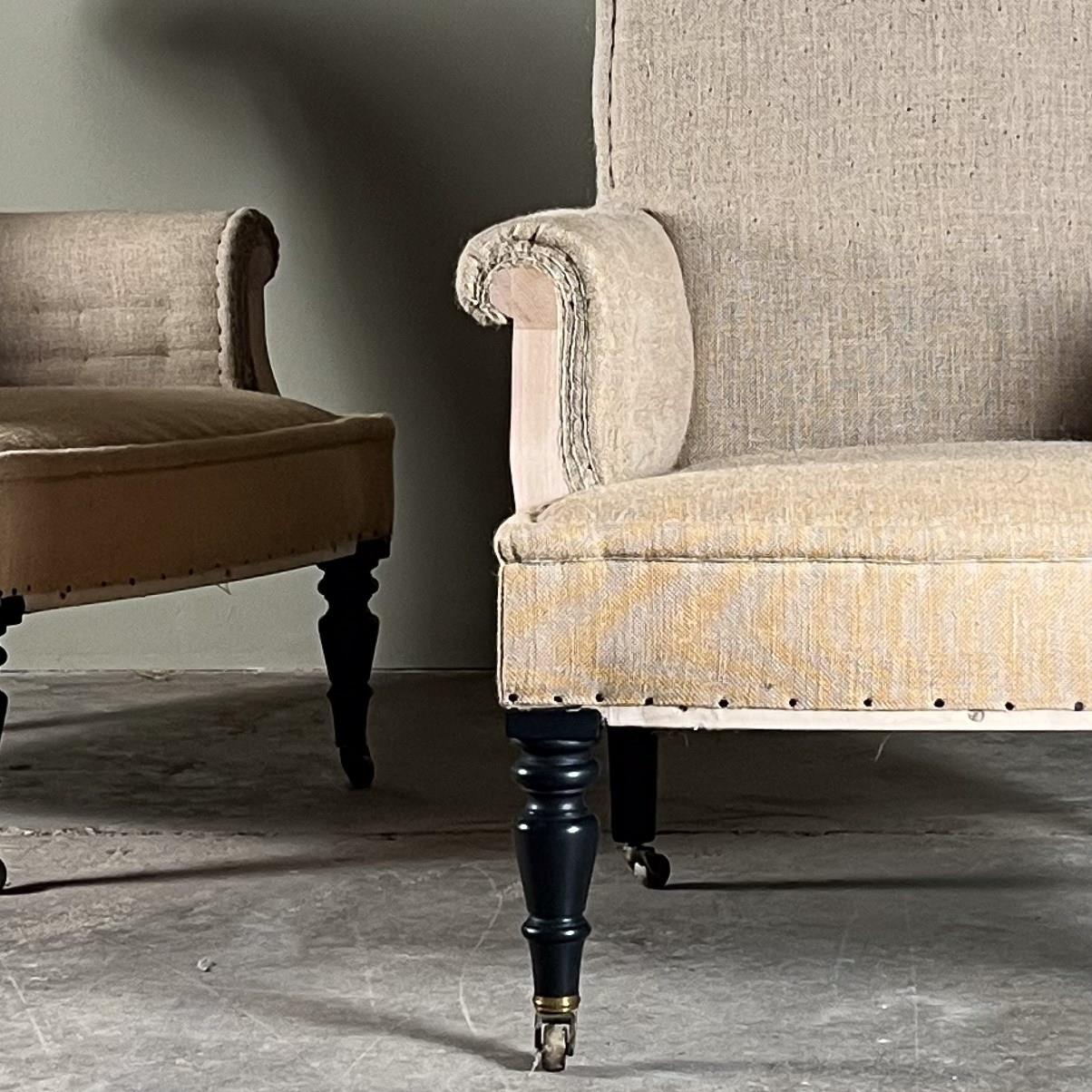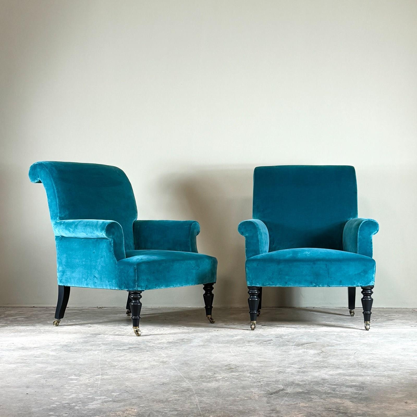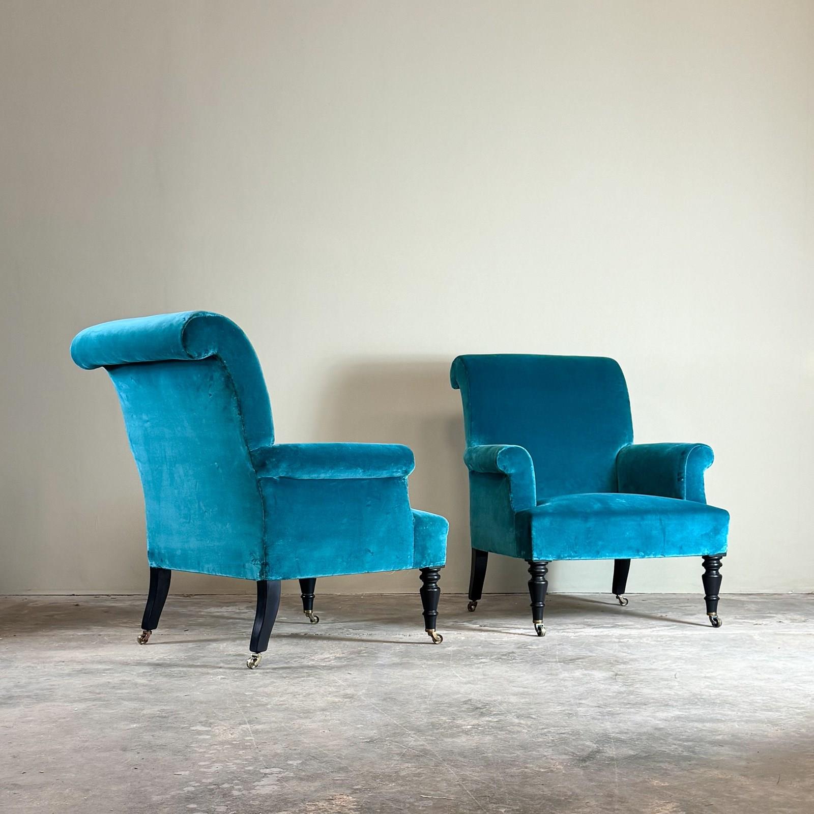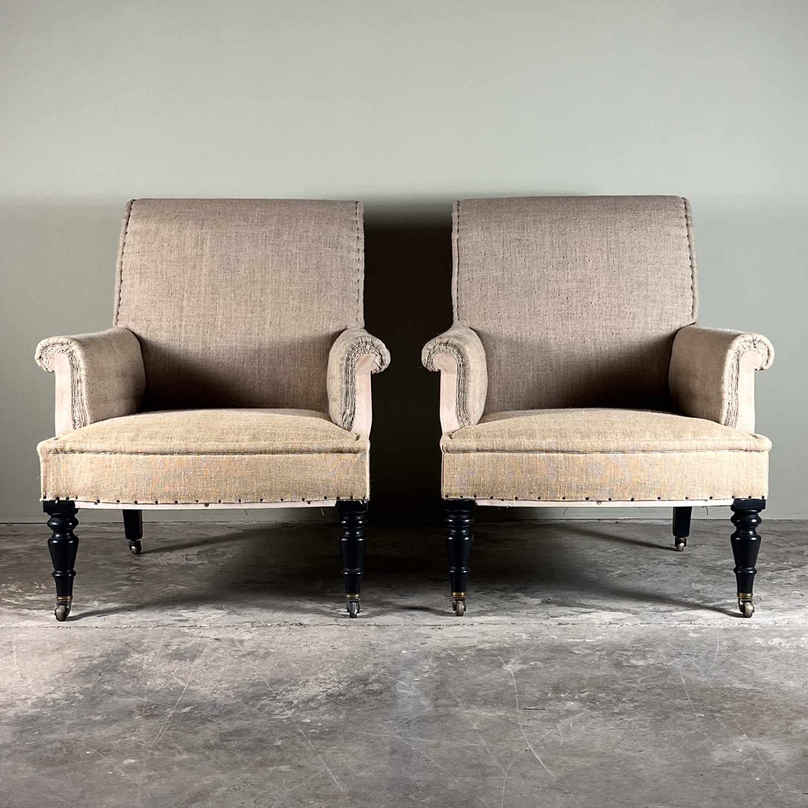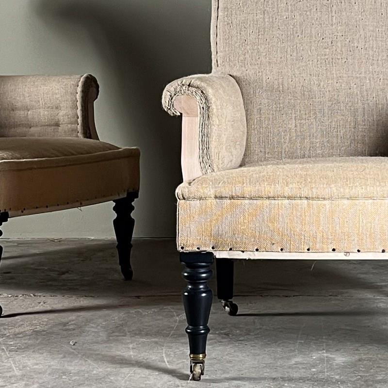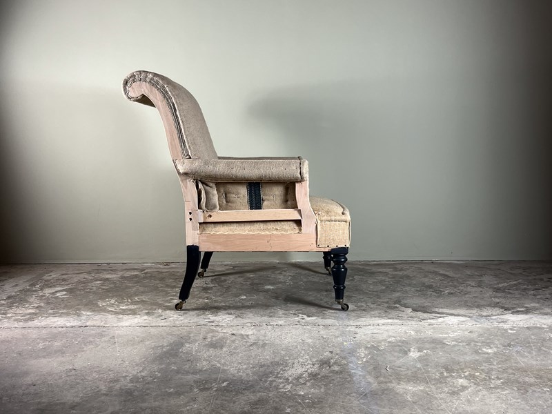 French Fauteuil, made by us, with sprung seat, scroll arms, standing on turned ebonised legs. (leg colour optional)