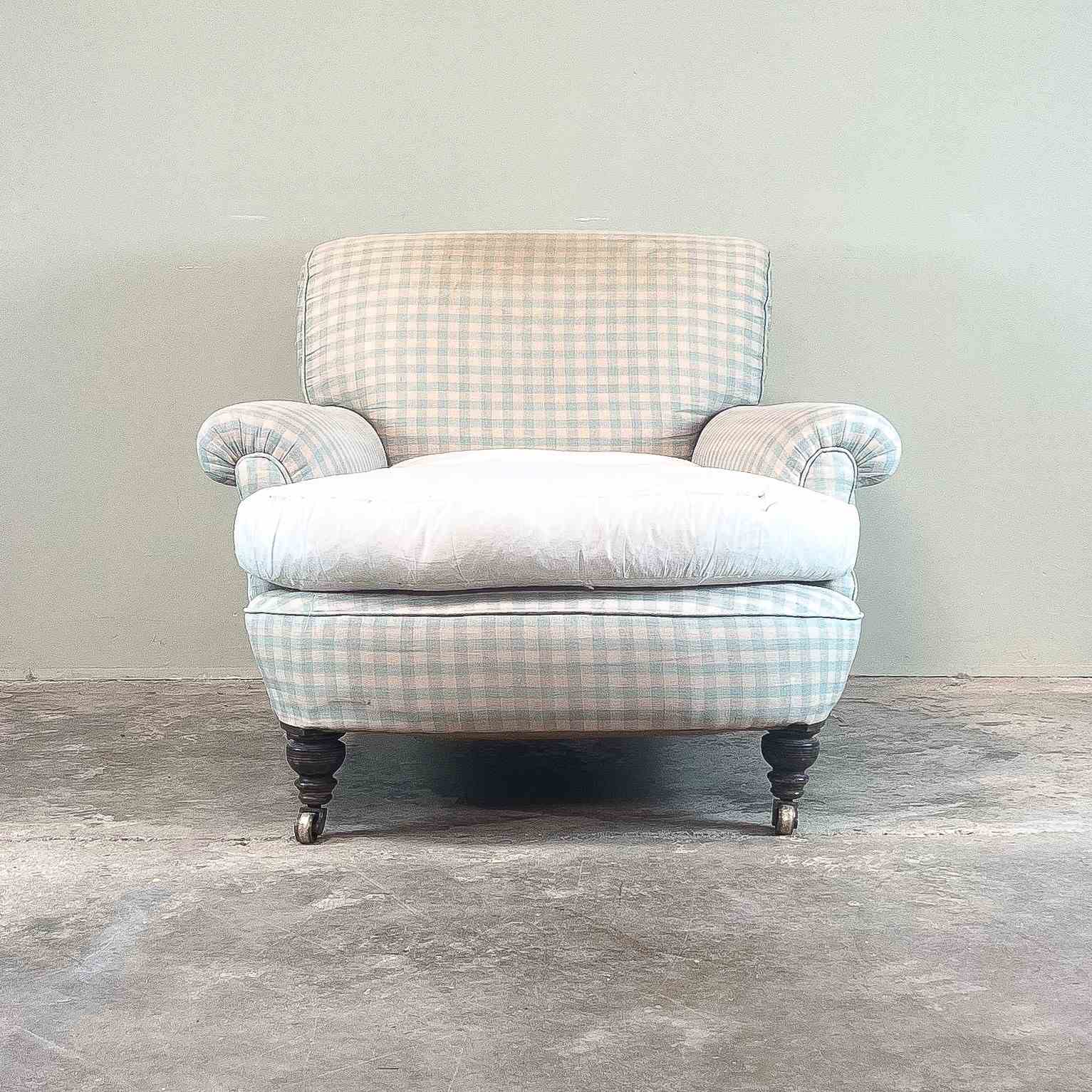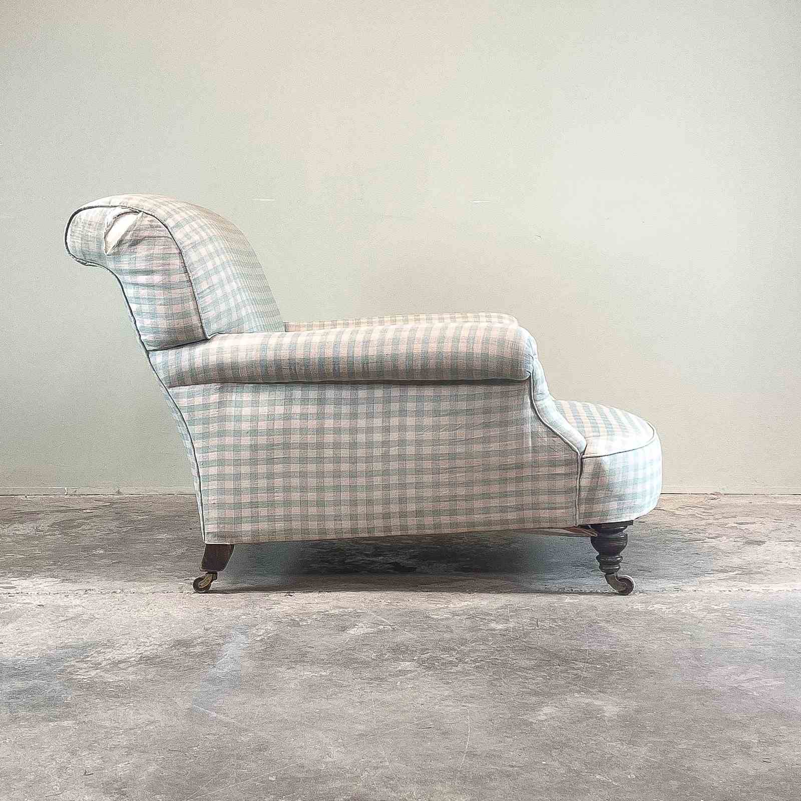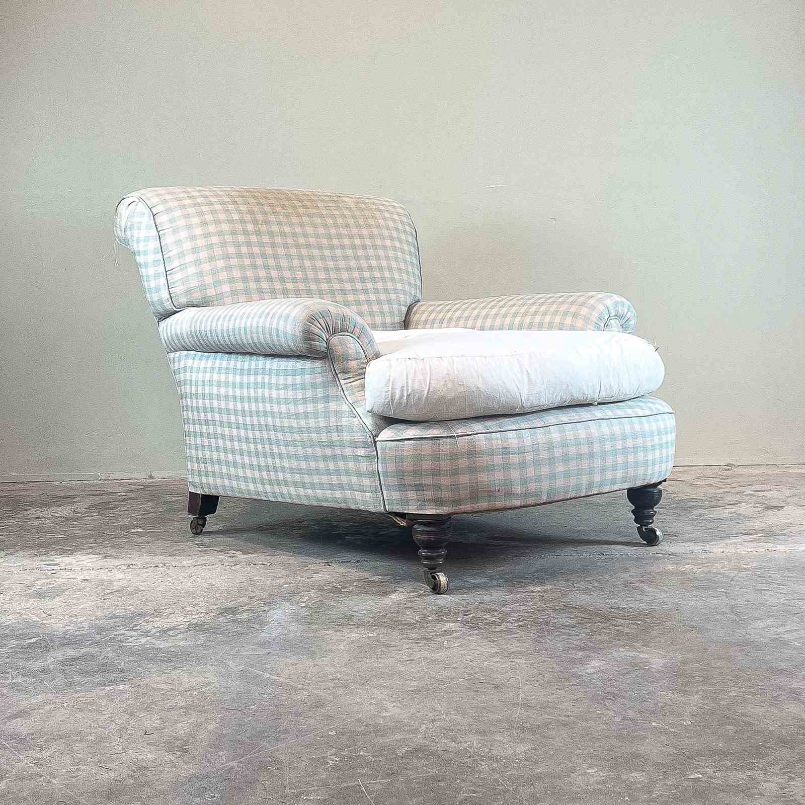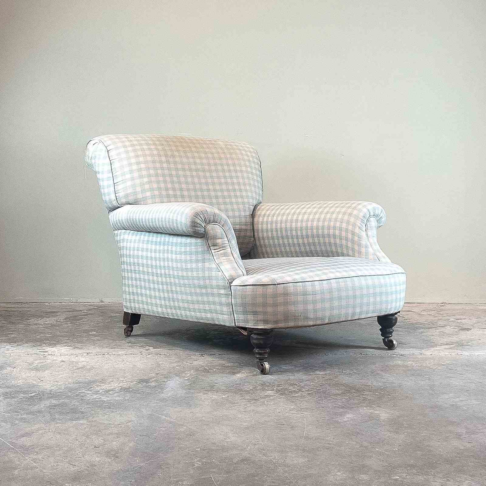 Extremely comfortable deep seated armchair, with sprung seat and surge de duvet back. With scroll arms and back and curved front rail. Standing on walnut legs and castors. Circa 1880 - 1900