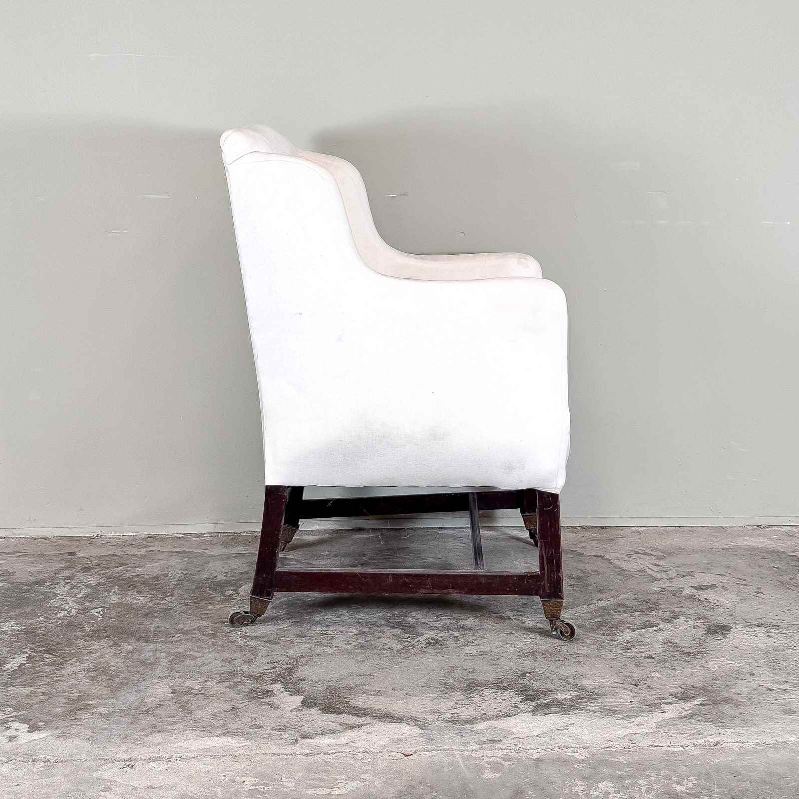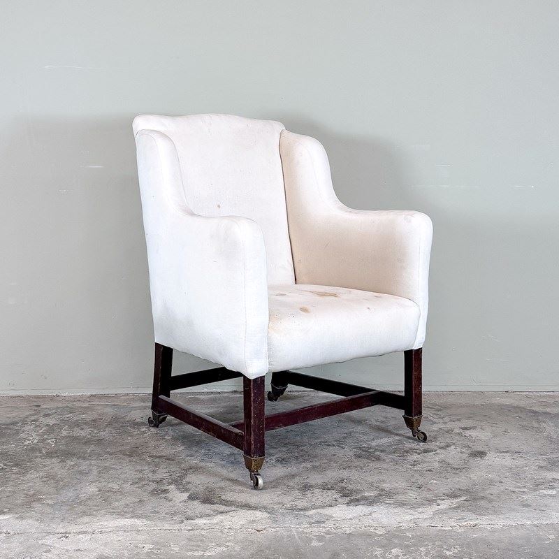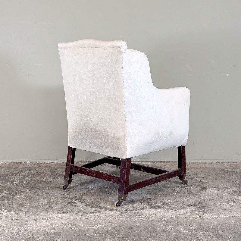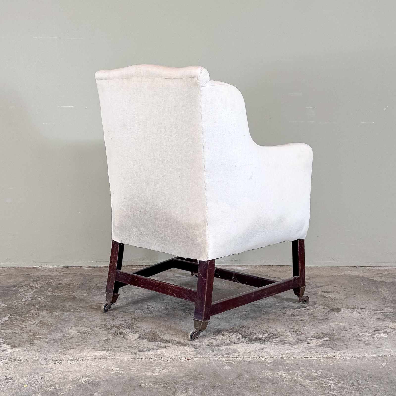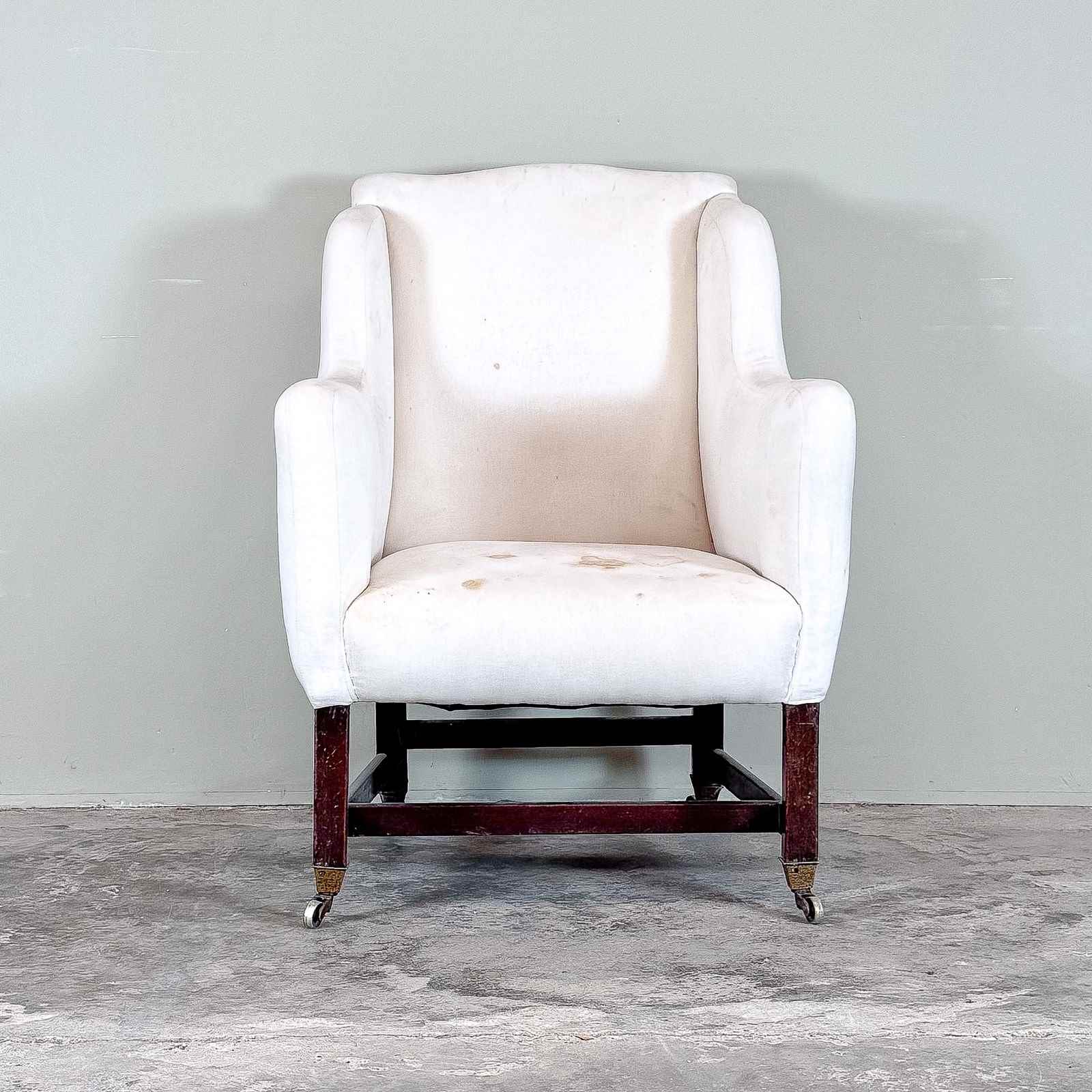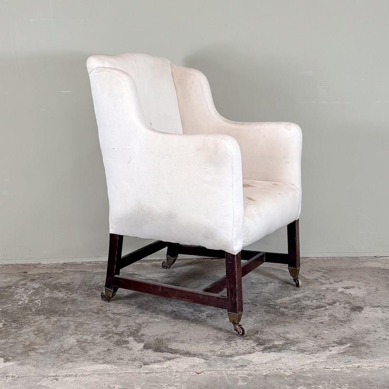 Early 19th century English library chair, standing on square mahogany chamfered legs, united by an H stretcher. With square brass cup castors. Circa 1800
