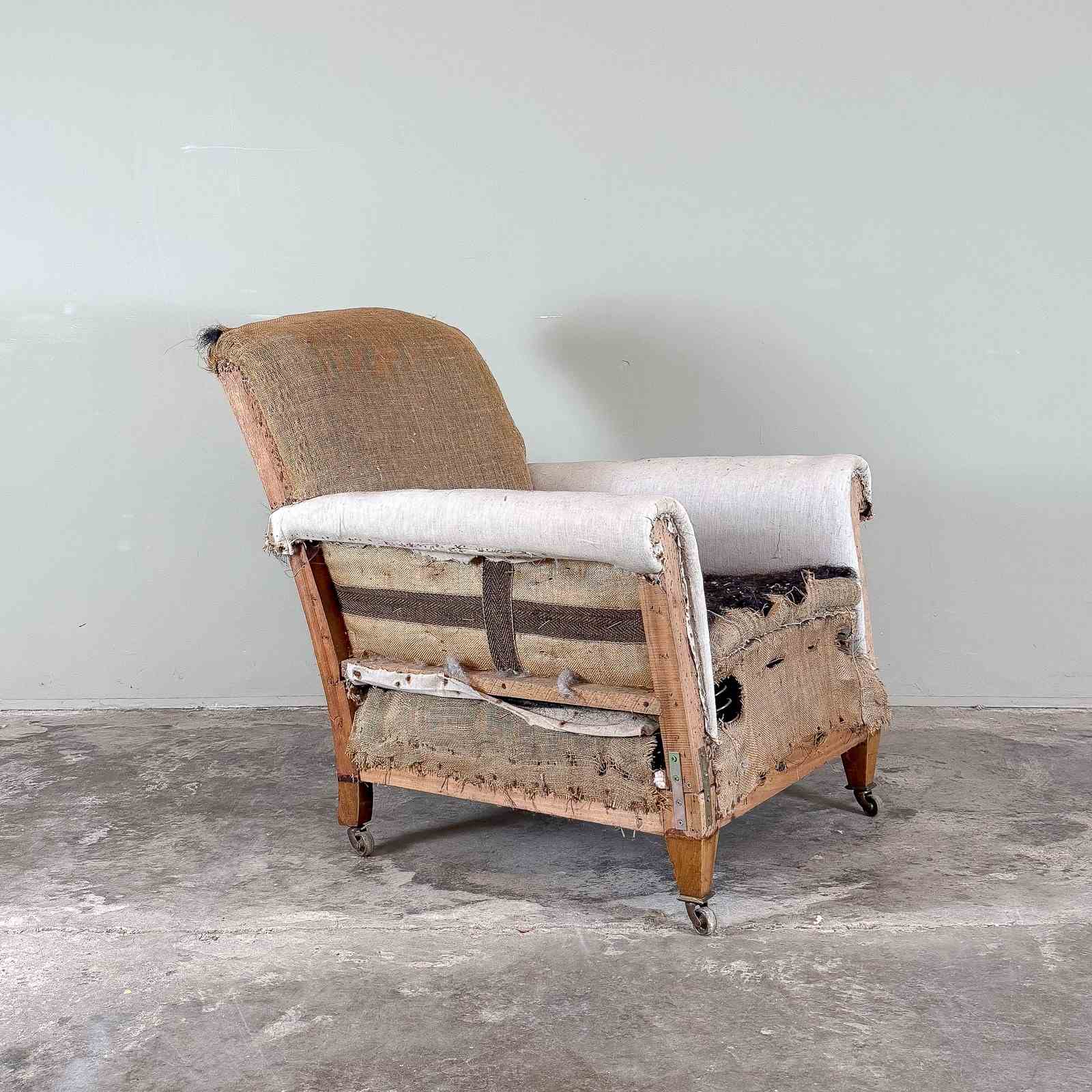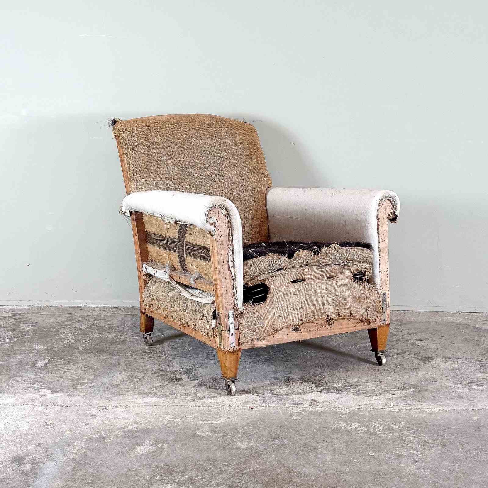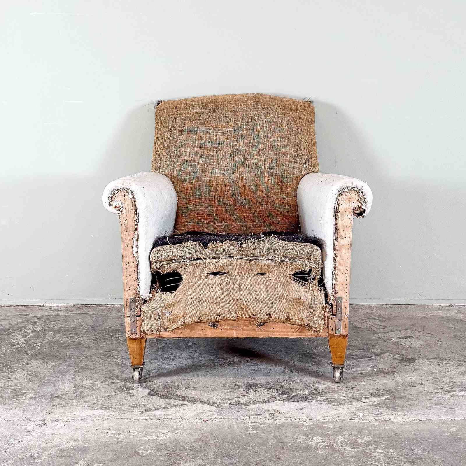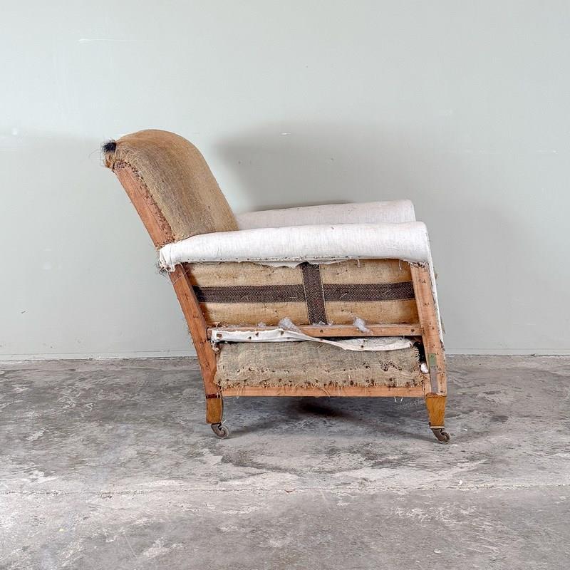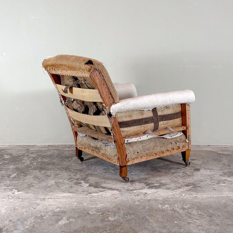 Edwardian armchairs with sprung seat and back, scroll arms and back. Standing on square taper legs and brass castors. Circa 1910