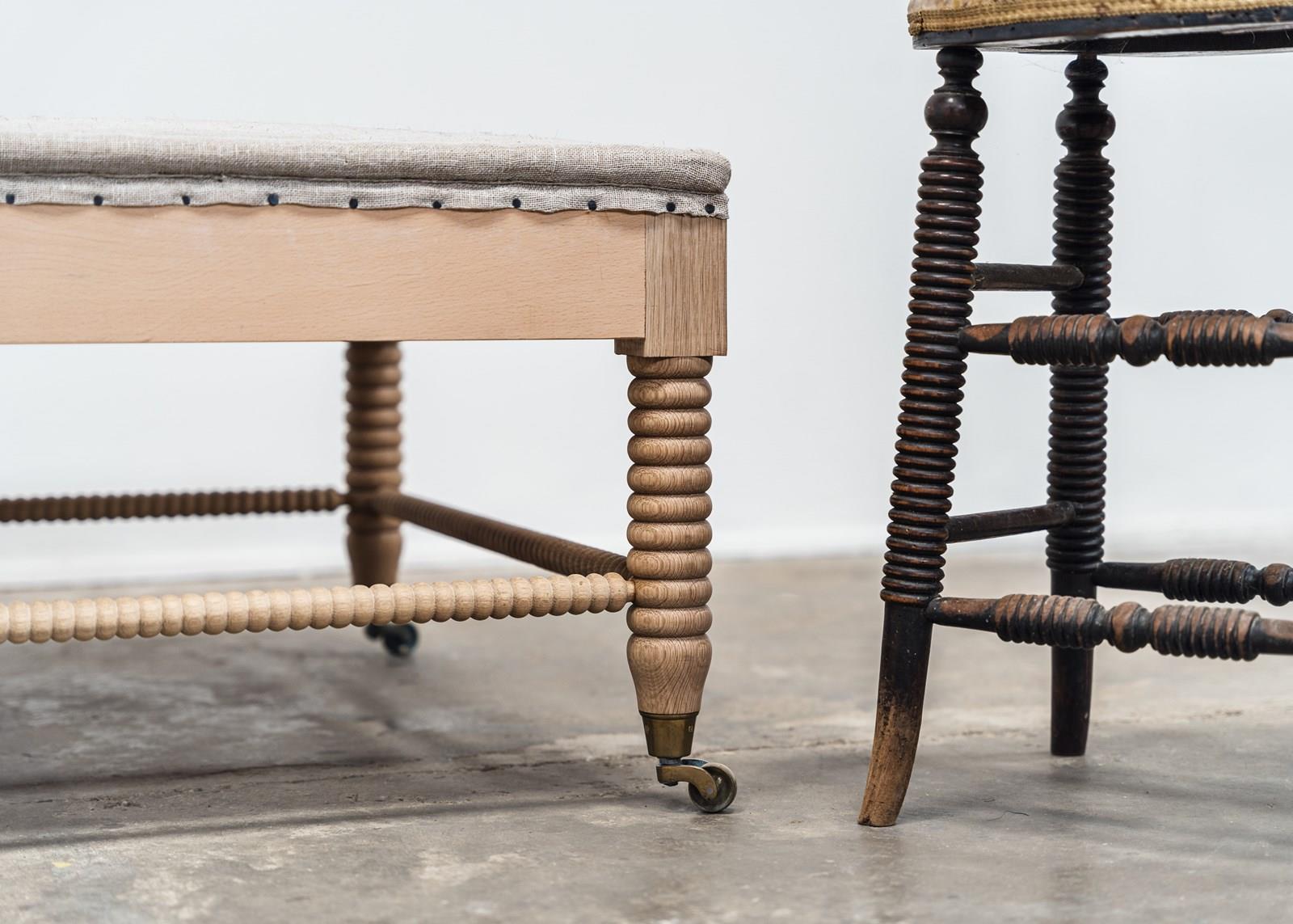 Our footstool No 1 in oak, with hard turned stacked bobbin legs and stretchers, standing on brass cup castors. The inspiration for this footstool was taken from a tightly turned bobbin Regency stool, which Claire has hung onto for years. This has fast become one of our favourites.