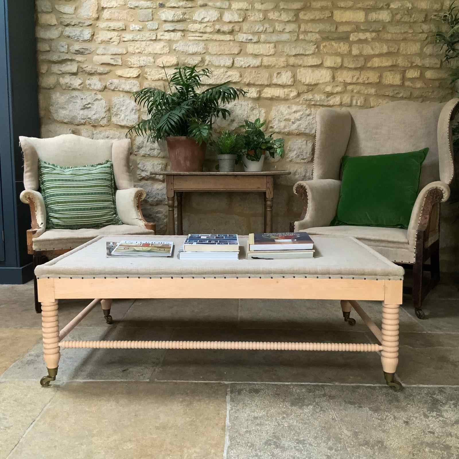 As with most of our footstools they can be made to any size you would like with any leg to suit your requirements. Most of our footstools are finished in either hessian or scrim, showing the hand stitching and finished with tacks. This gives the option of showing the craftsmanship and leaving as they are. Or alternatively a top cover can be added, and we are more than happy to help with the upholstery detailing.