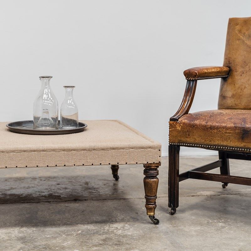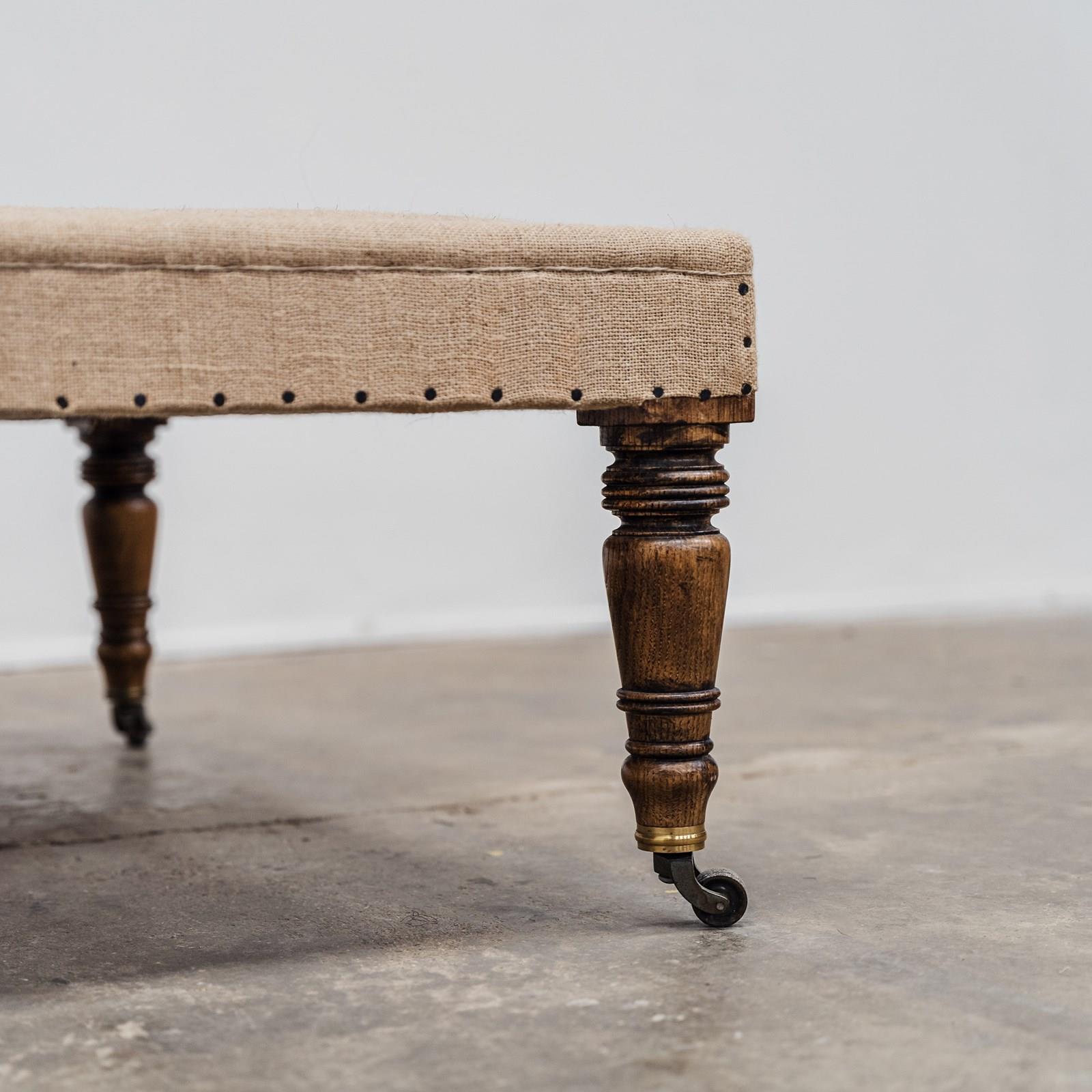Our best seller, this traditional footstool has a generous turned oak leg, standing on brass castors. The legs can also be a light oak. Traditionally upholstered with horse hair and hessian, and tacked off round the frame.