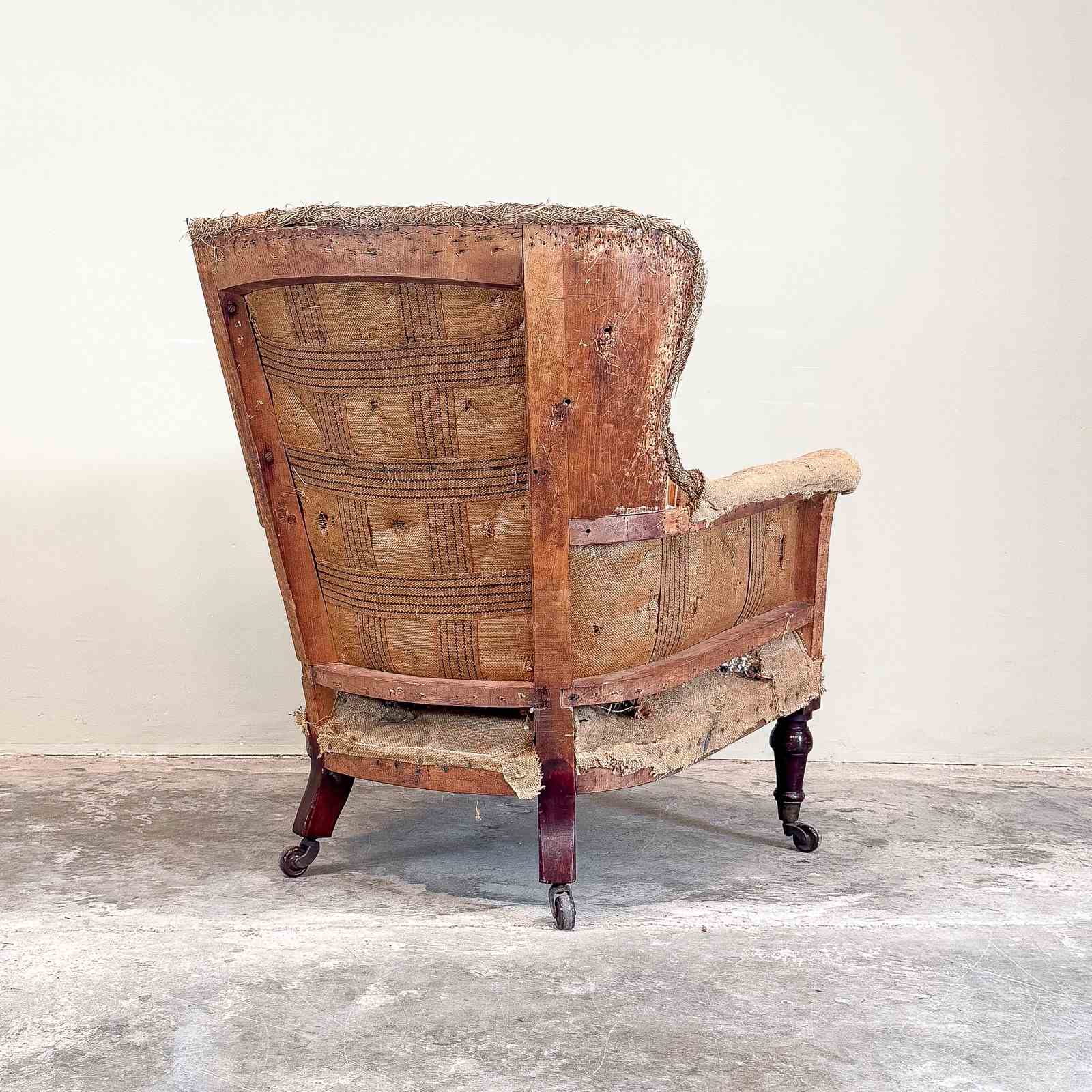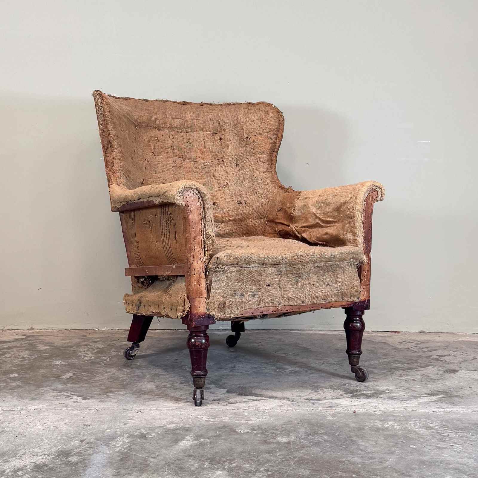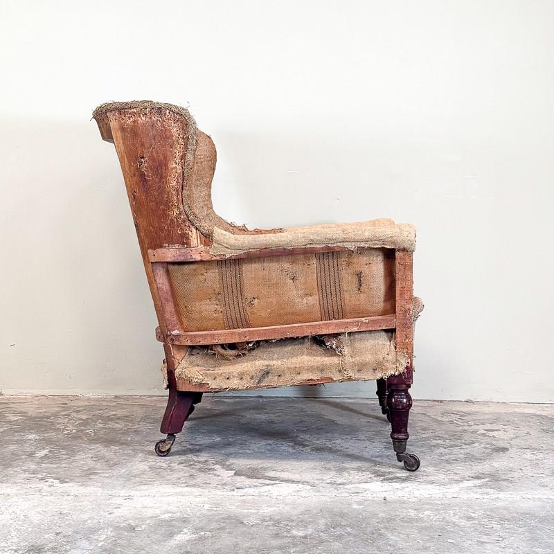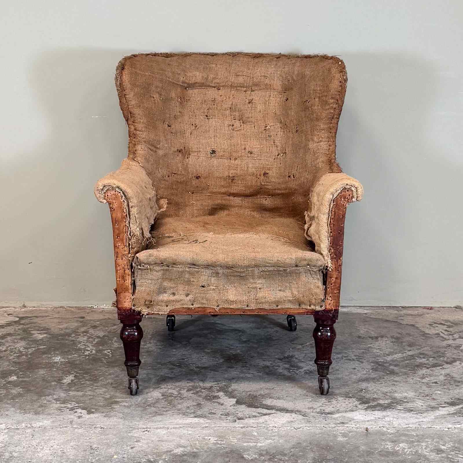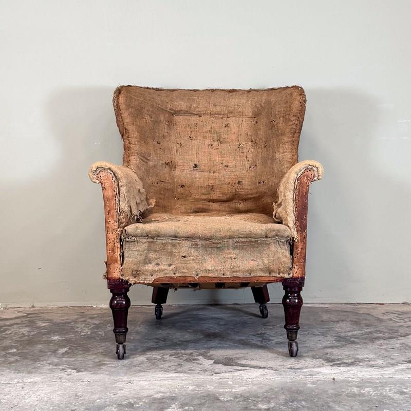Good quality library chair, with shaped back. Scroll arms and sprung seat on quality turned mahogany legs and brass cup castors. Circa 1850
