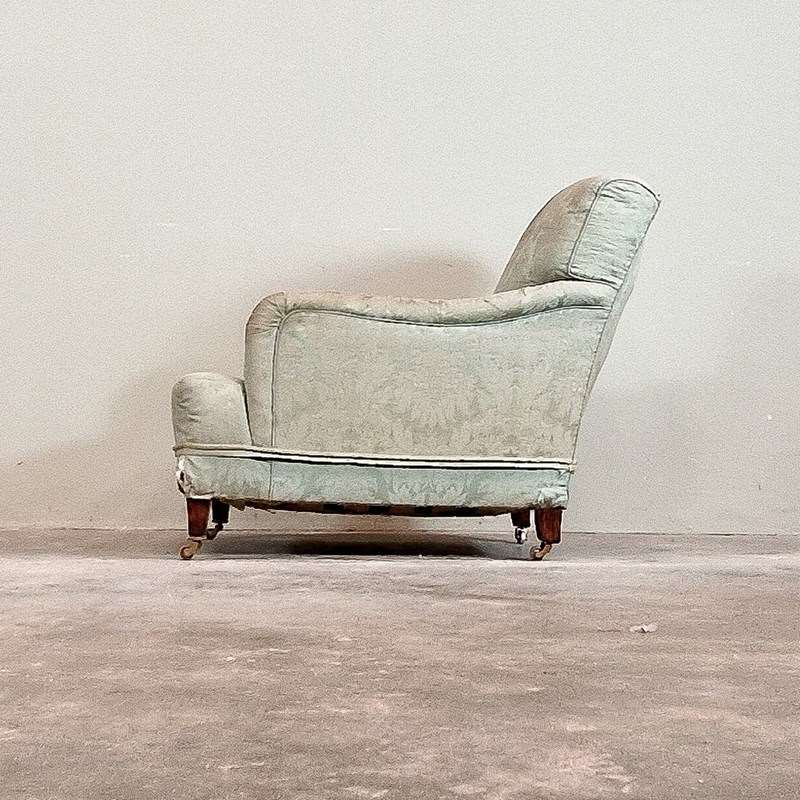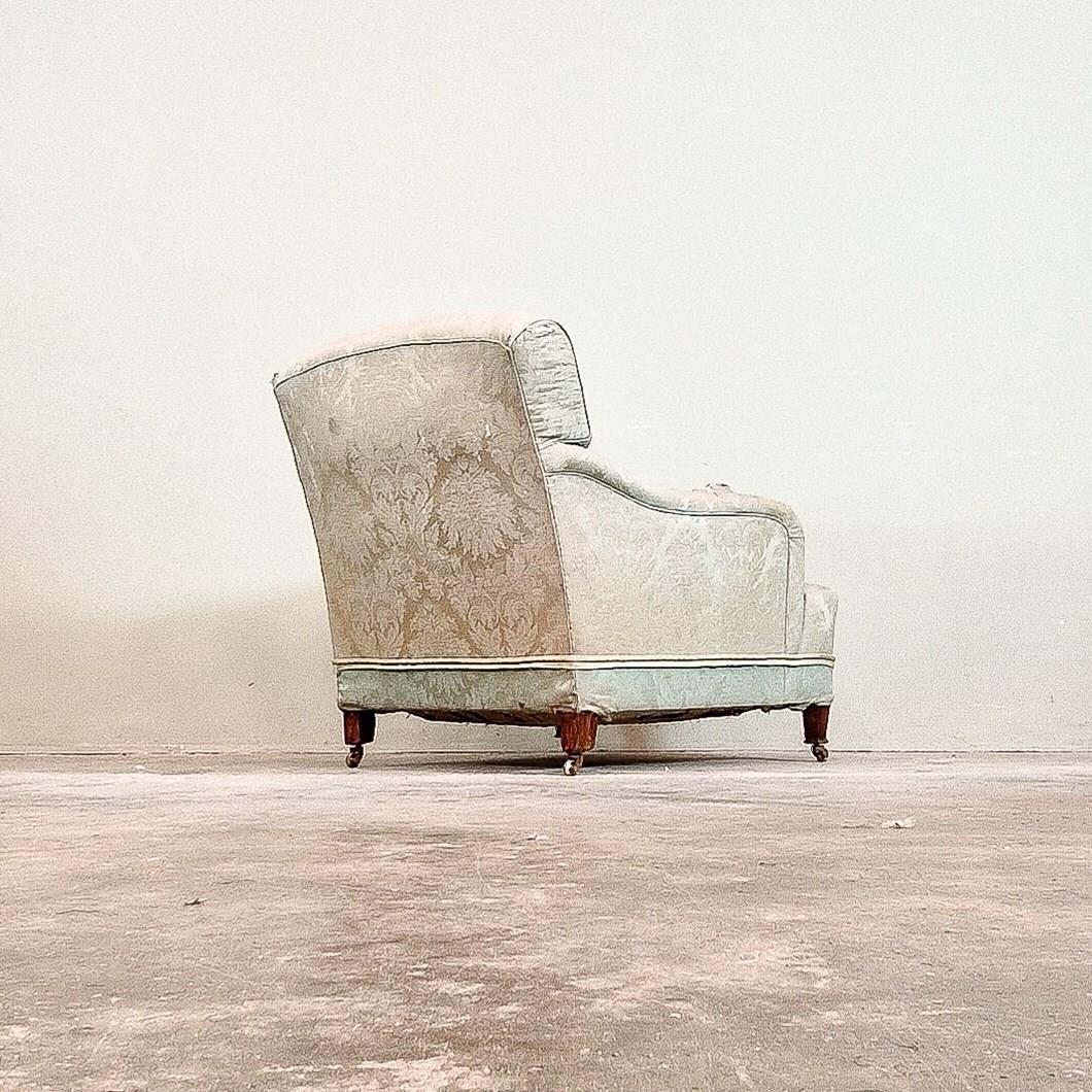 19th century wing chair, with tall back, shaped arms, standing on turned legs and brass castors. Circa 1920