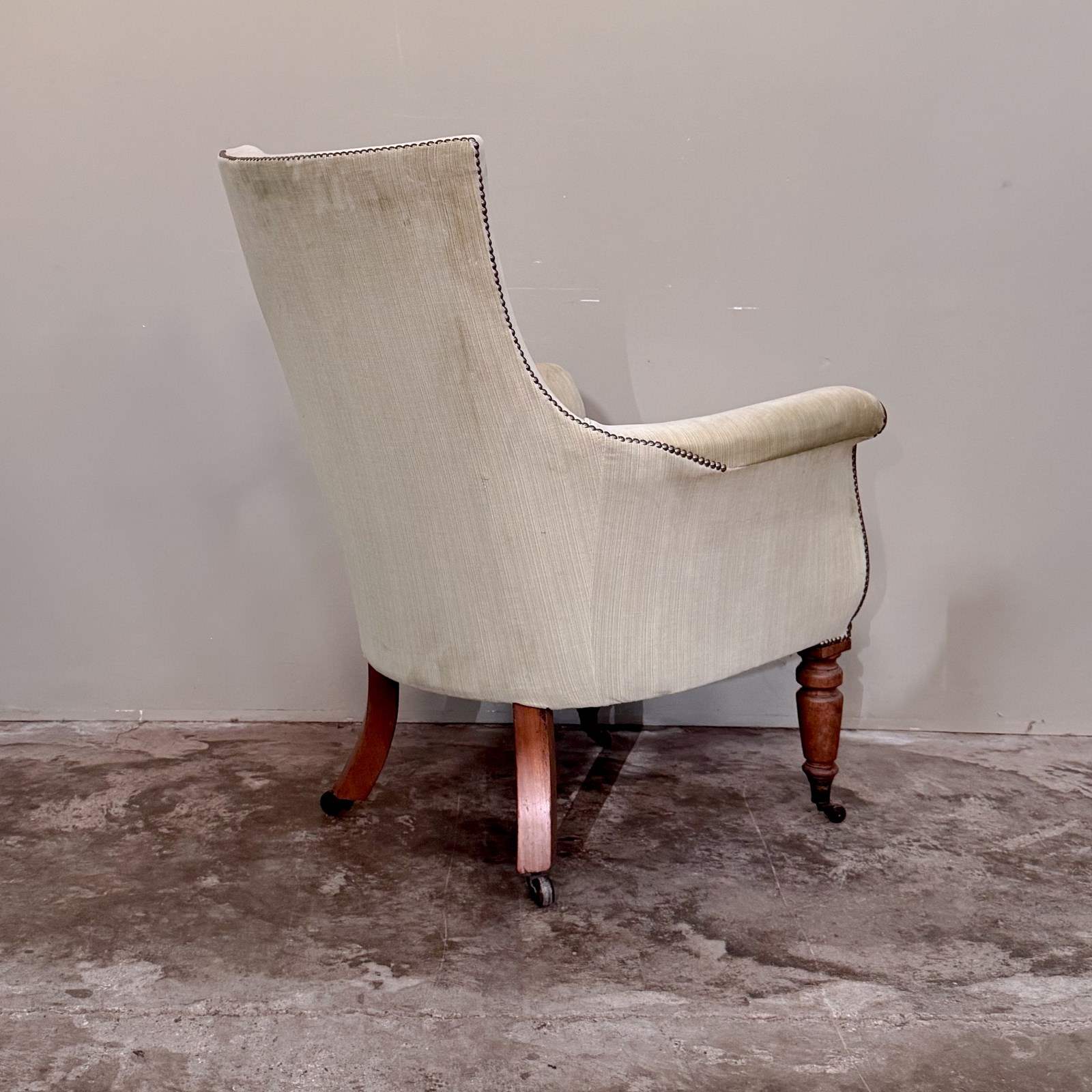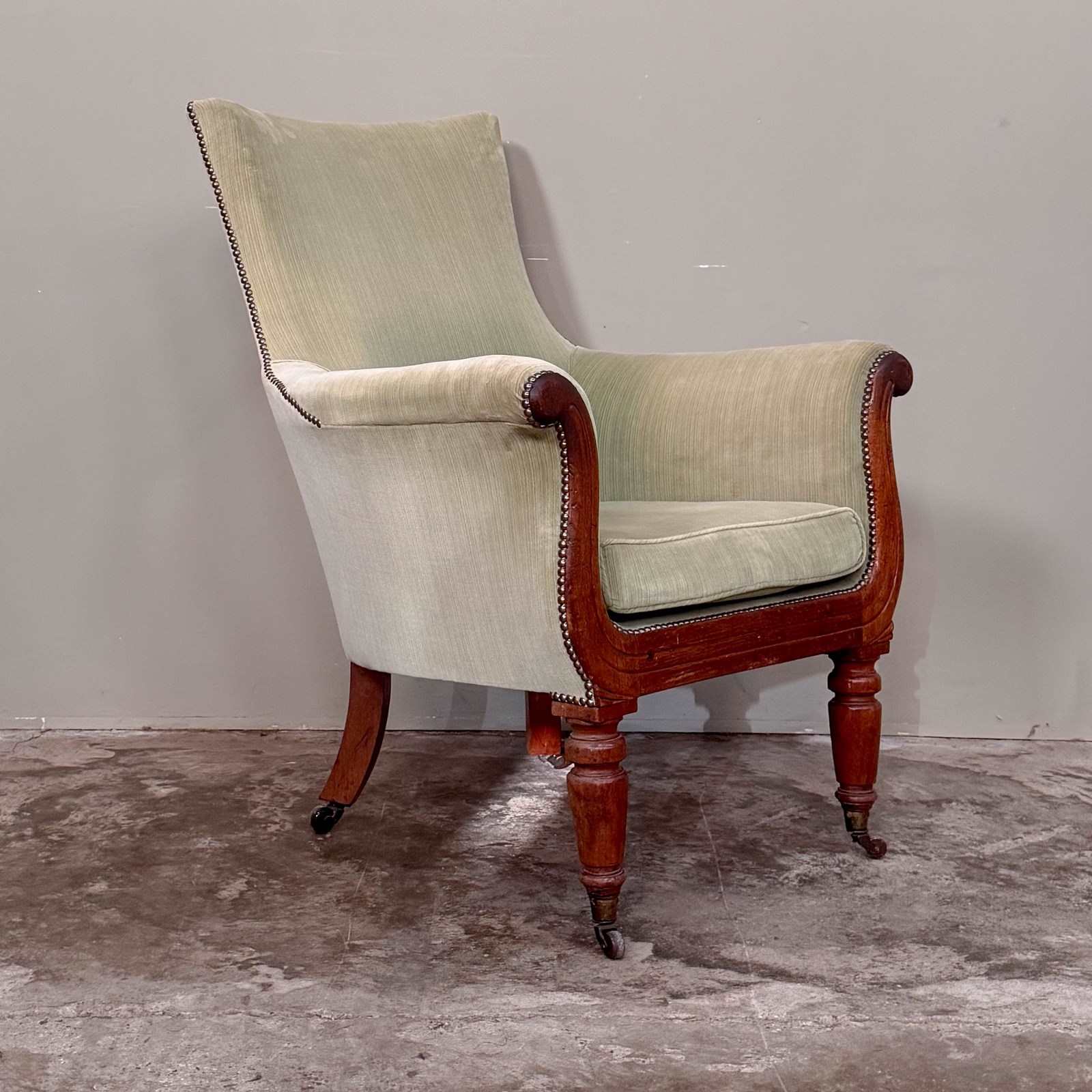 Regency mahogany library chair, with lyre shaped arms, standing on turned mahogany legs and castors. With original horse hair seat pad. Circa 1810 - 1820