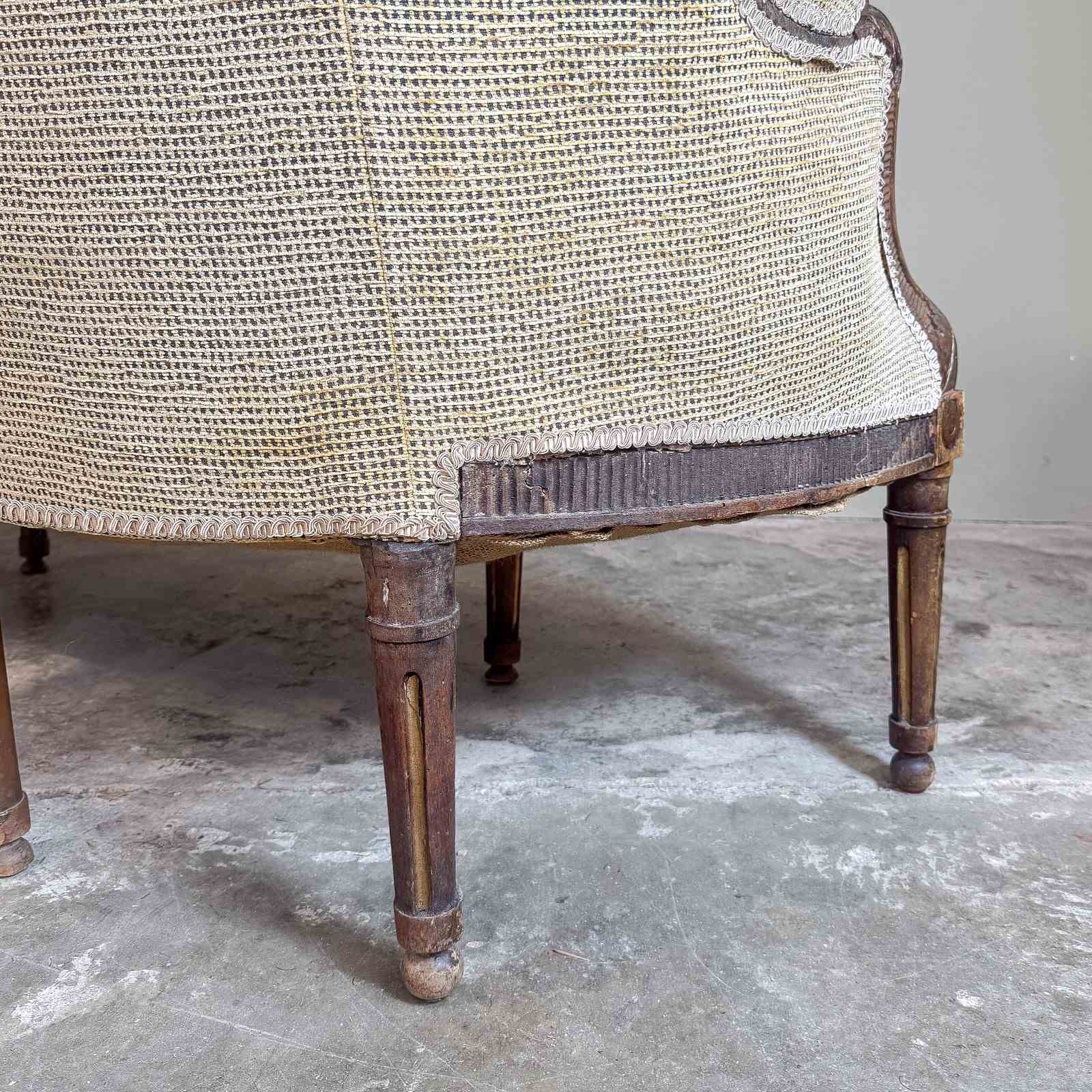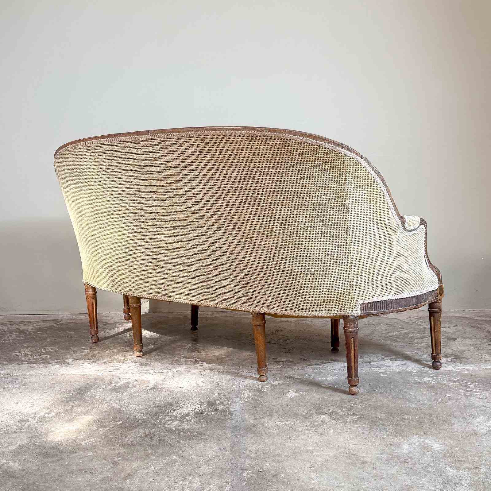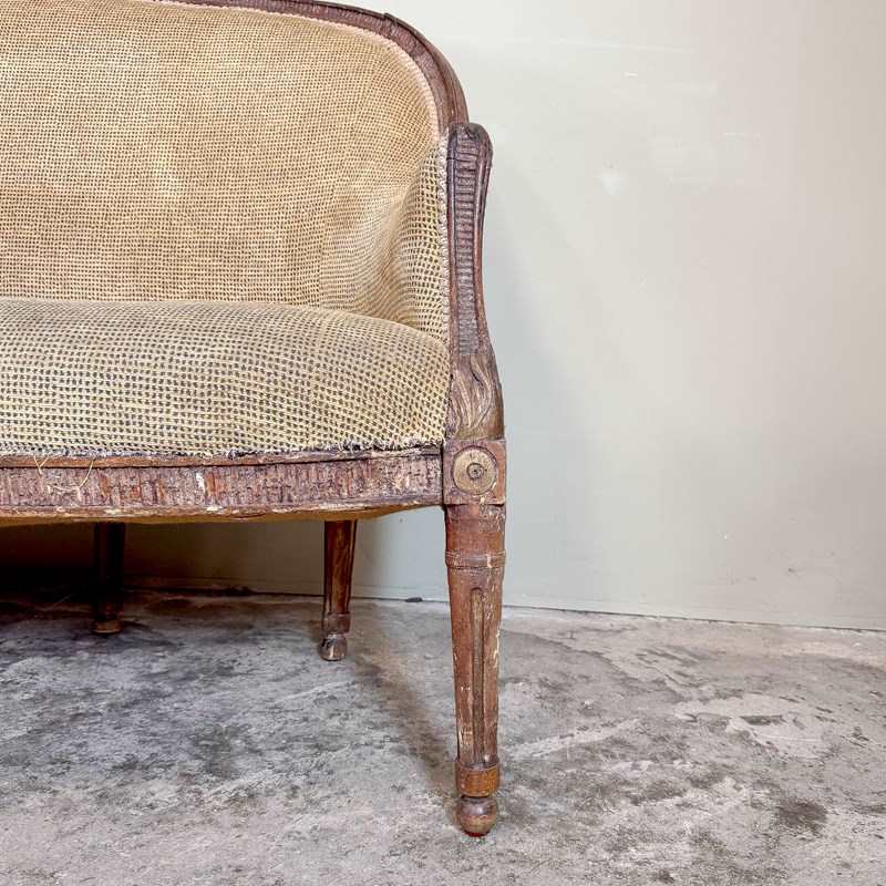 Very pretty mid 19th century French canape, with turned fluted legs and carved decoration to show wood frame. With some original guilt decoration. Circa 1850-60