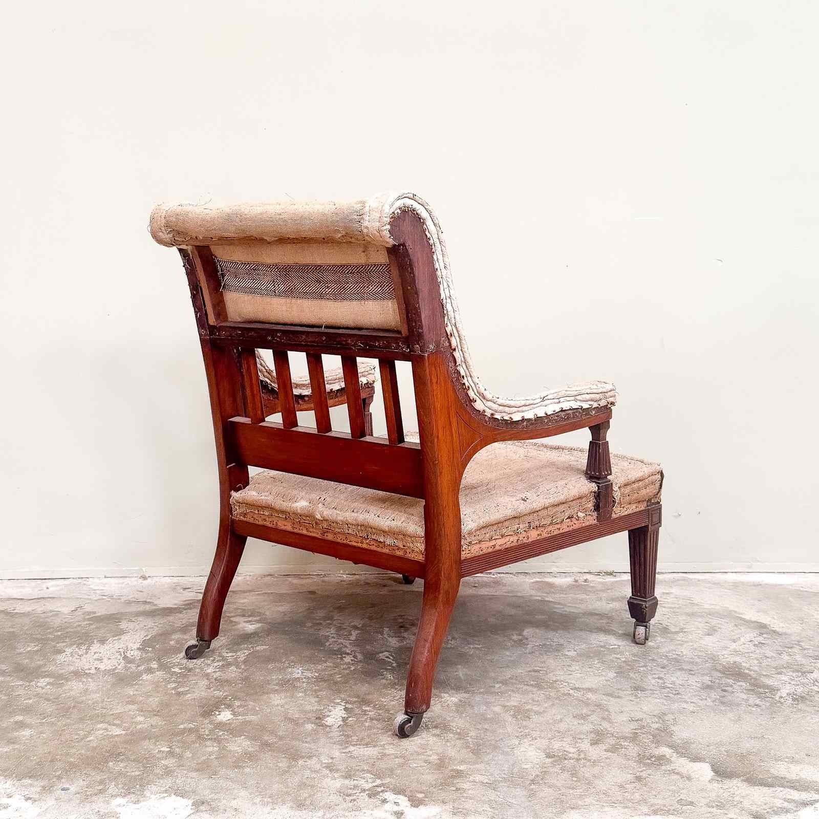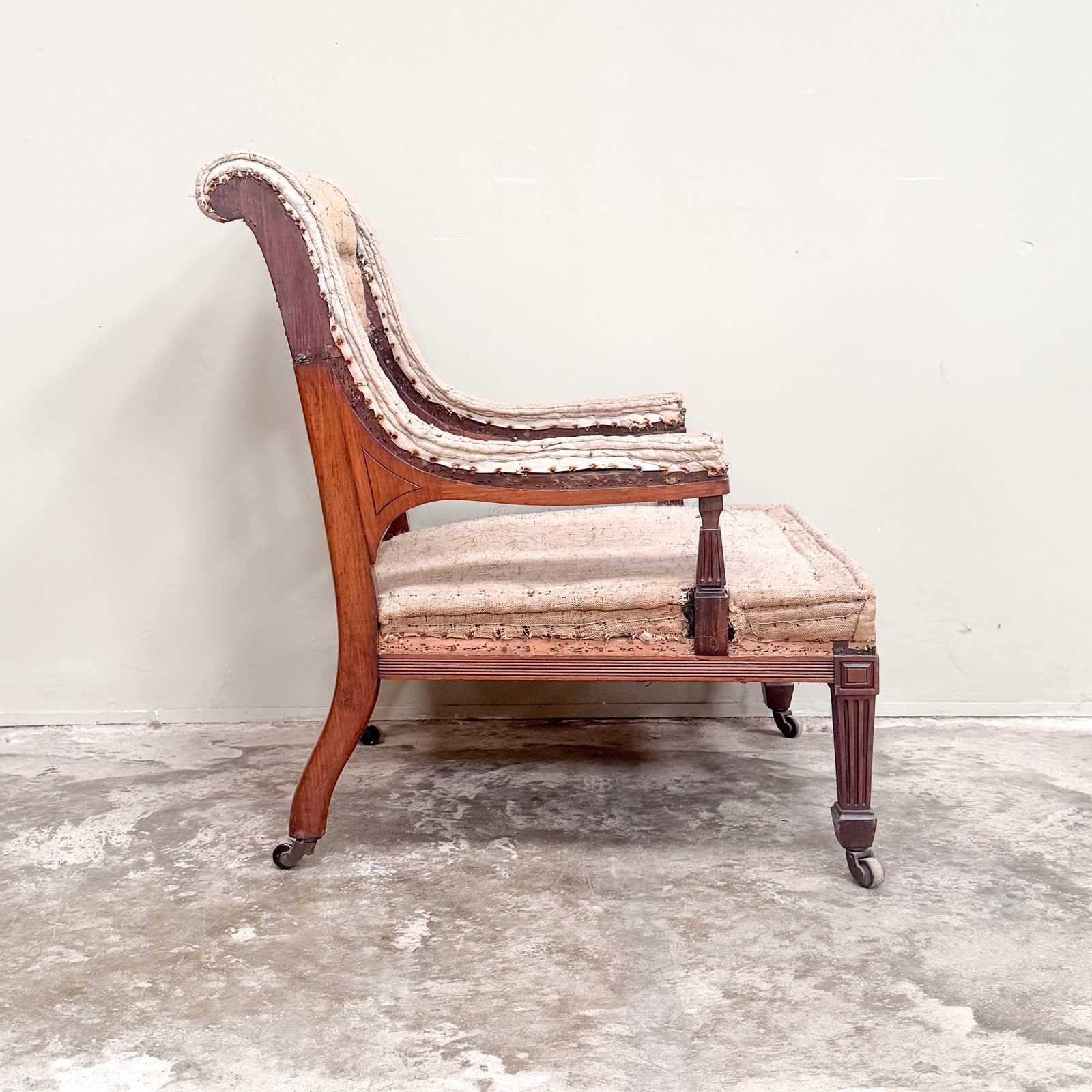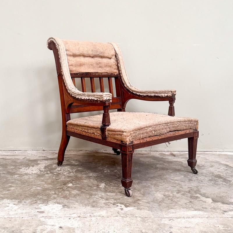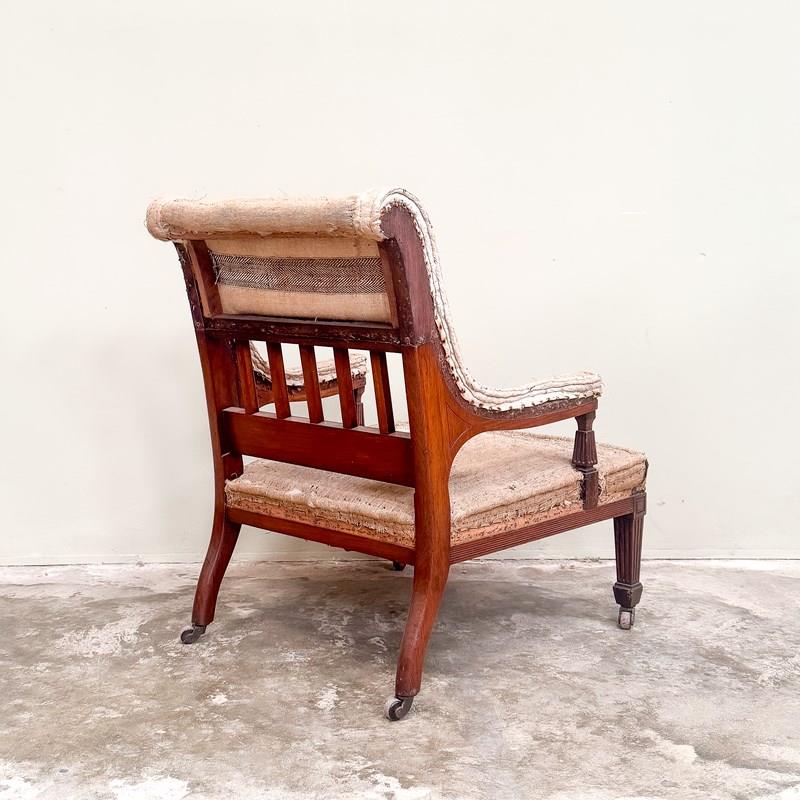 Very good quality Rosewood, open arm library chair. Standing on tapered, fluted, spade legs and original ceramic castors. With sprung seat, scroll back and fluted, tapered arm supports. Circa 1920