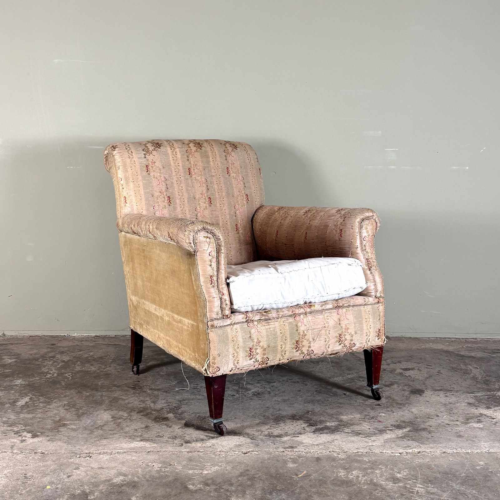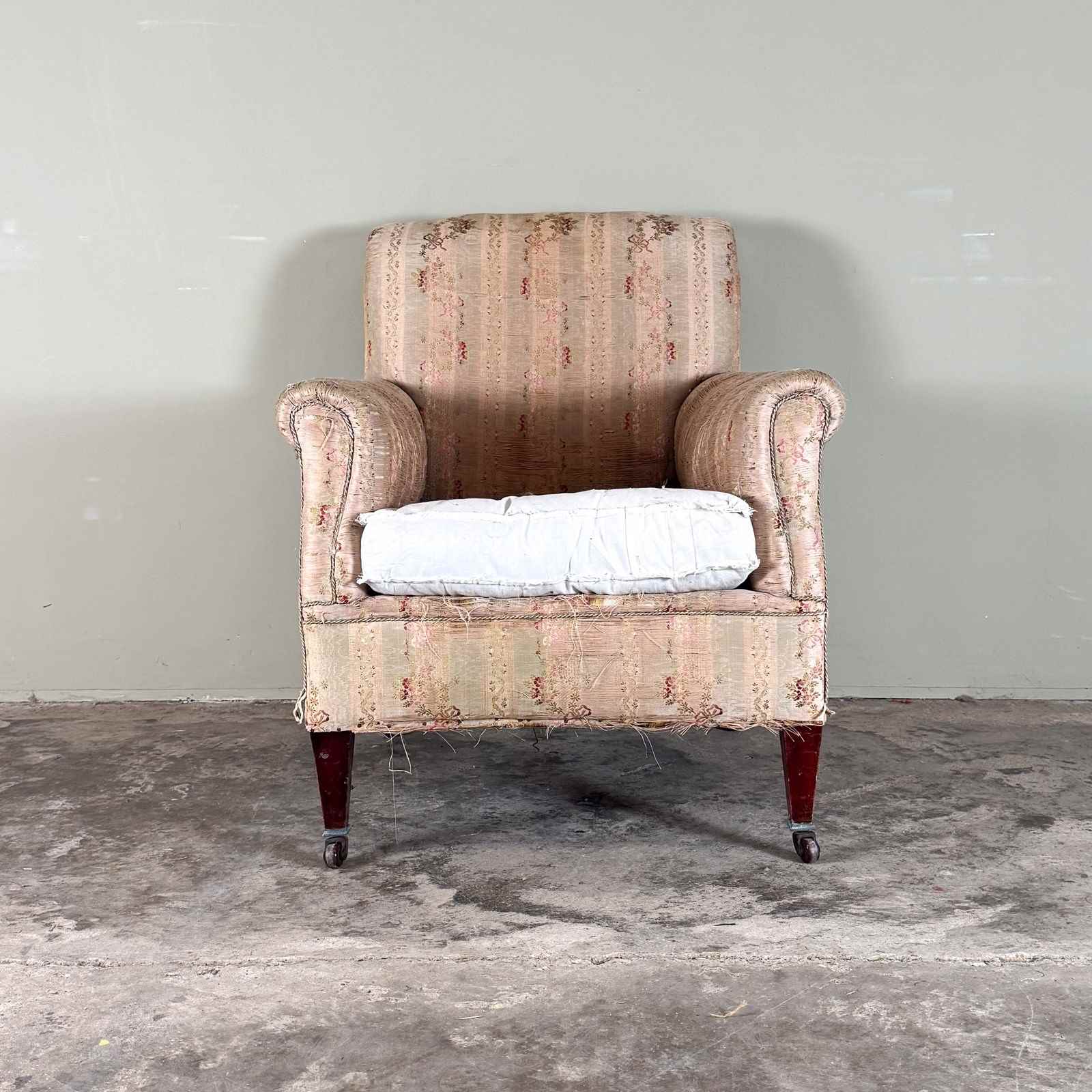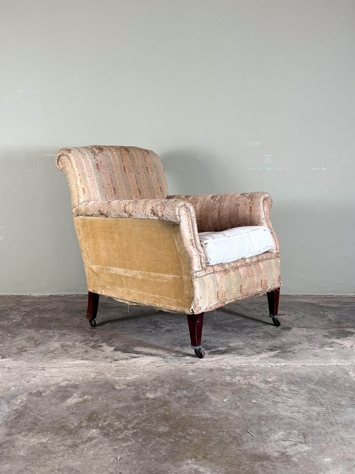Pretty Edwardian armchair, with scroll arm and back. Standing on mahogany square taper legs and castors. Circa 1910
