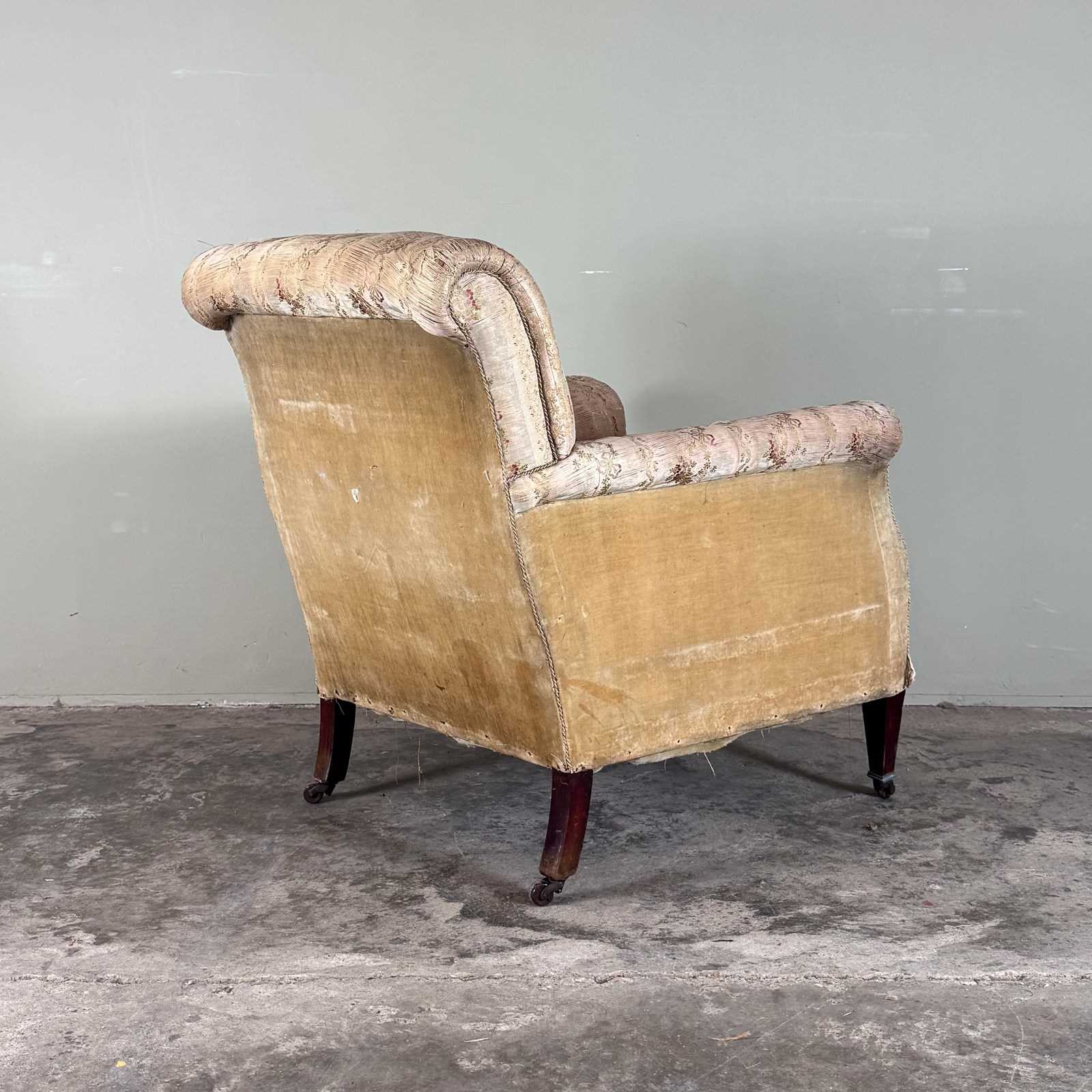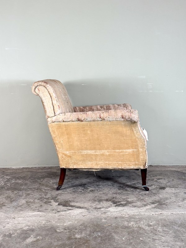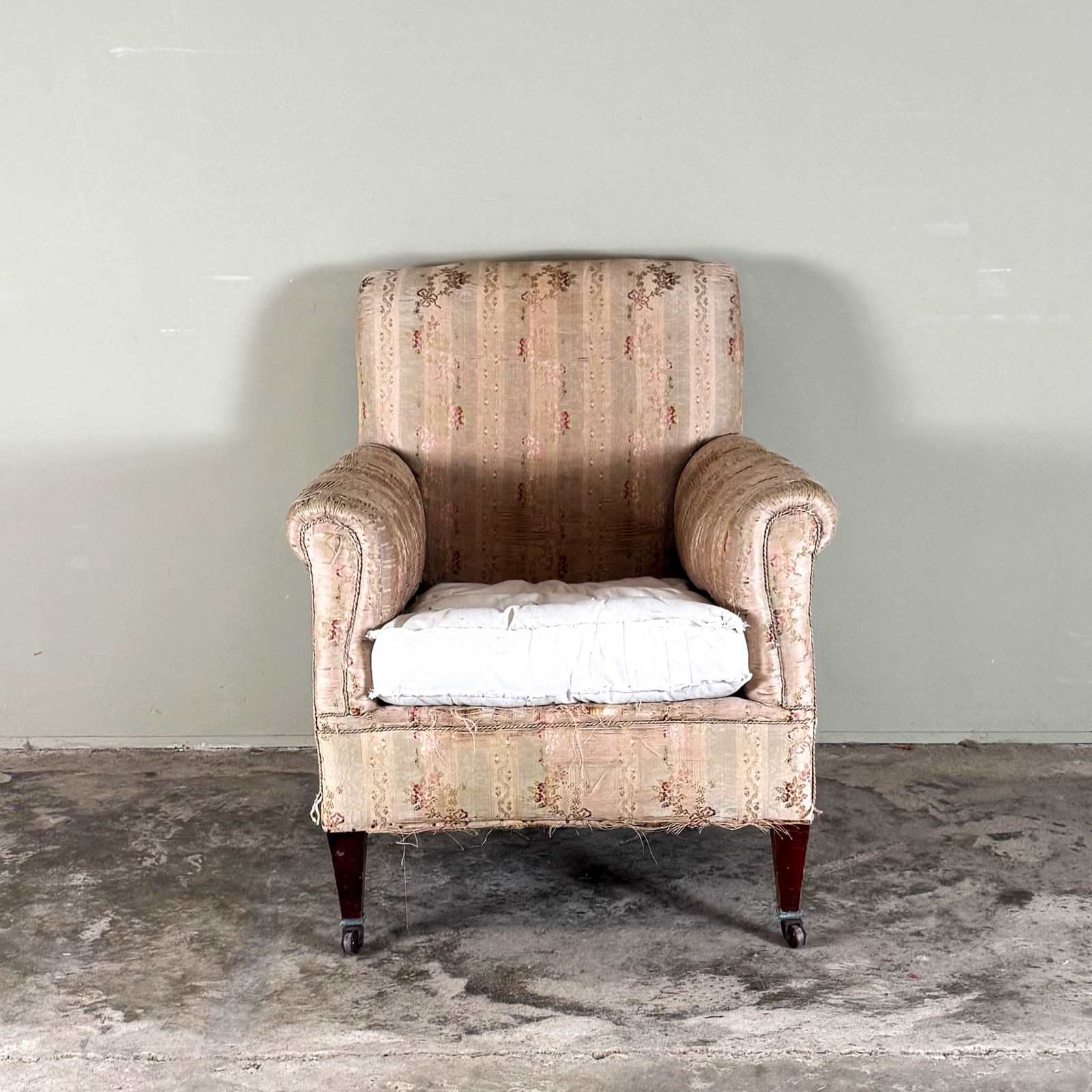 Pretty Edwardian armchair, with scroll arm and back. Standing on mahogany square taper legs and castors. Circa 1910