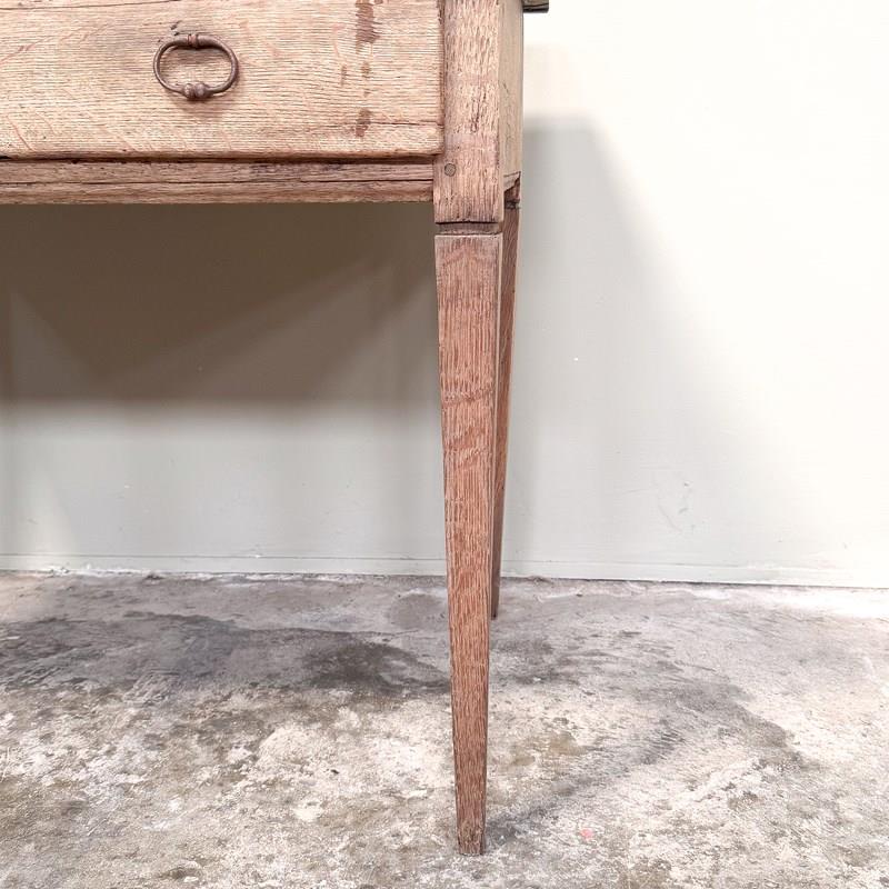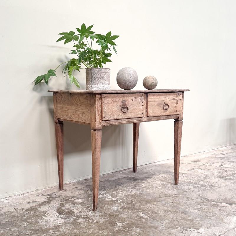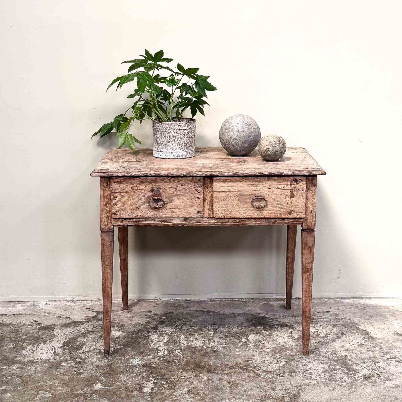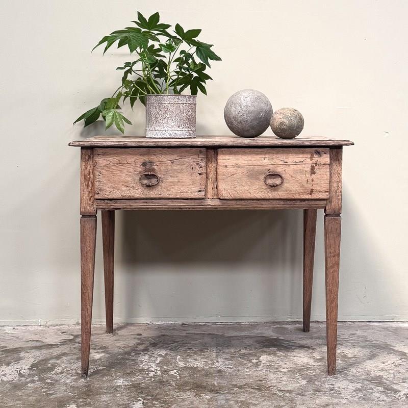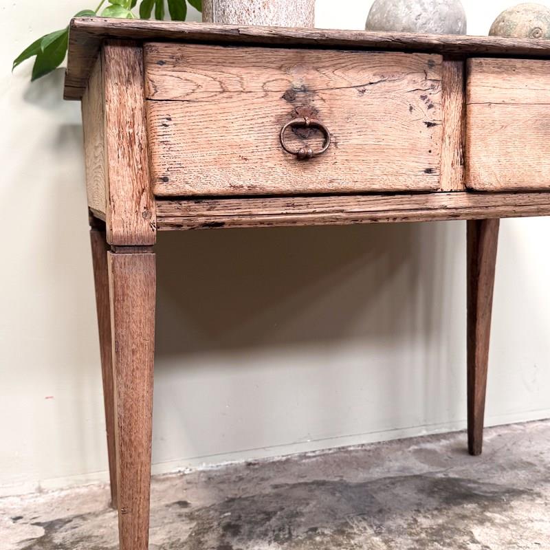 19th century rustic French side table, with two drawers. Lovely dry finish and texture, with original iron work handles, standing on square taper legs.