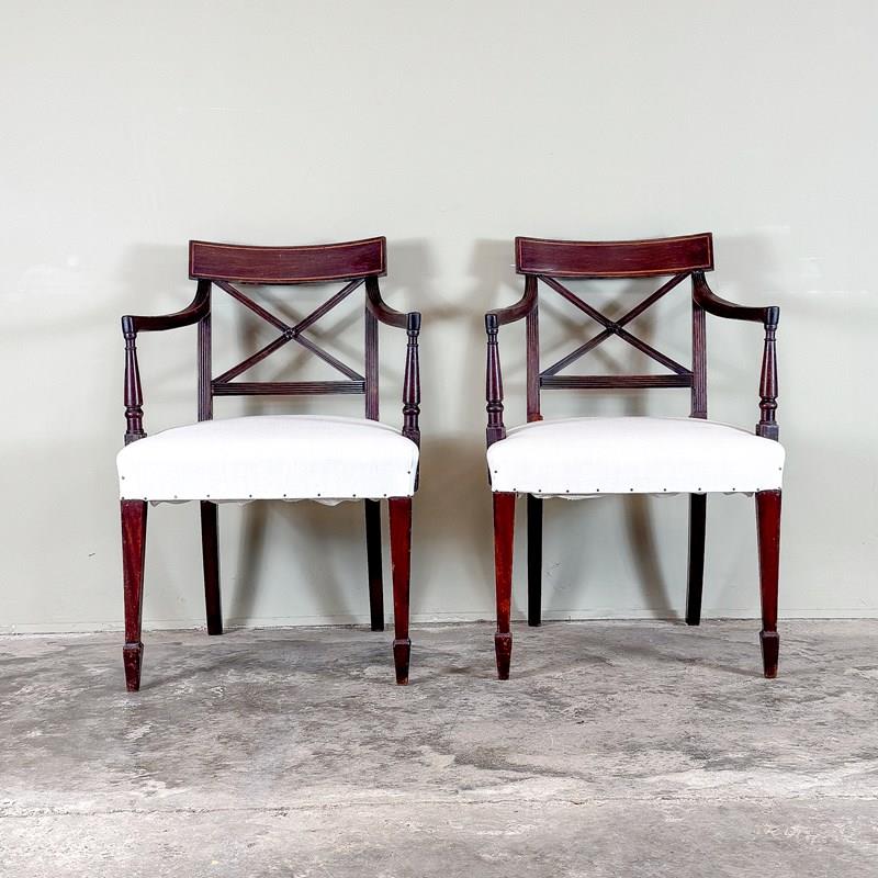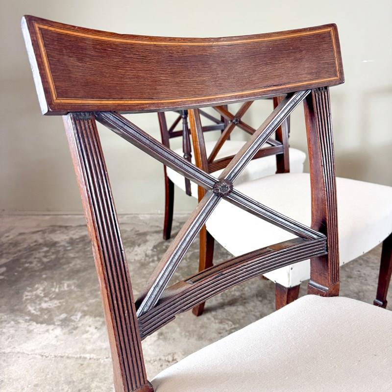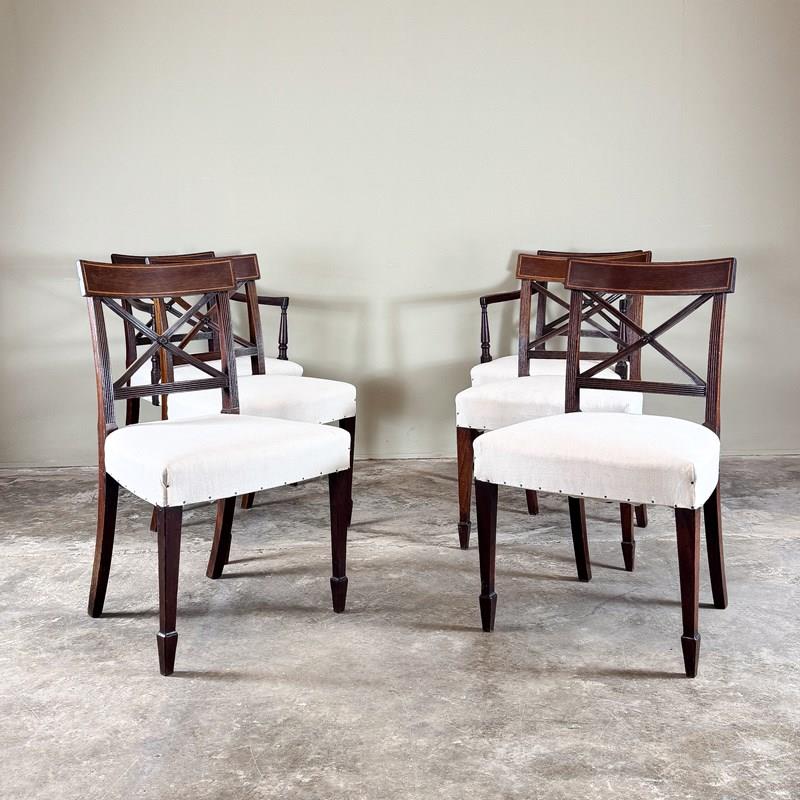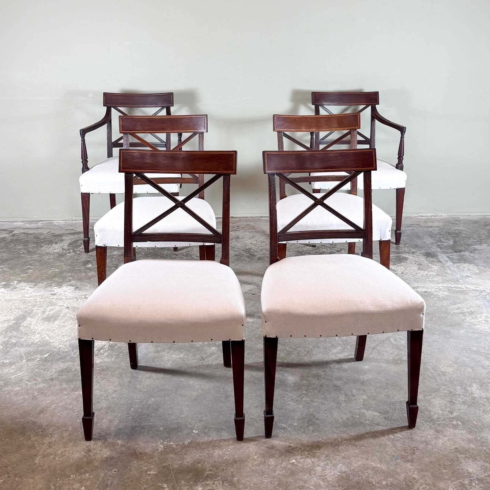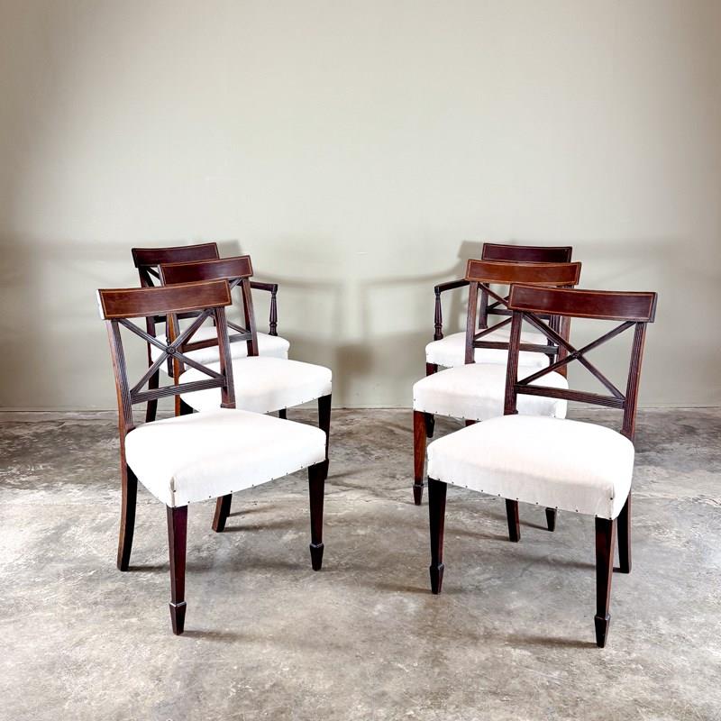 Set of six Sheraton design mahogany dining chairs, two carvers and four dining chairs. With reeding to the arms and uprights and inlay to the splat. Standing on slender taper legs. Circa 1800 - 1810