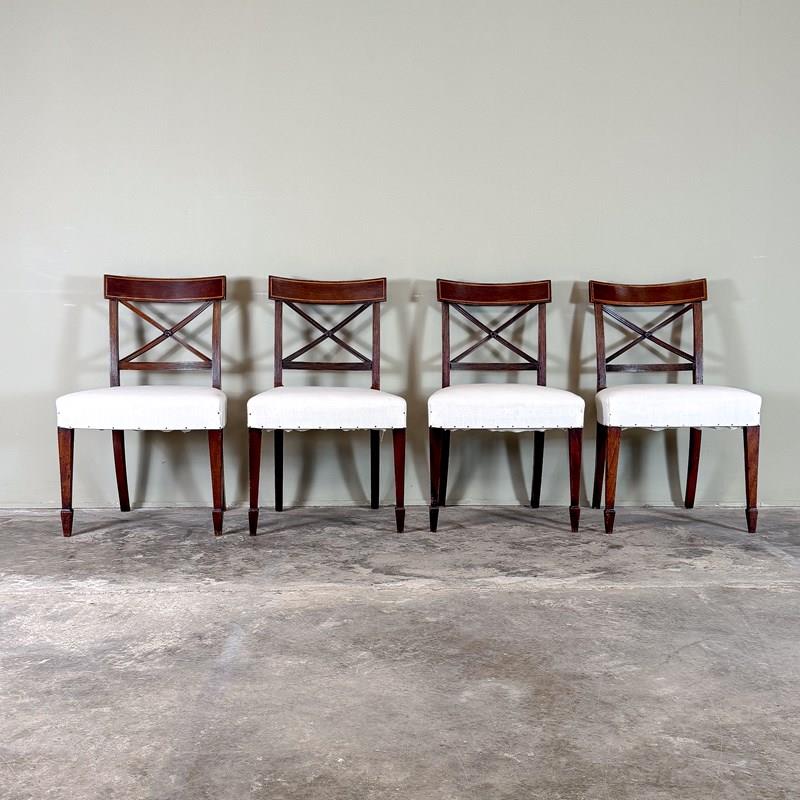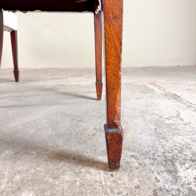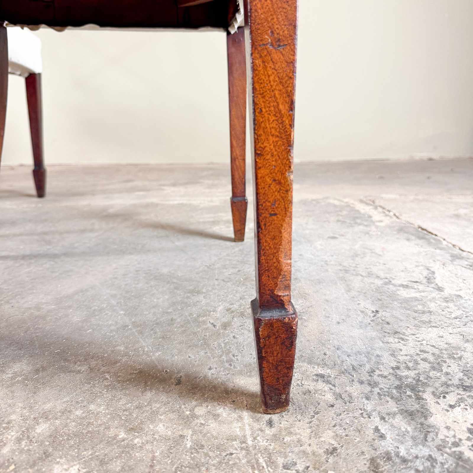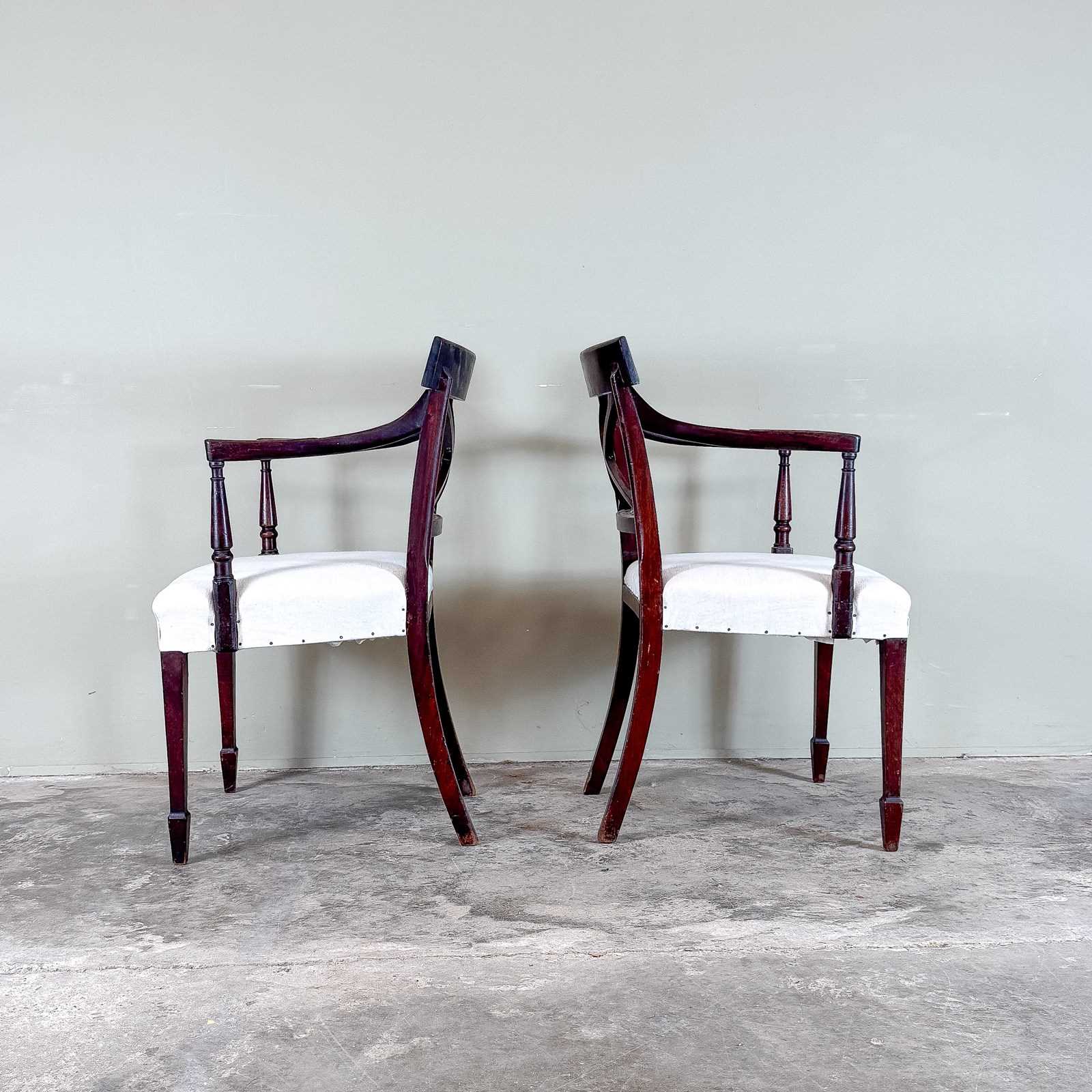 Set of six Sheraton design mahogany dining chairs, two carvers and four dining chairs. With reeding to the arms and uprights and inlay to the splat. Standing on slender taper legs. Circa 1800 - 1810