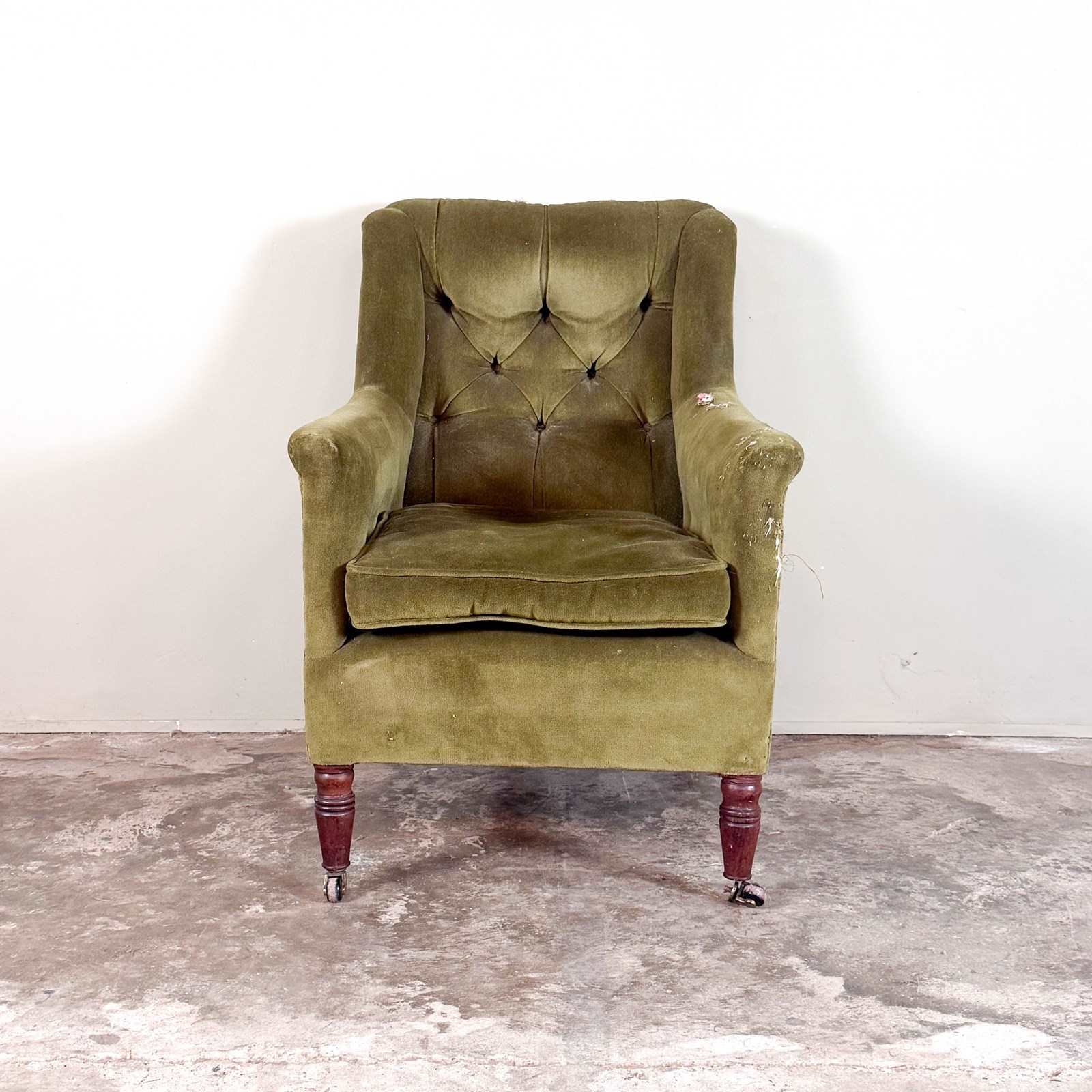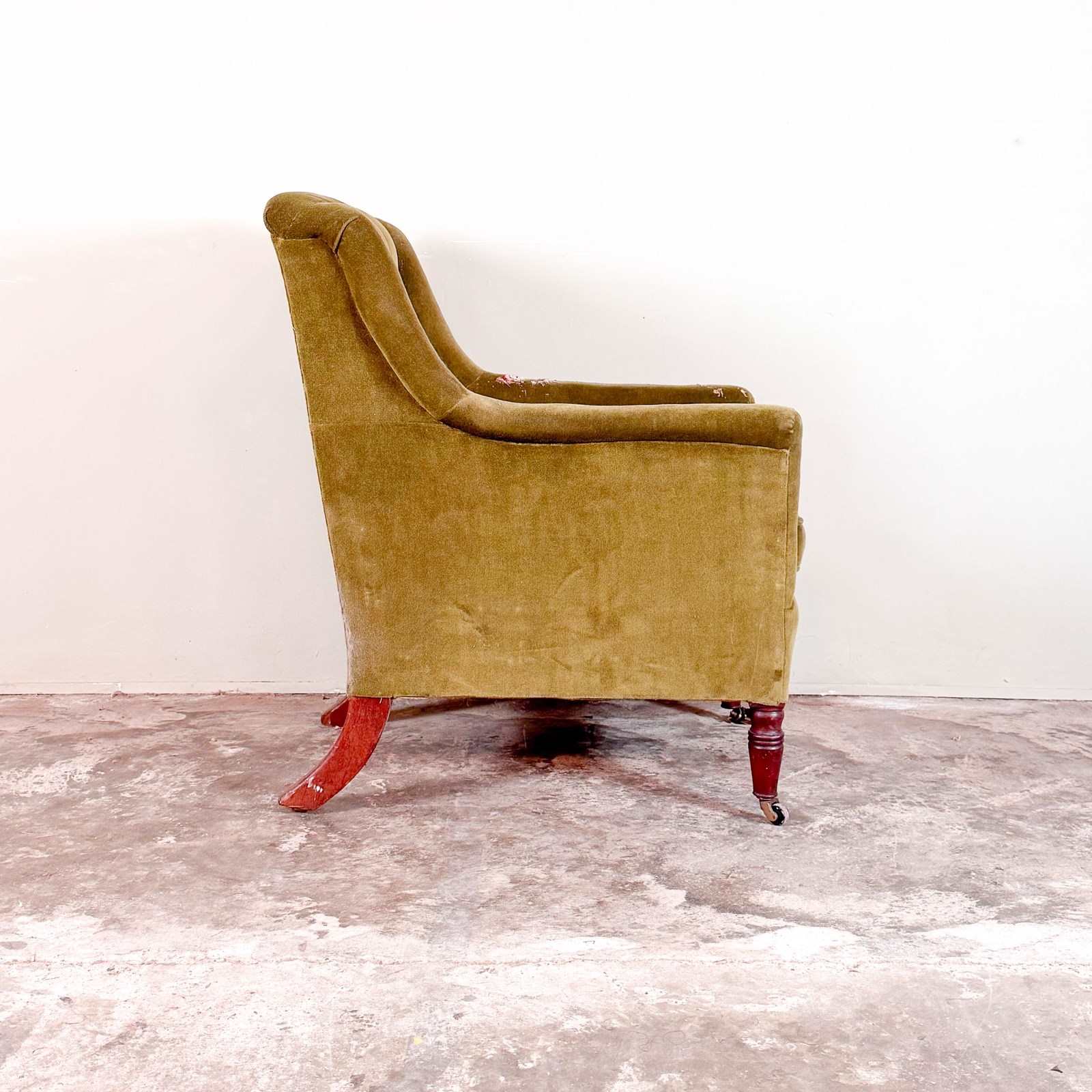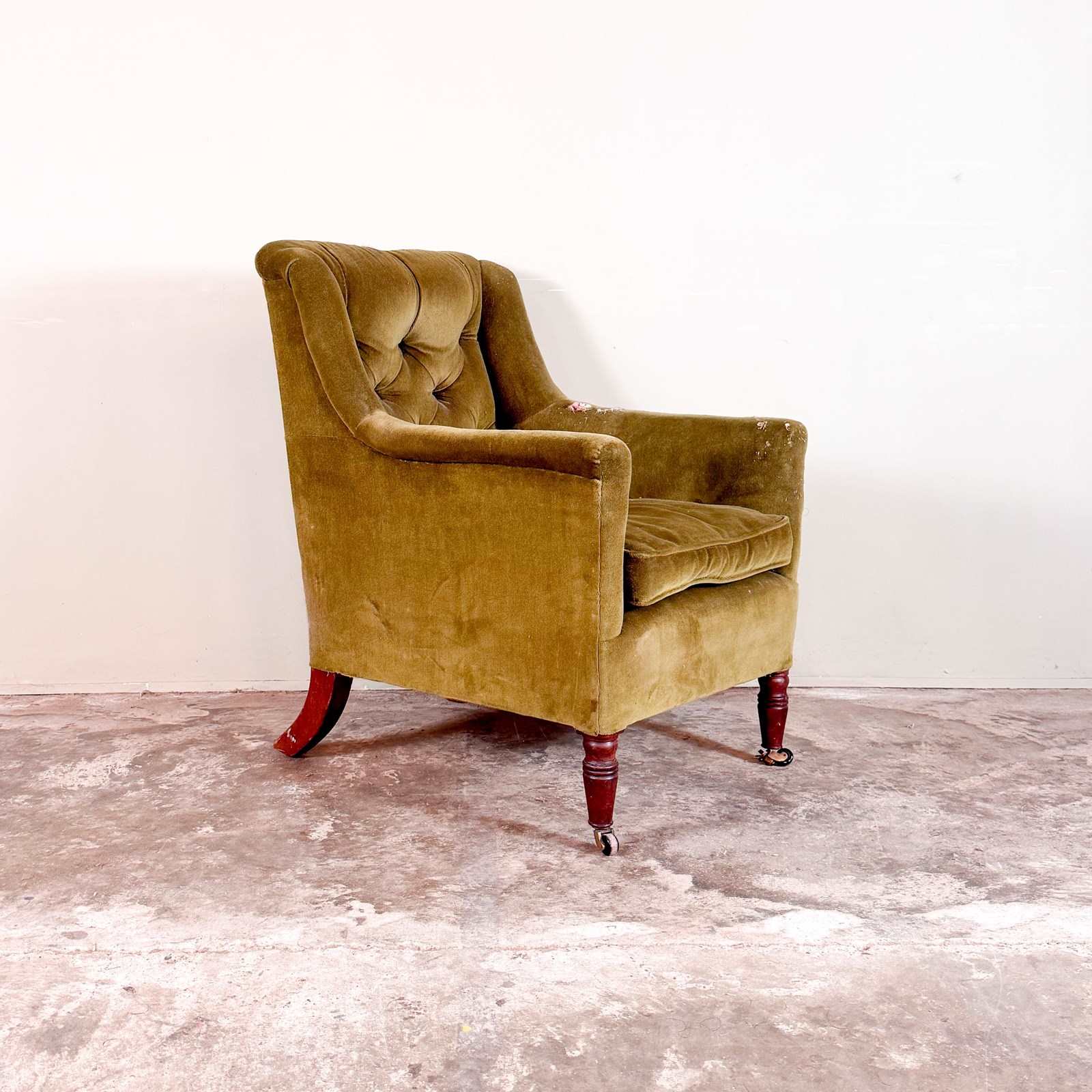 A well proportioned small Regency library chair, standing on mahogany hand turned front legs and out swept back legs. With sprung seat and buttoned back (can be plain once re upholstered) Feather seat pad. Circa 1820