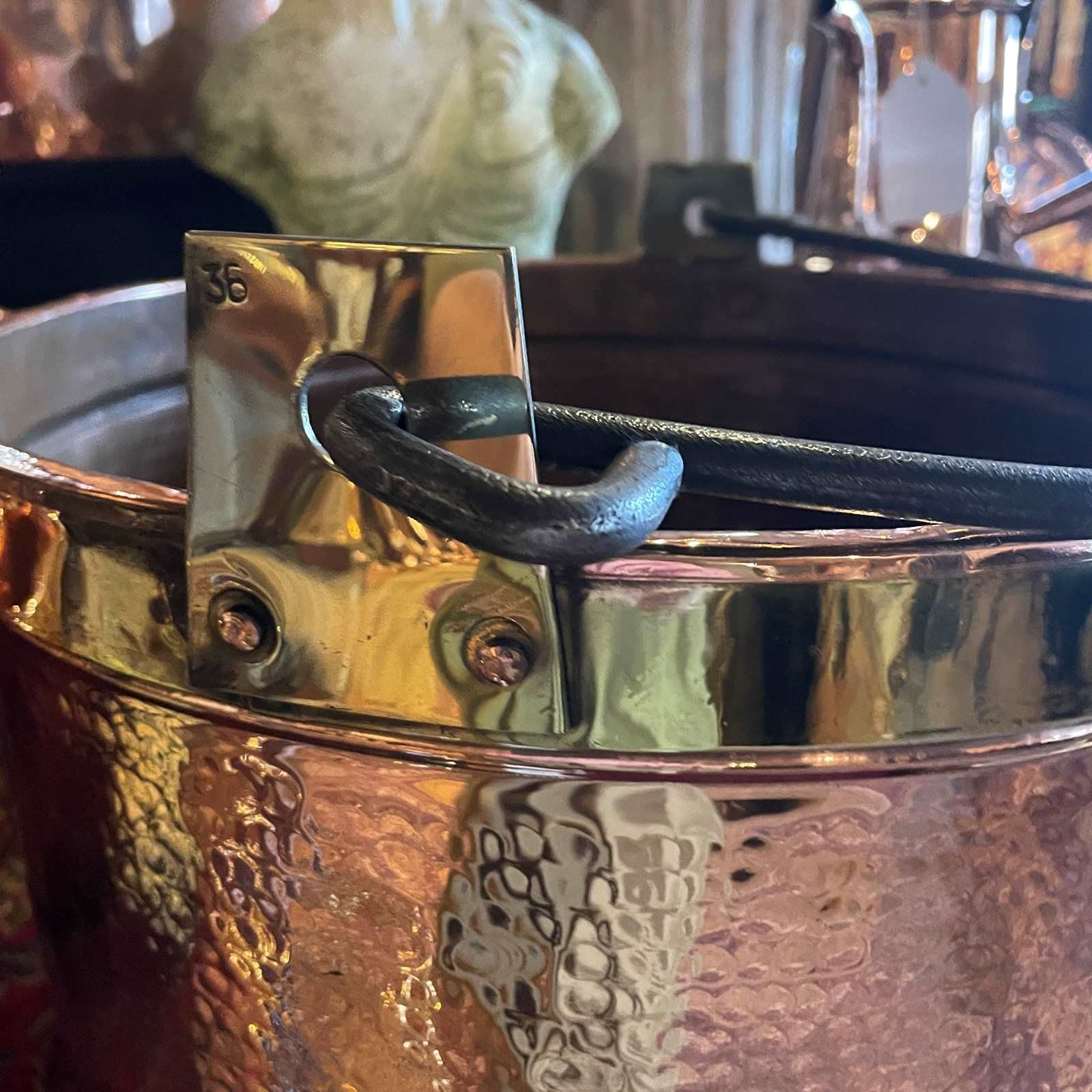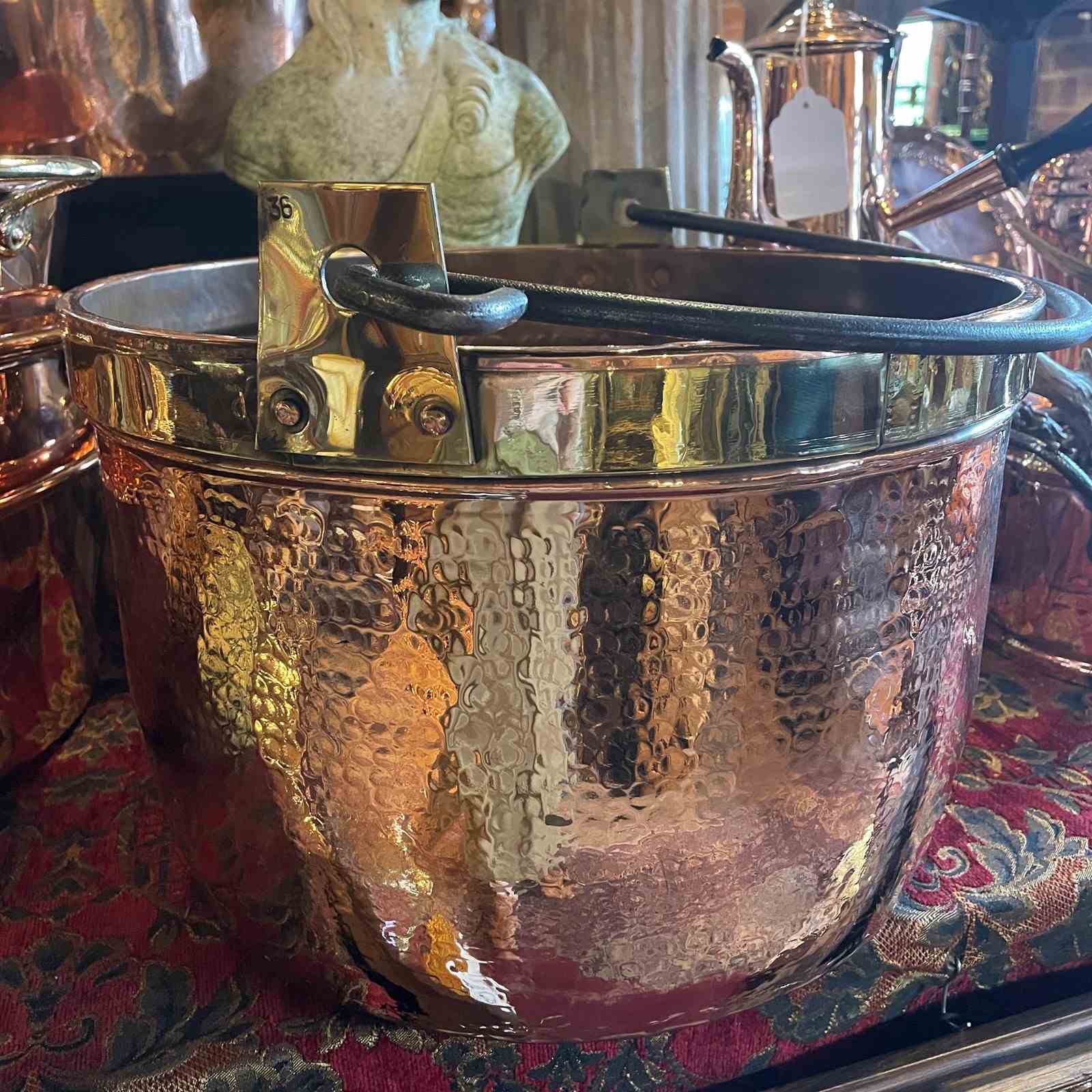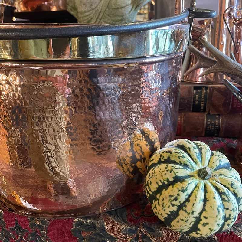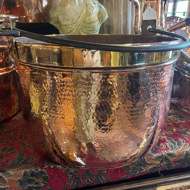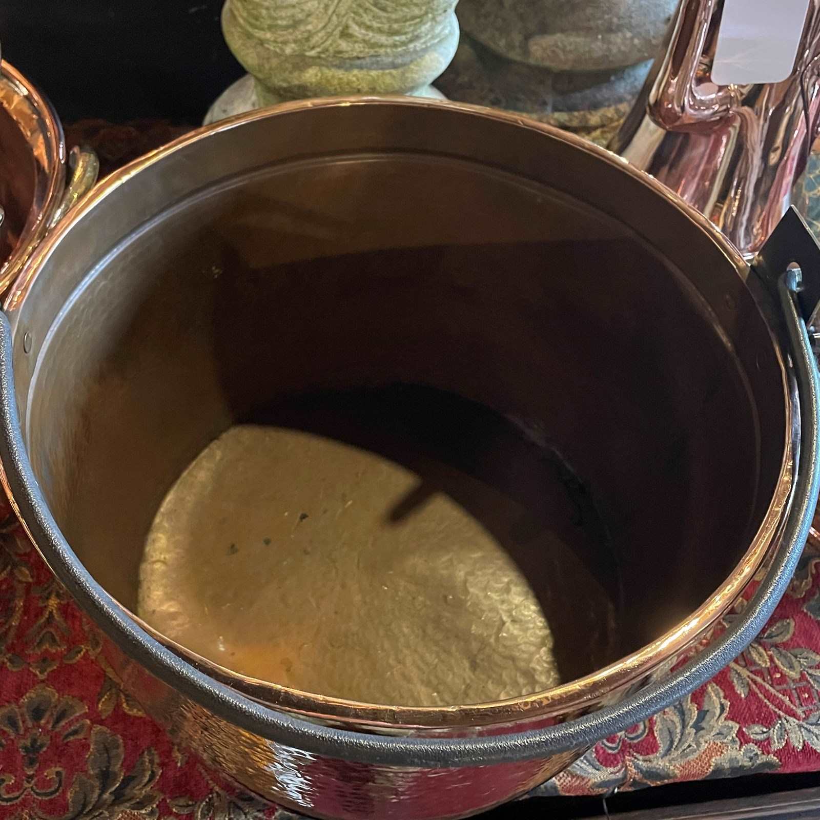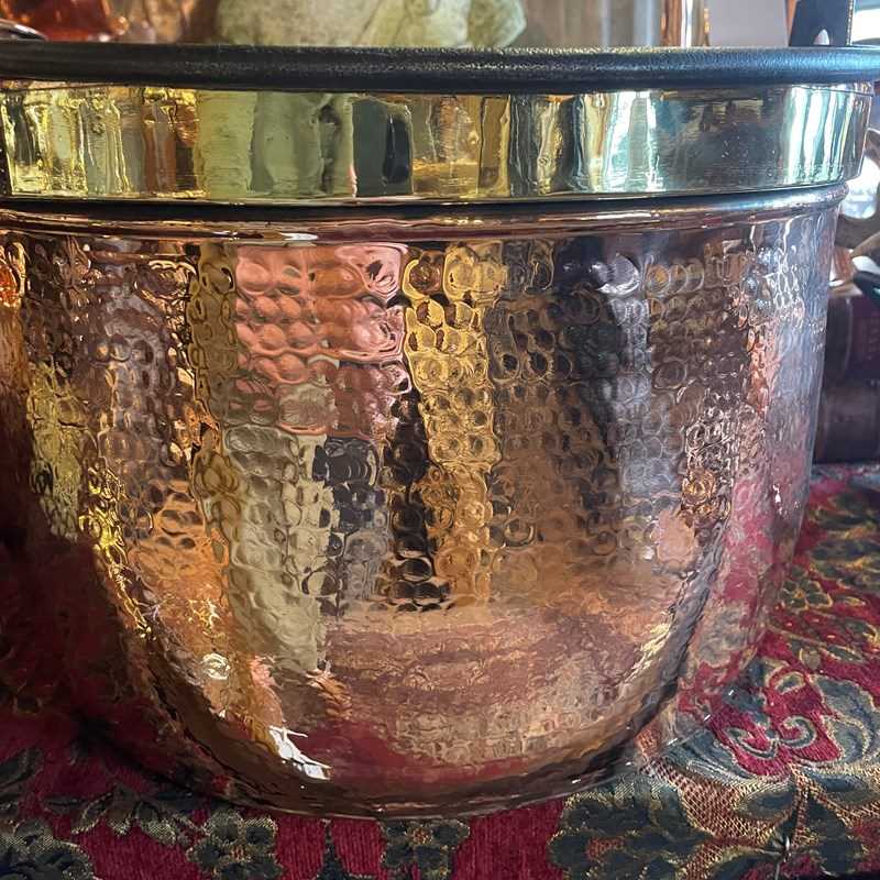 Large Copper Log or Coal bin with a hammered finish, brass rim around the top and a swing iron handle