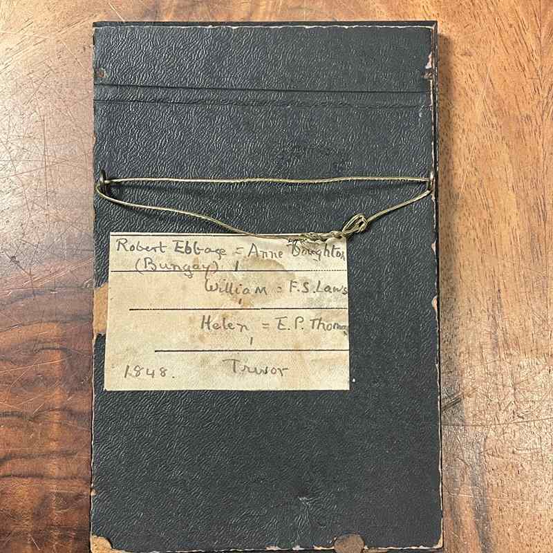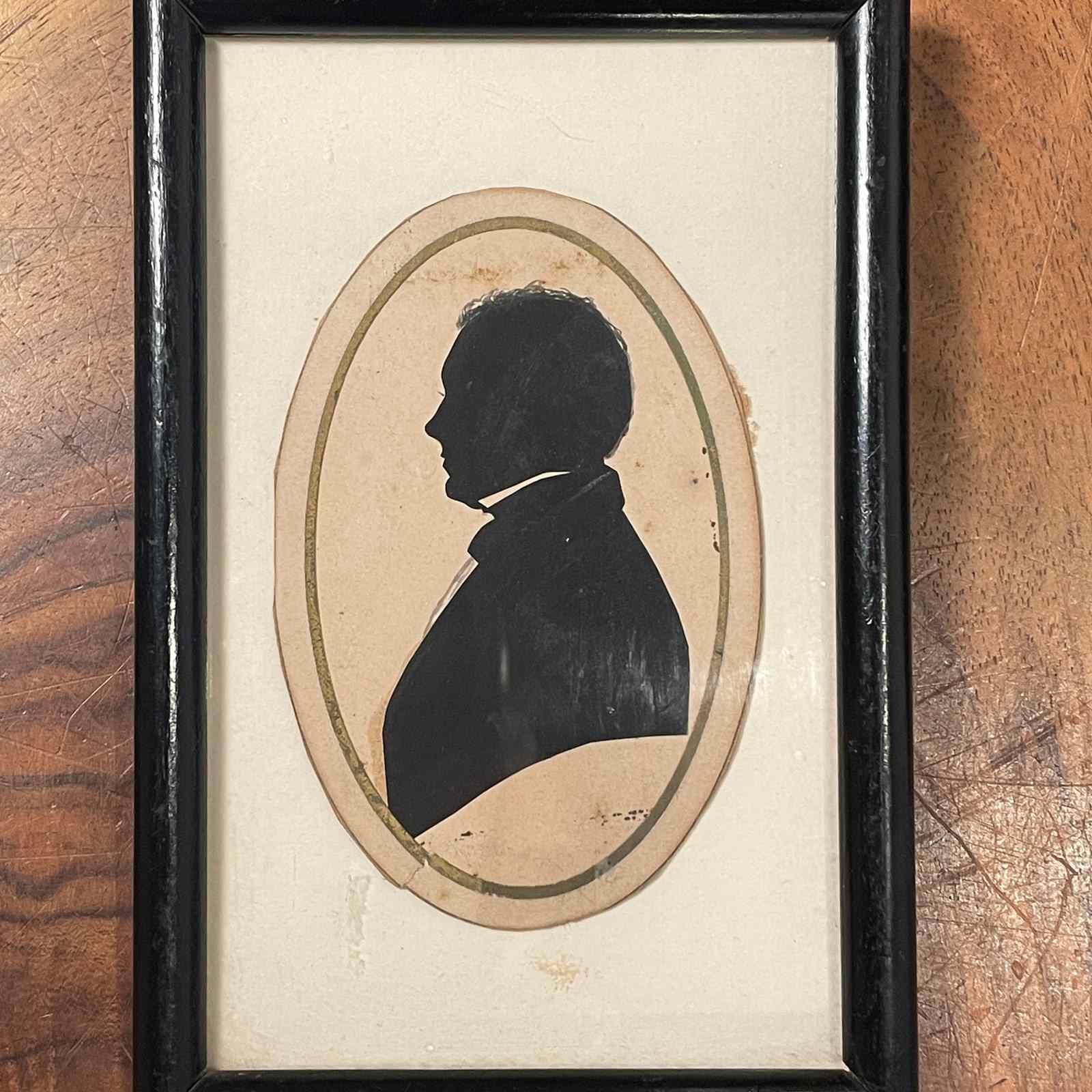 A hand painted silhouette of a Gentleman in a black wooden frame. family information on the back of the frame, dated 1848.