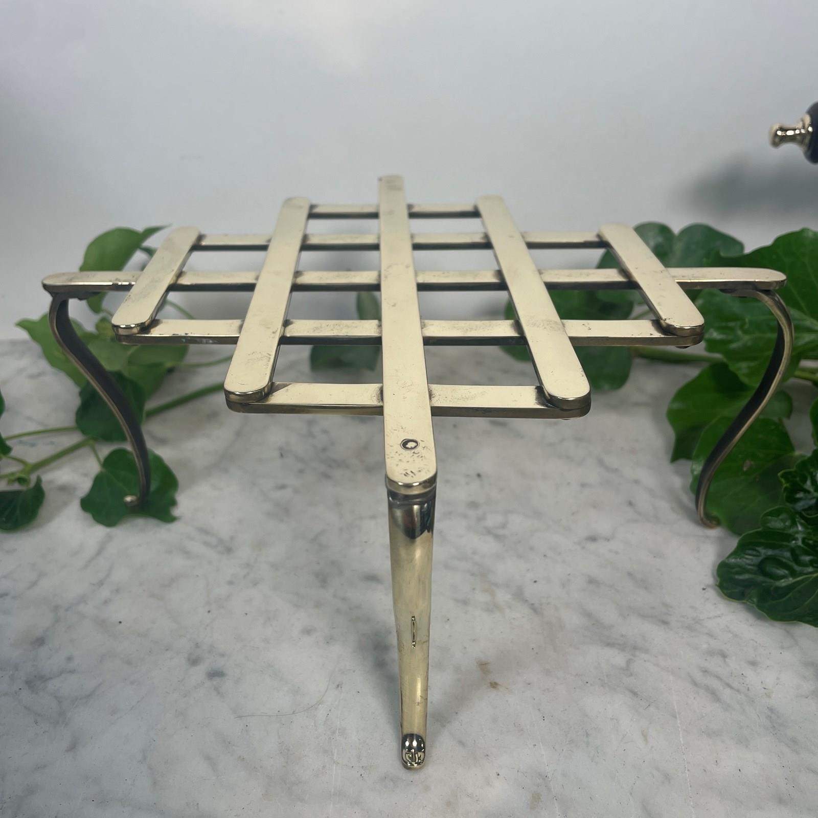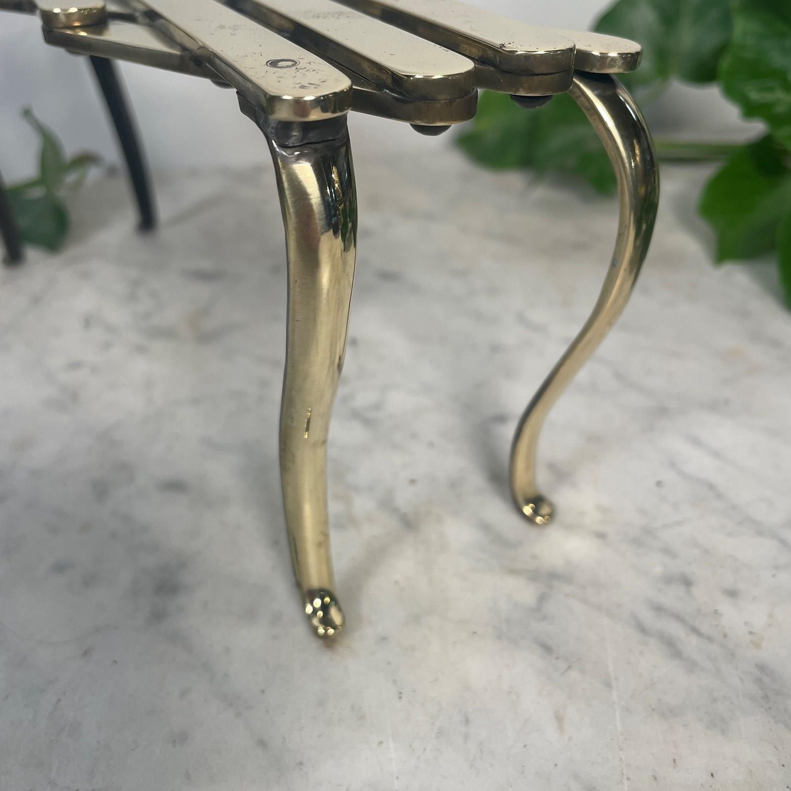A folding concertinaed brass trivet on fine supported legs.