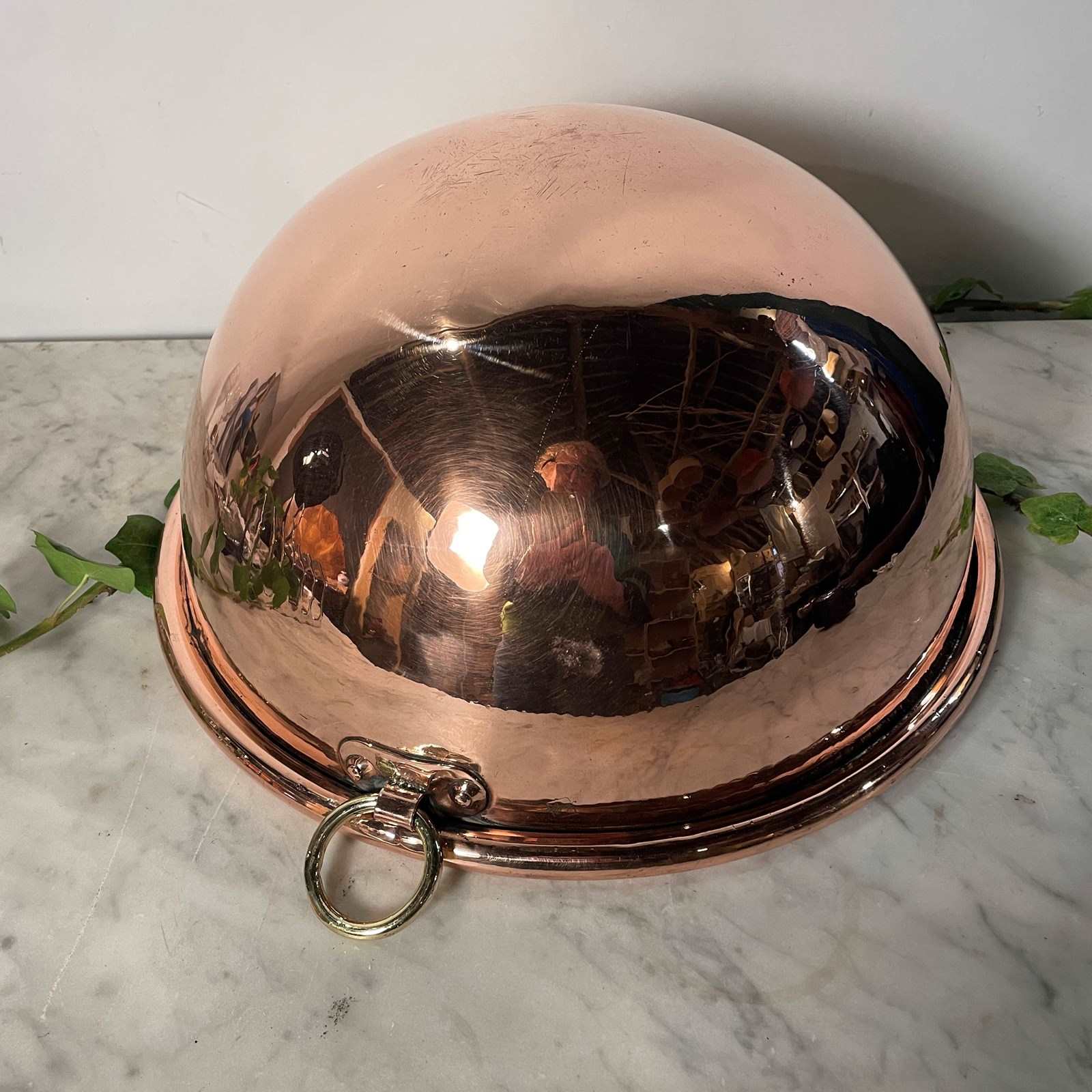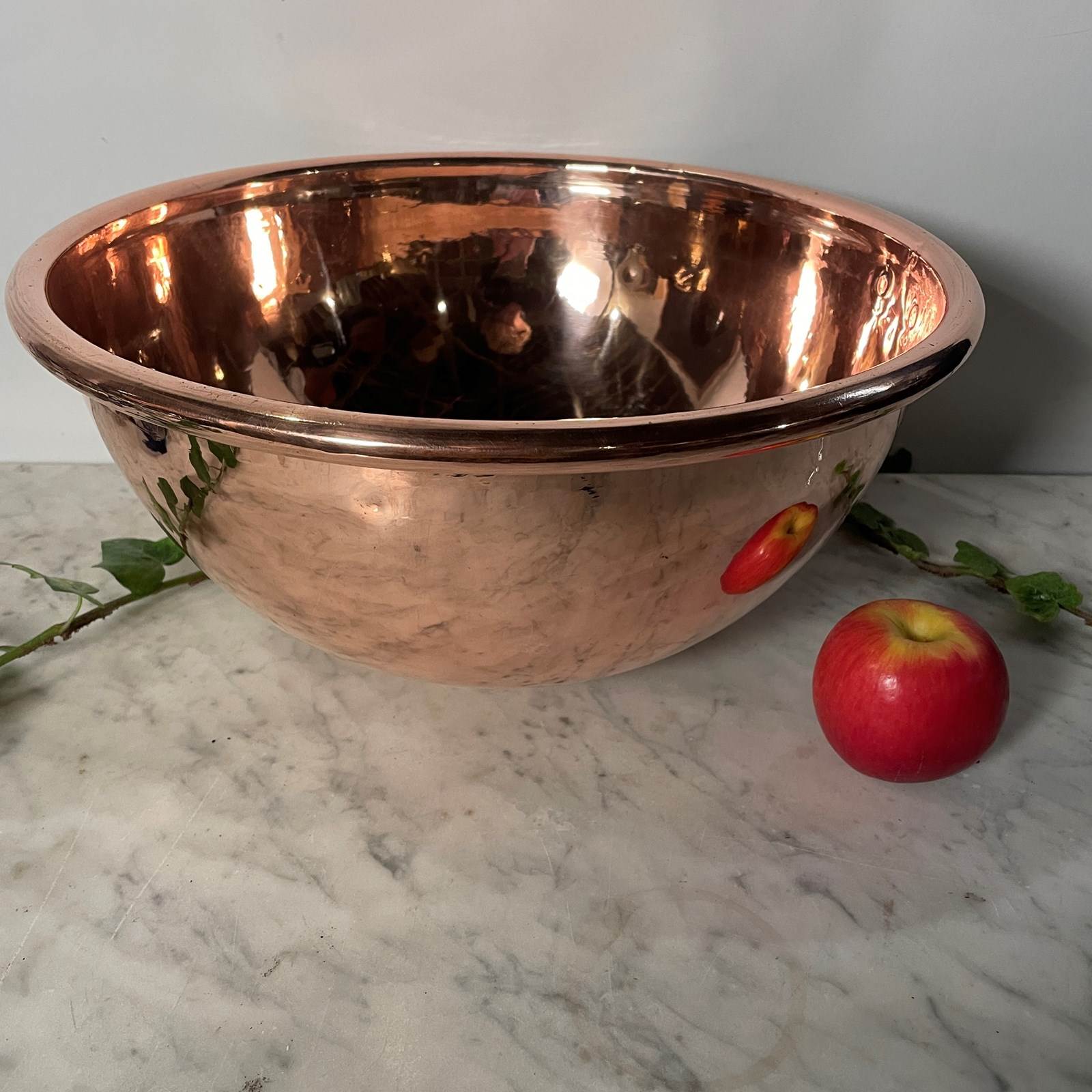 A fabulous large French copper egg bowl, with brass riveted handle to enable you to hang when not in use. This style of bowl was used in a large country kitchen to whisk eggs, or as a Bain Marie over a pan.