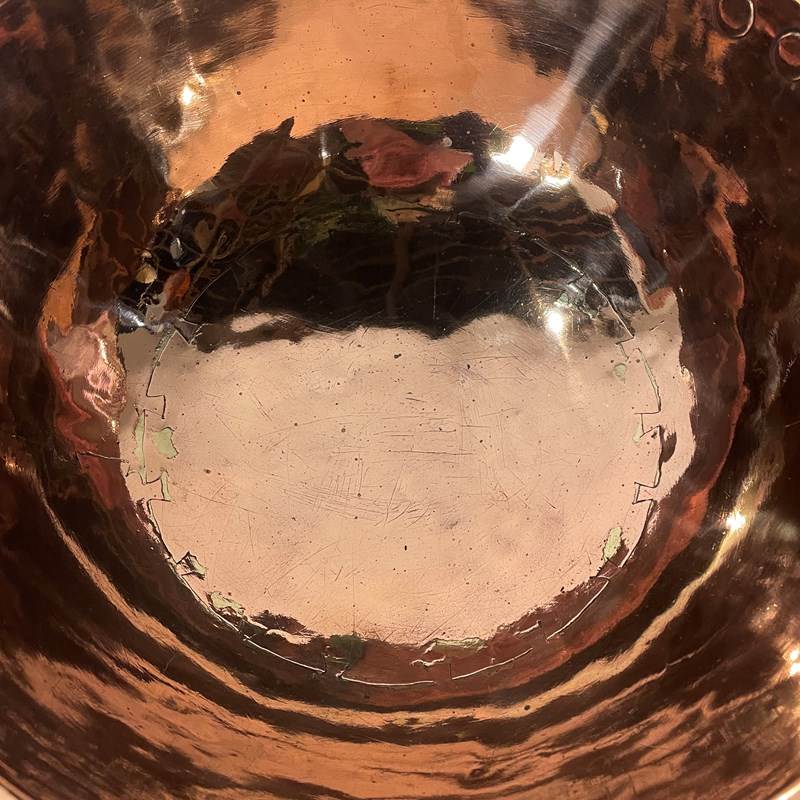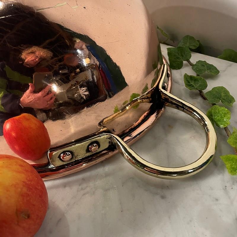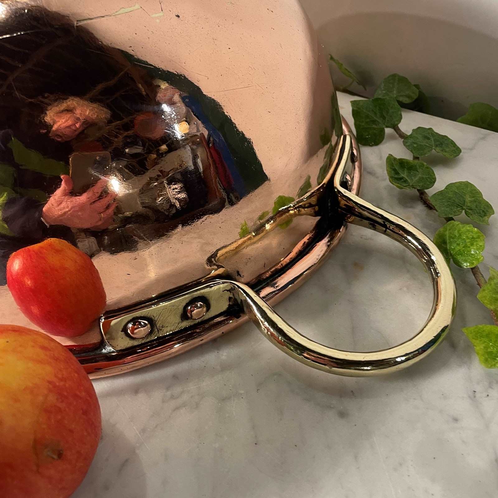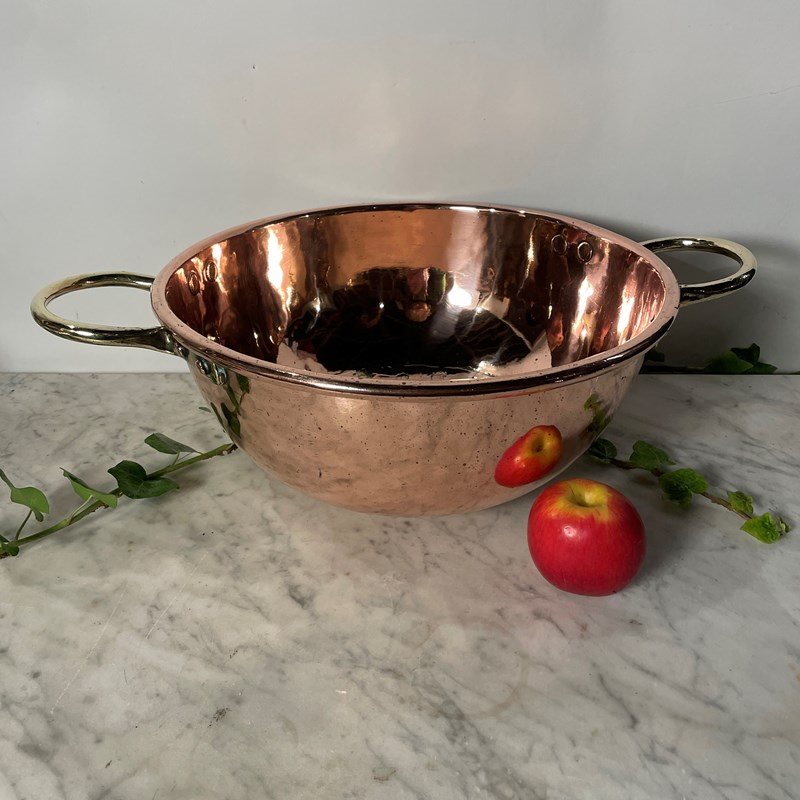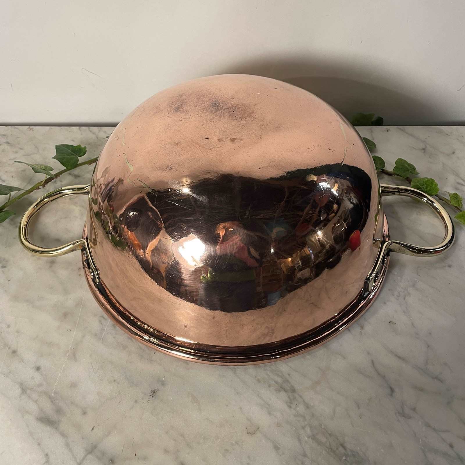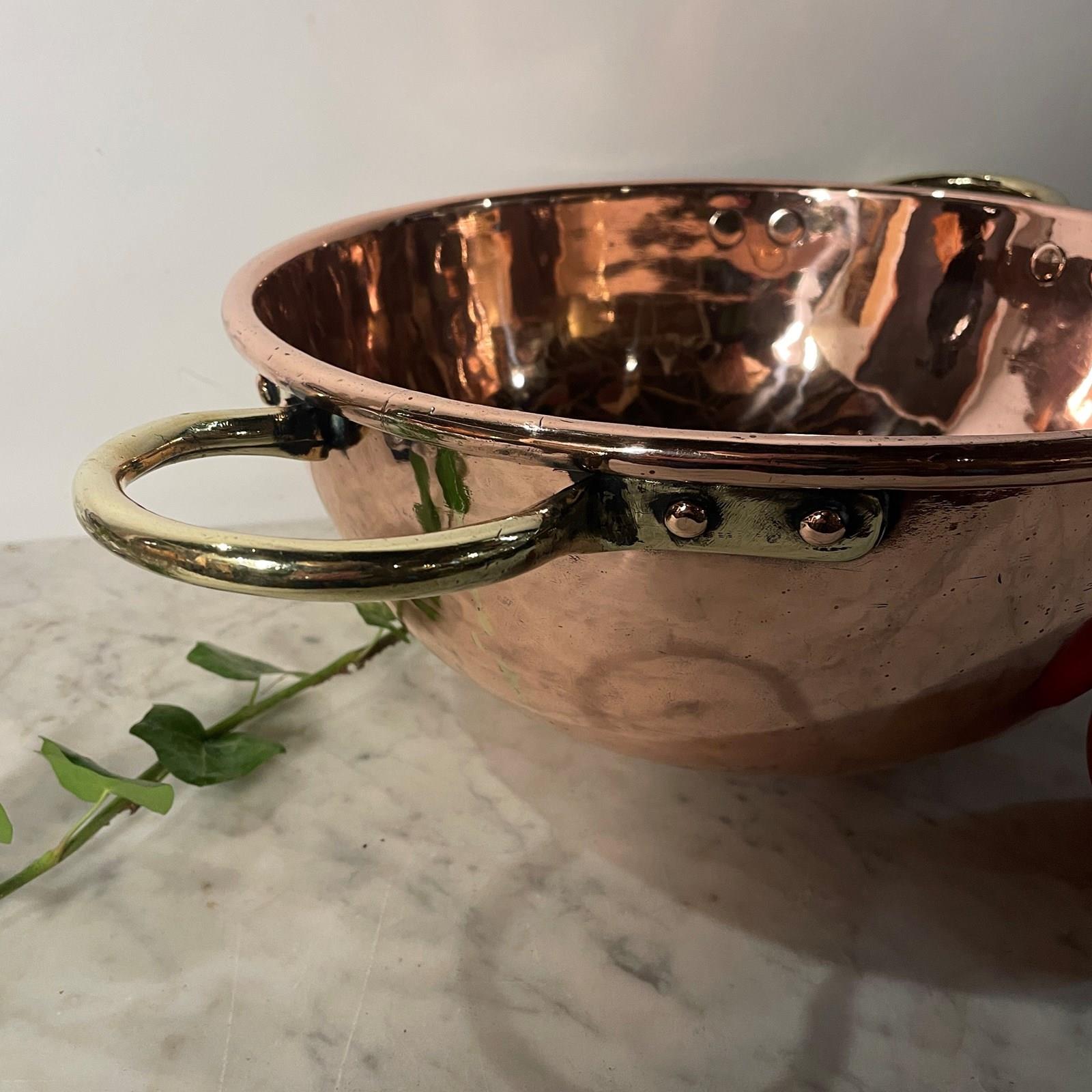 A fabulous large French copper egg bowl, with brass riveted handle to enable you to hang when not in use. This style of bowl was used in a large country kitchen to whisk eggs, or as a Bain Marie over a pan.