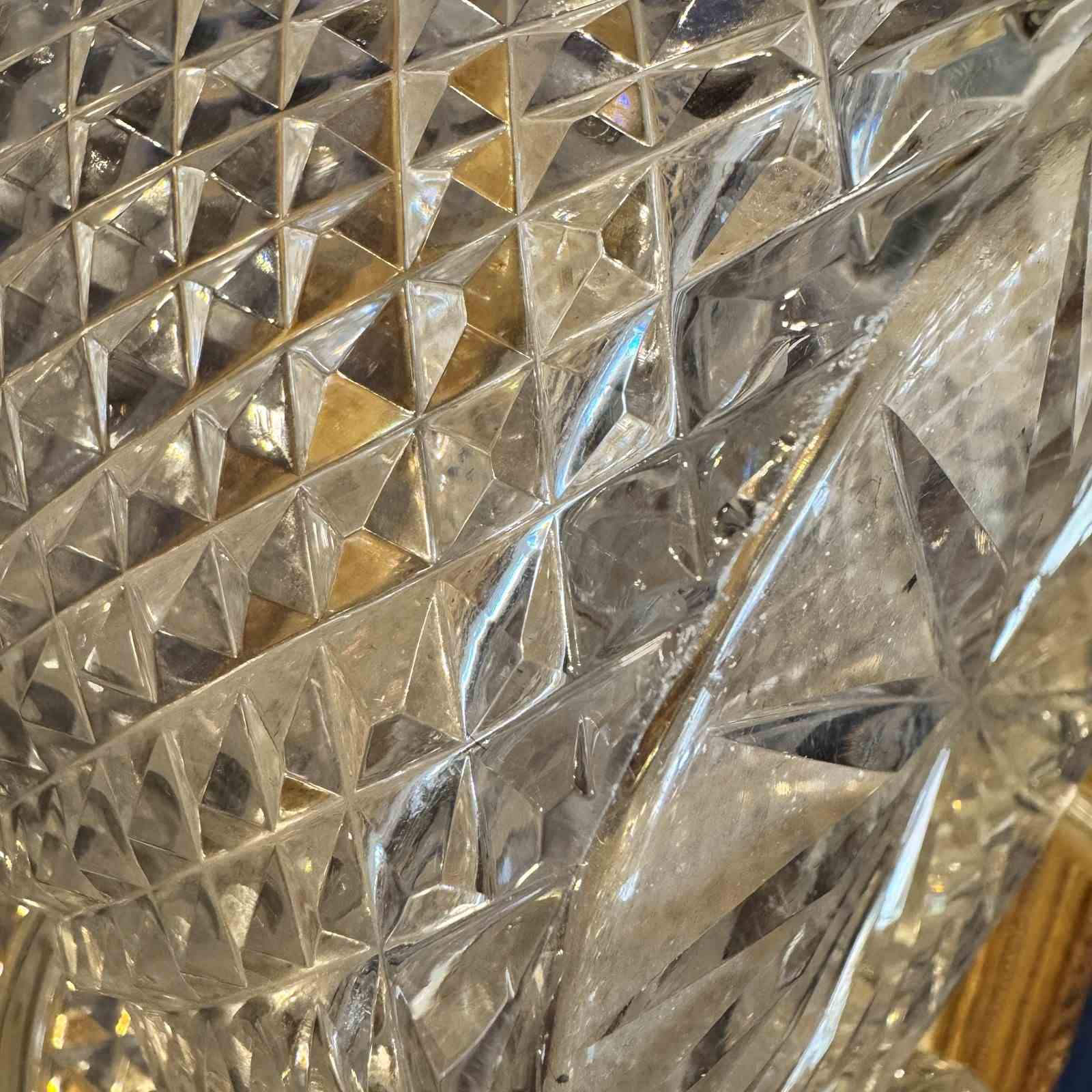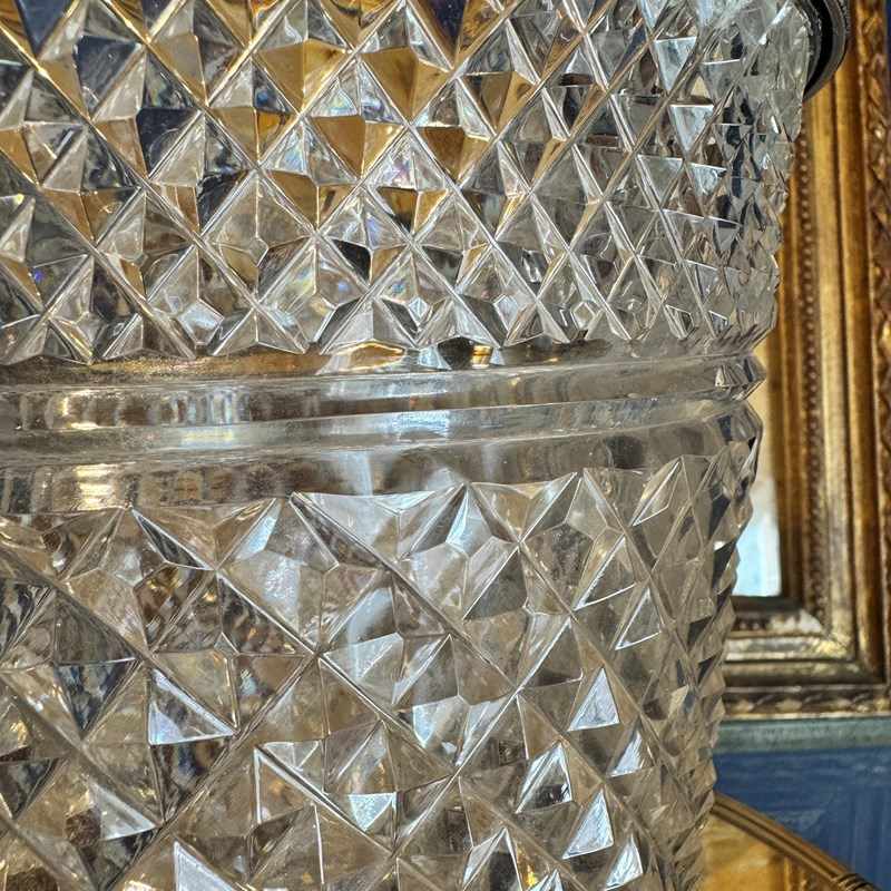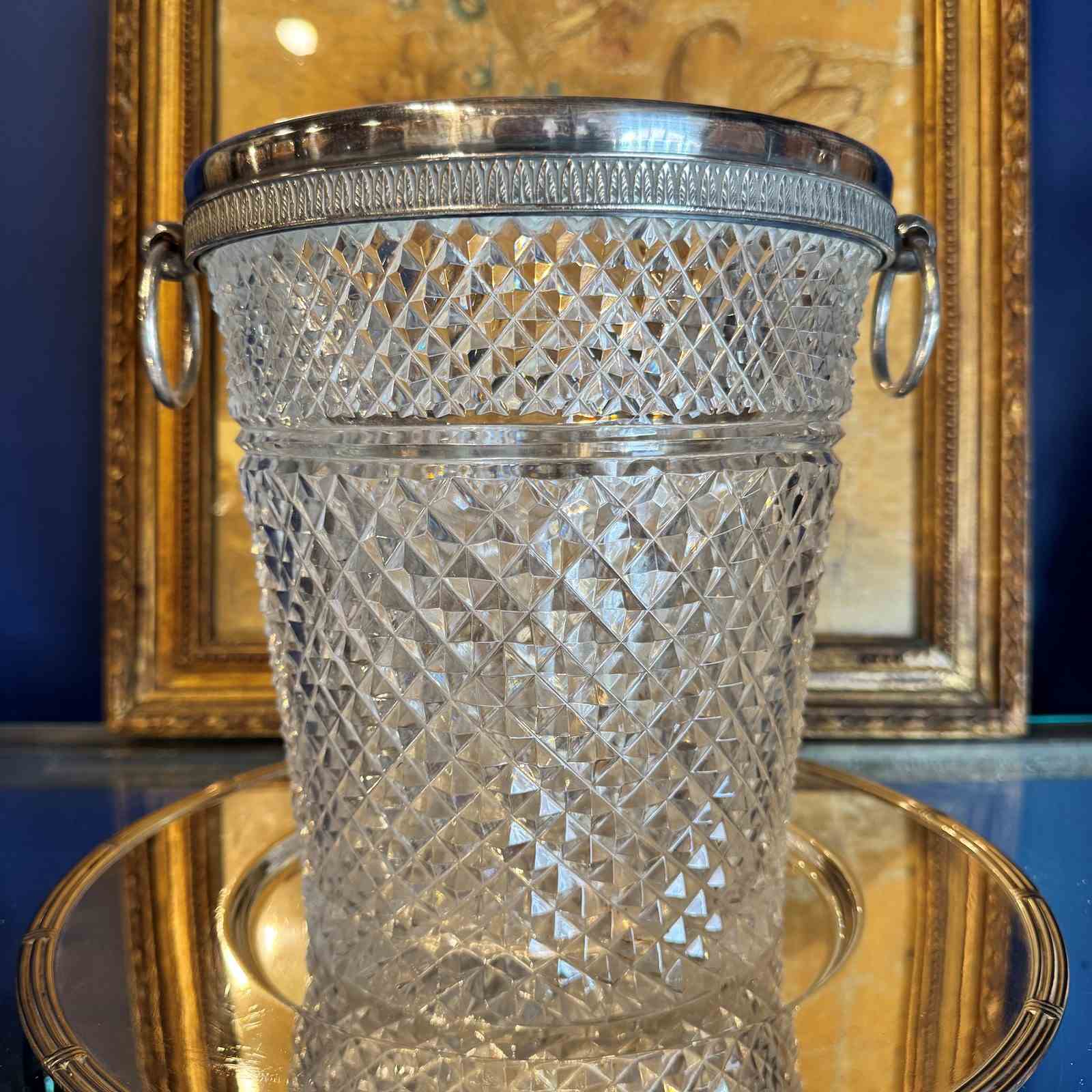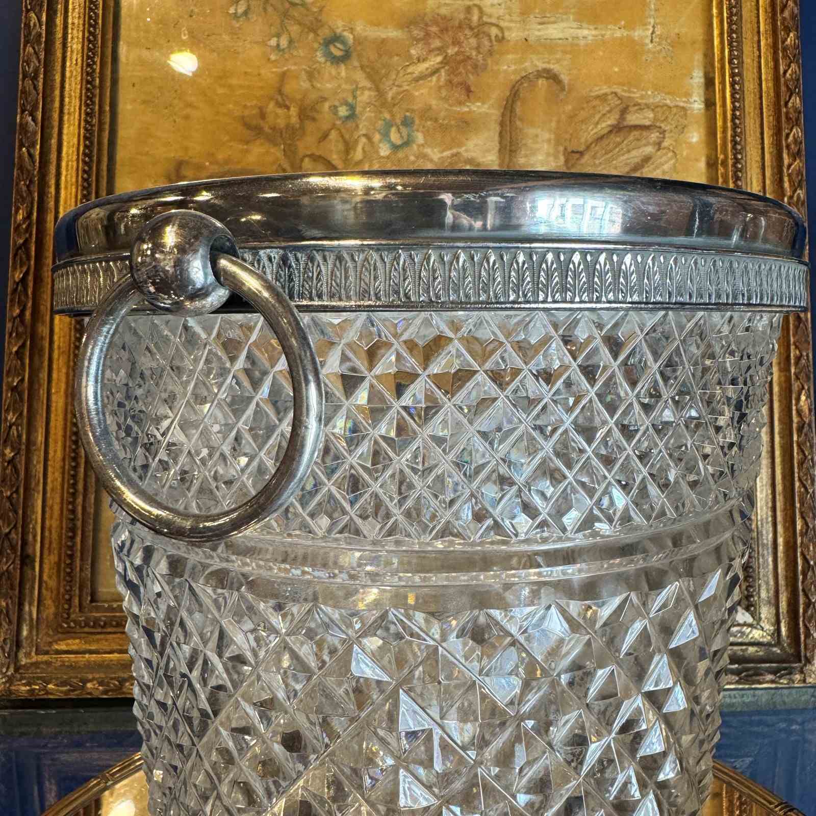 A large glass champagne ice bucket with a silver plated rim and two ring handles.