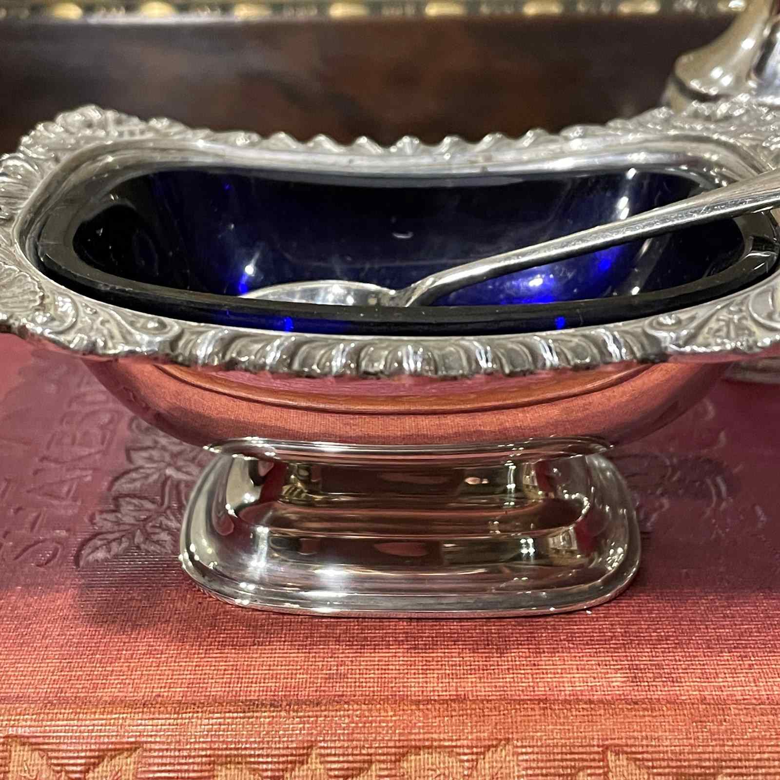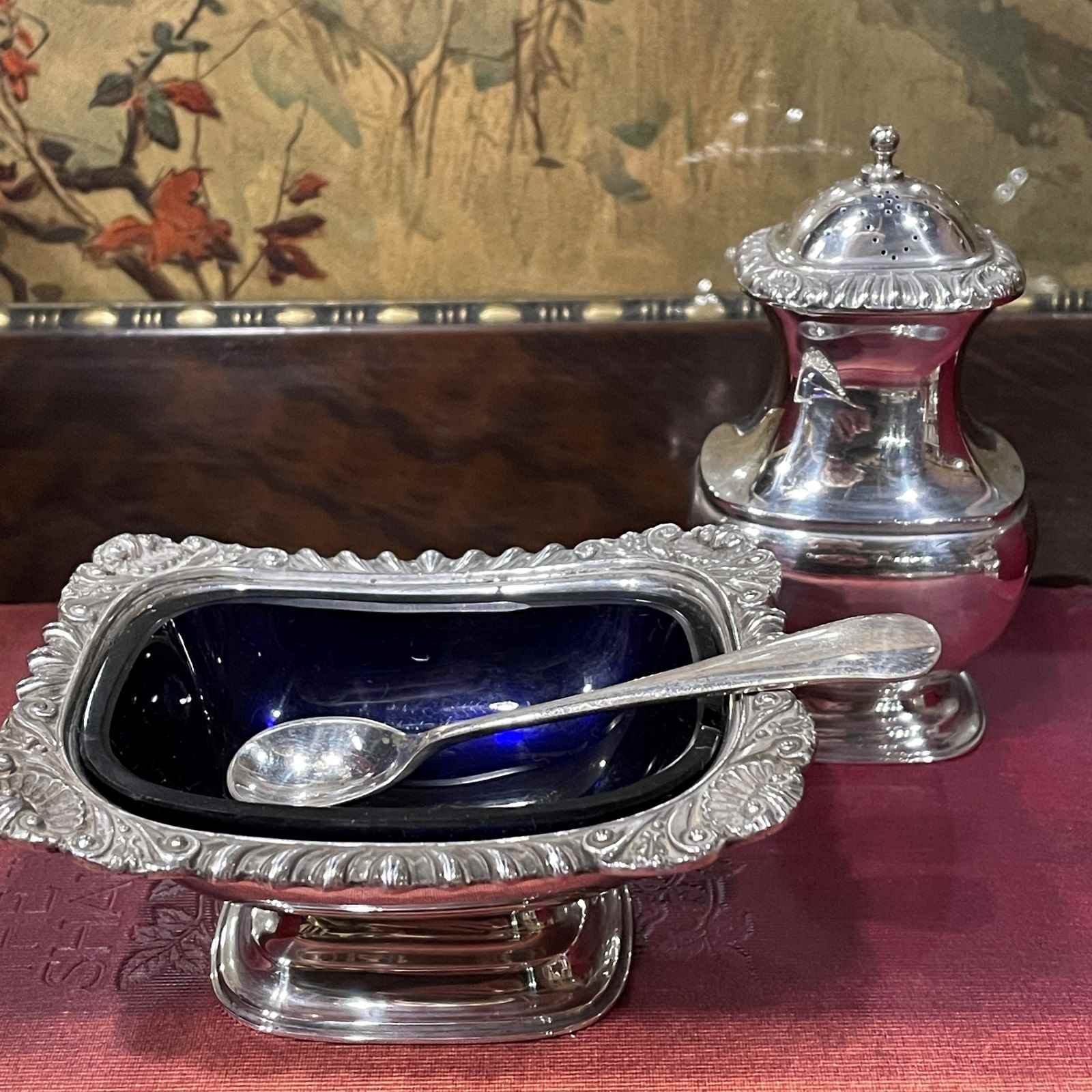 A good sized silver plated salt dish with spoon and blue glass liner along with a silver plated pepper pot.