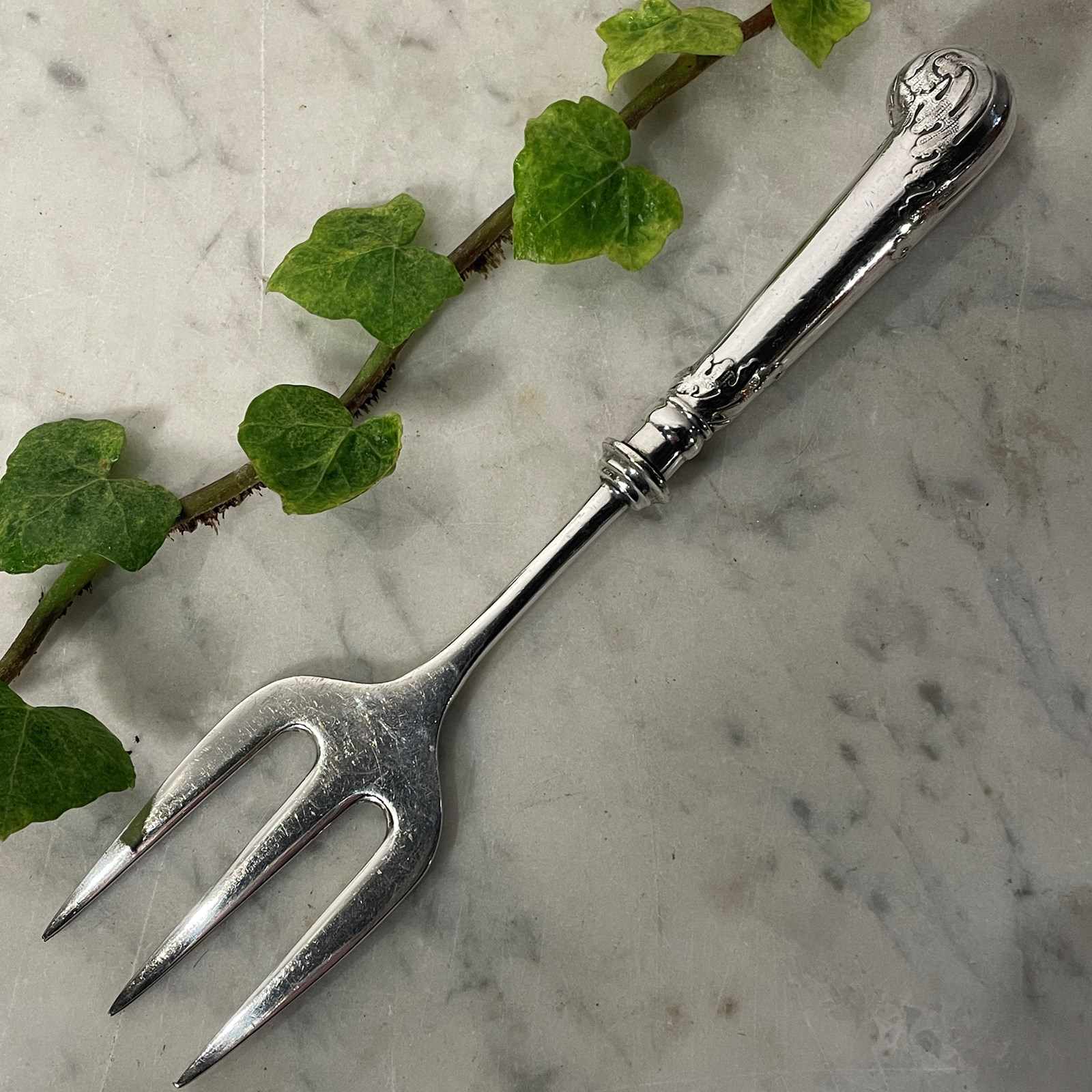 A large Victorian silver plated serving fork perfect for serving charcuterie or bread.