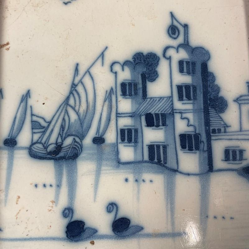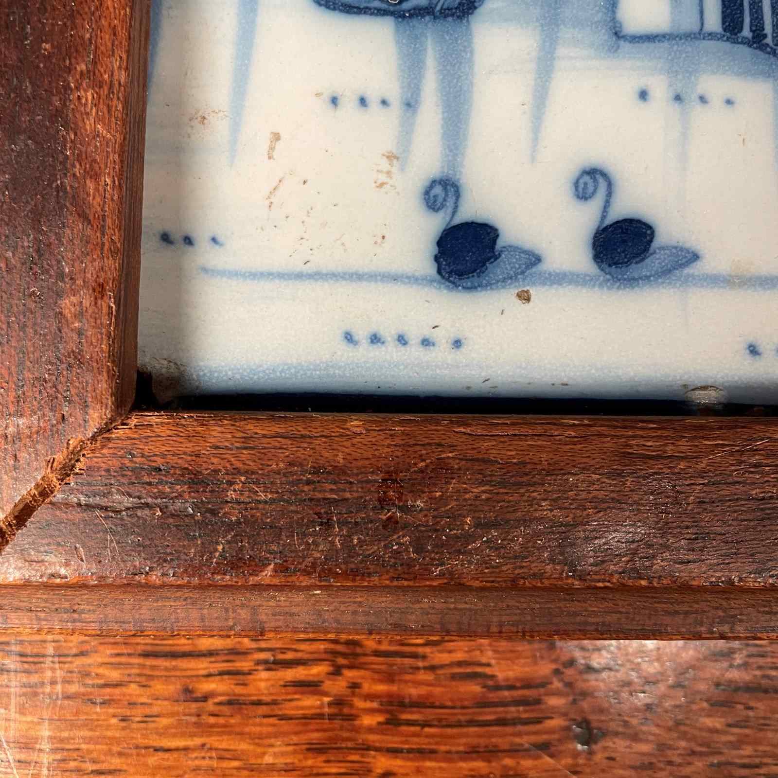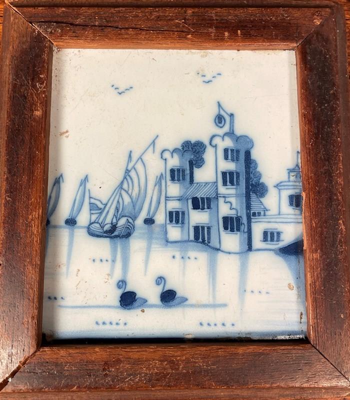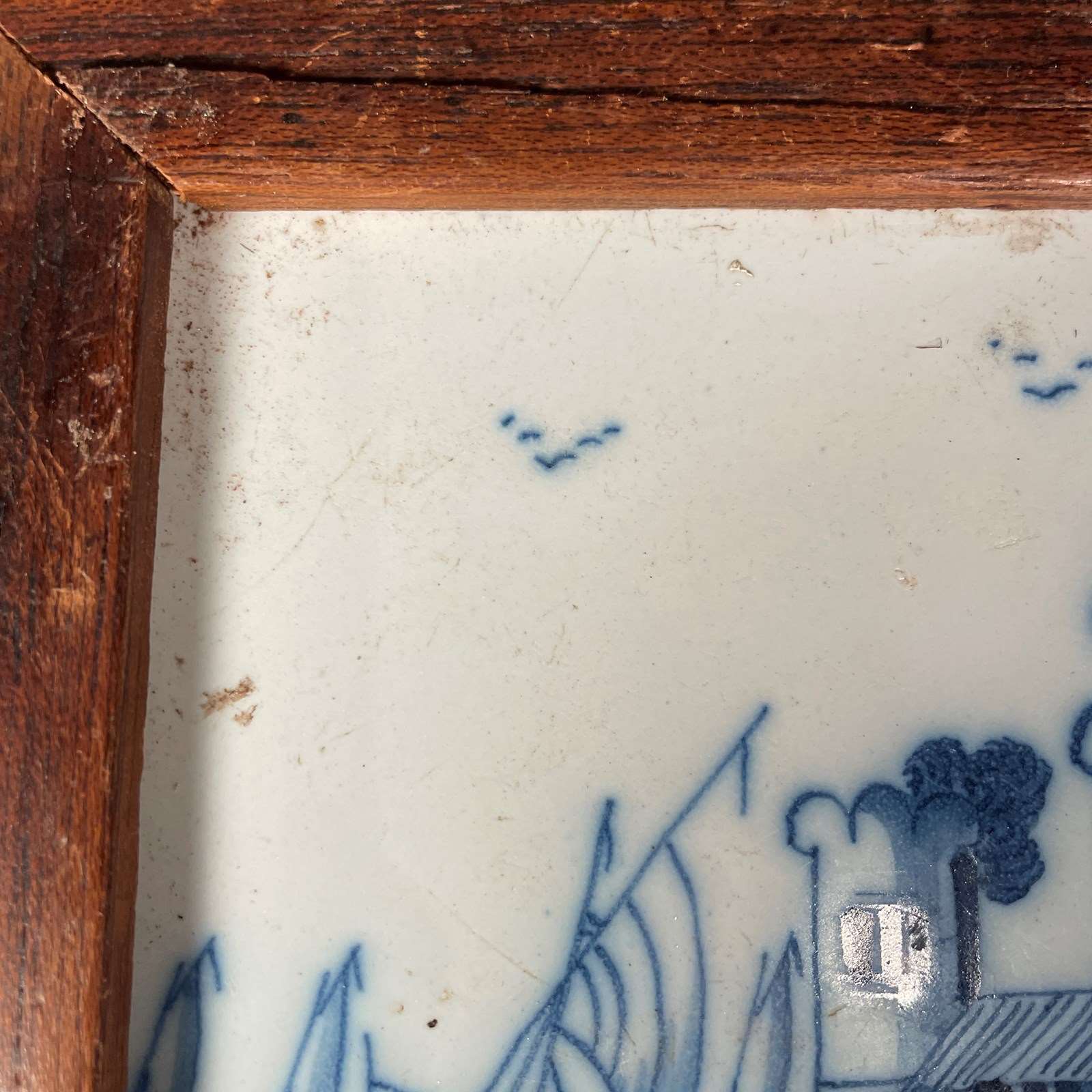A blue and white Delft tile depicting a Dutch tower and boat scene. This tile would have originally been mounted on the wall in a kitchen in Holland around 1800-1820. It has later been removed and framed in a wooden frame at the end of the 19th century.
