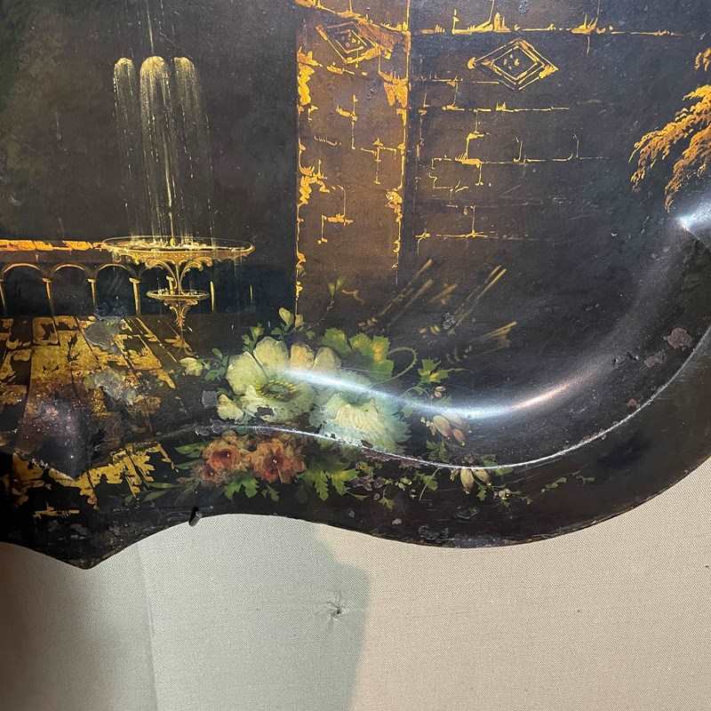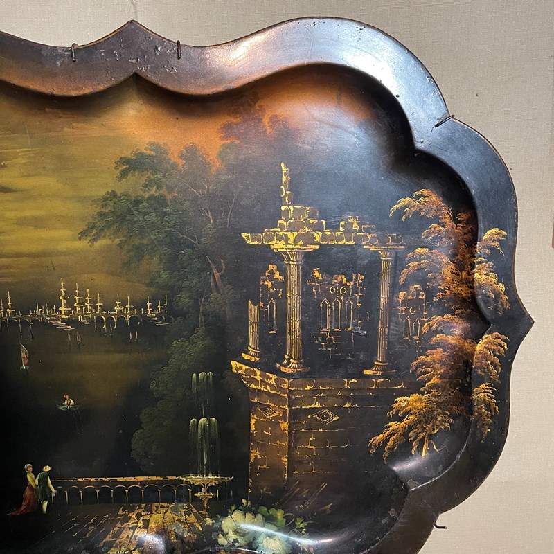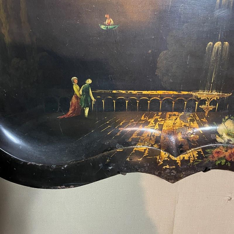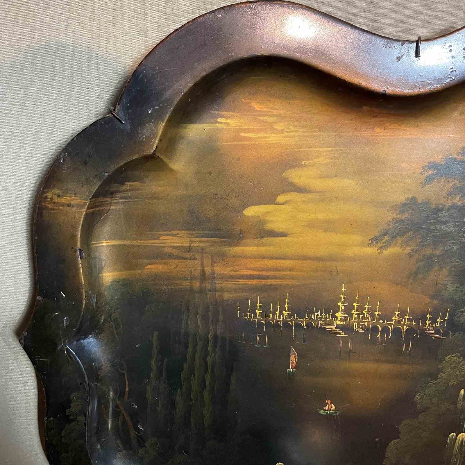 This is a very large hand painted toile work tray made around the beginning of the Victorian period.