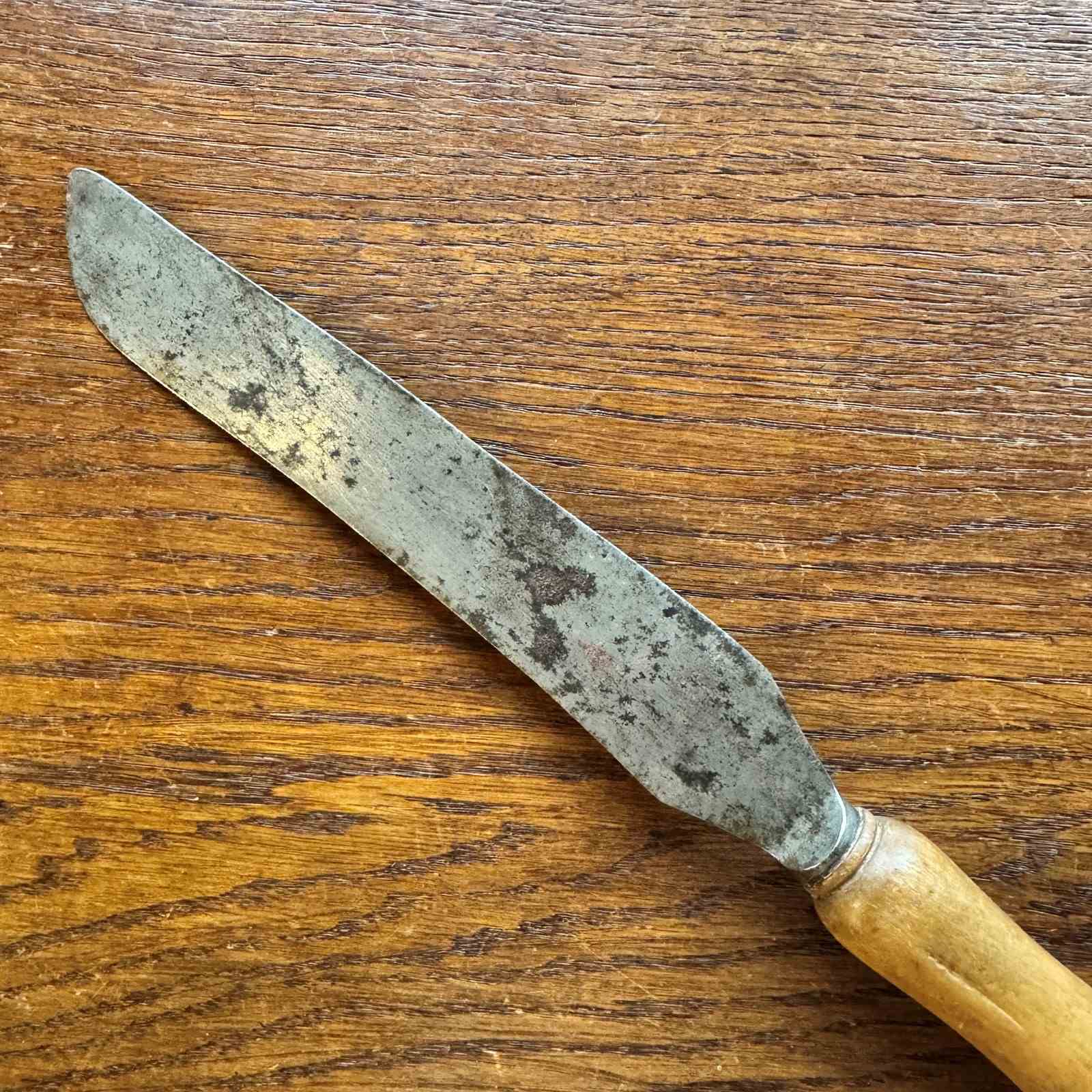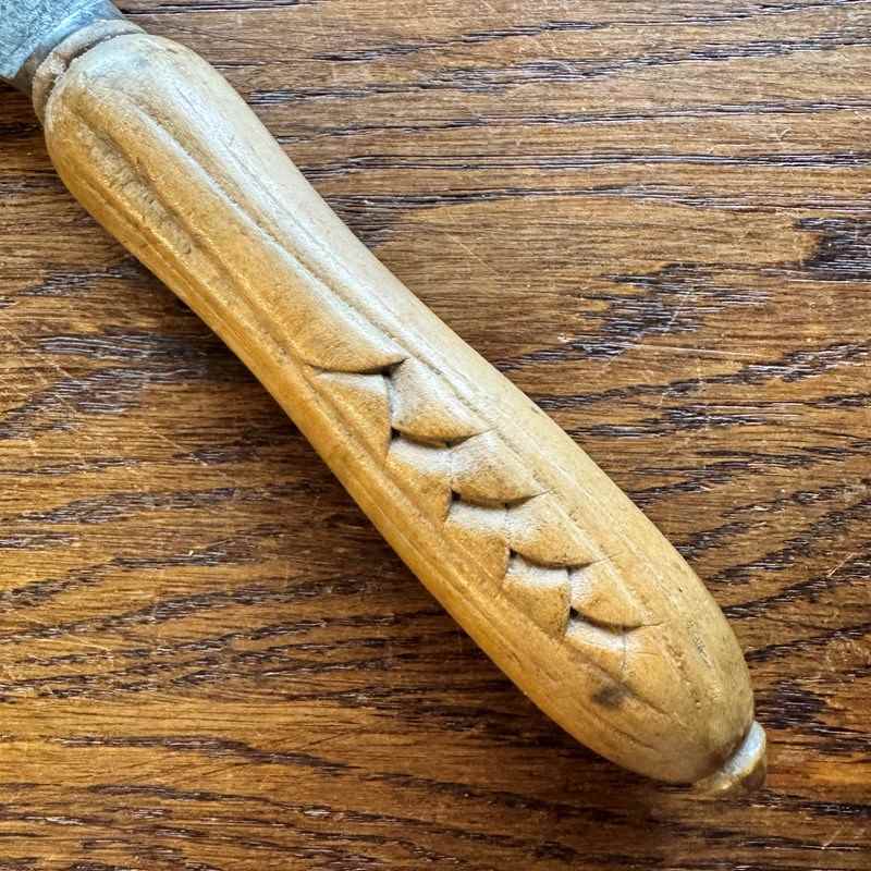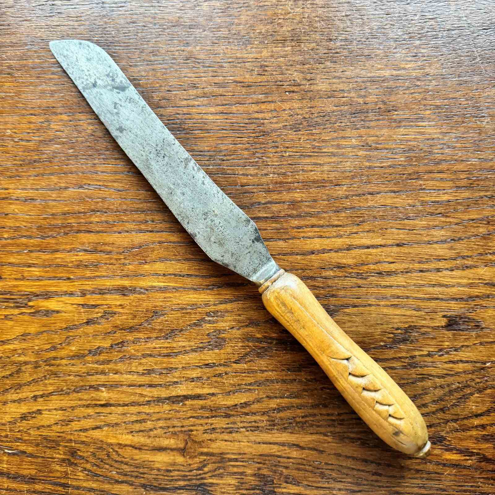 Victorian sycamore-handled carving knife with wheatsheaf carved design on handle and steel blade, used for carving bread.