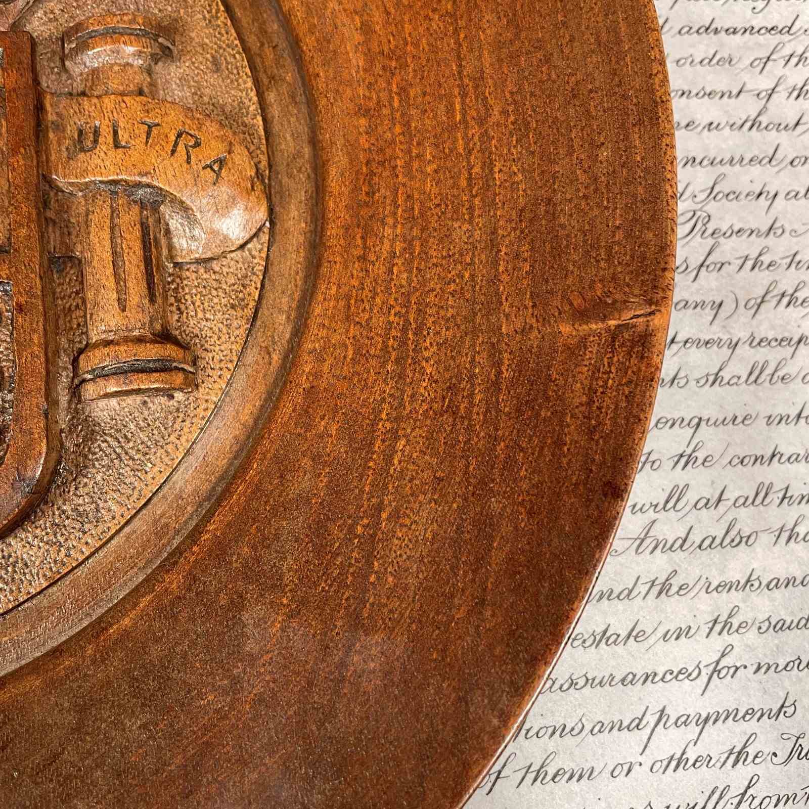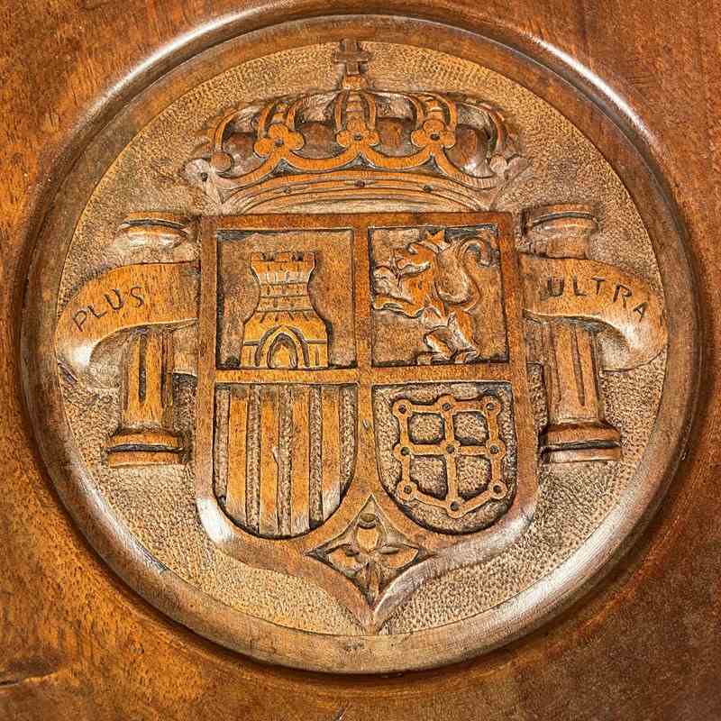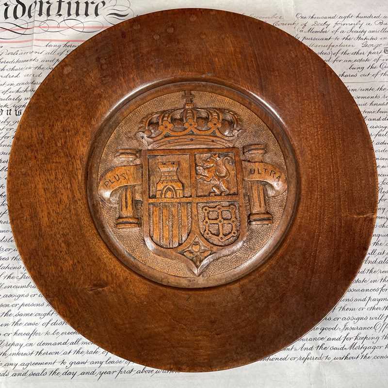 A well carved plaque or plate depicting a coat of arms, possibly Spanish.