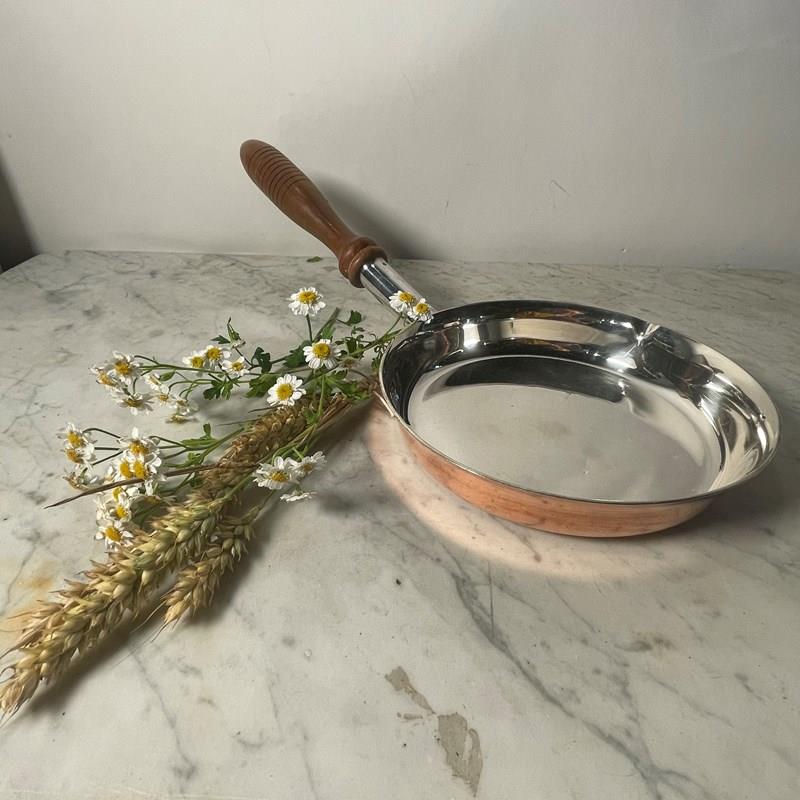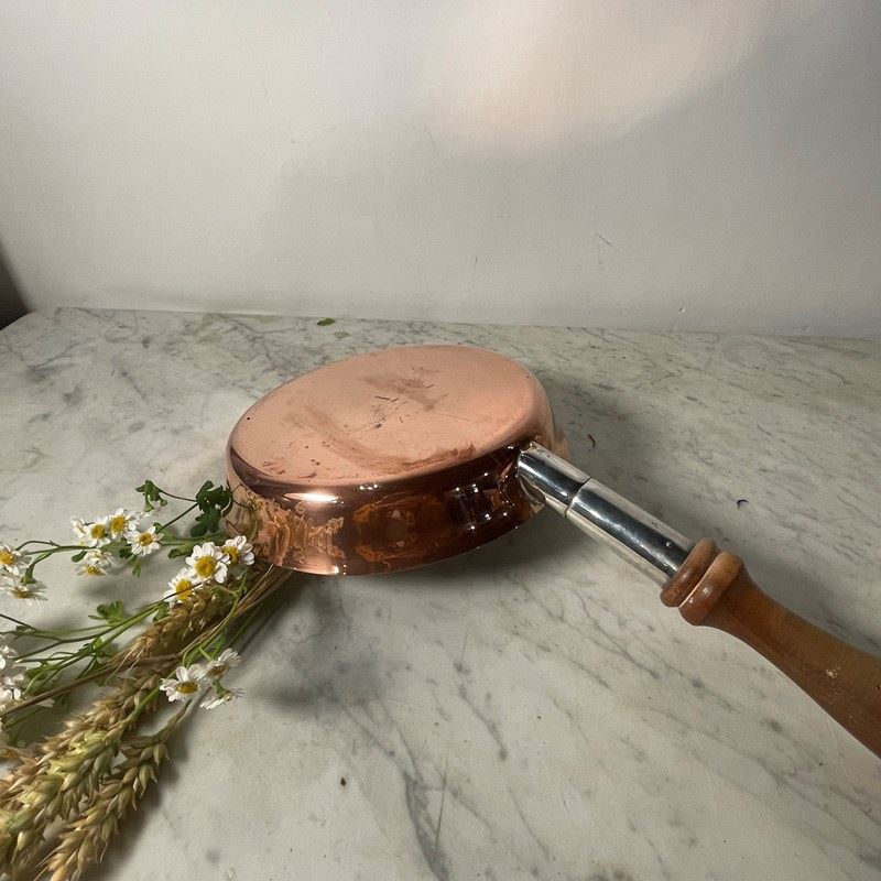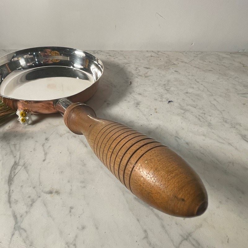 Vintage copper crêpe skillet with turned wood handle and silver plated lining. Made in France.