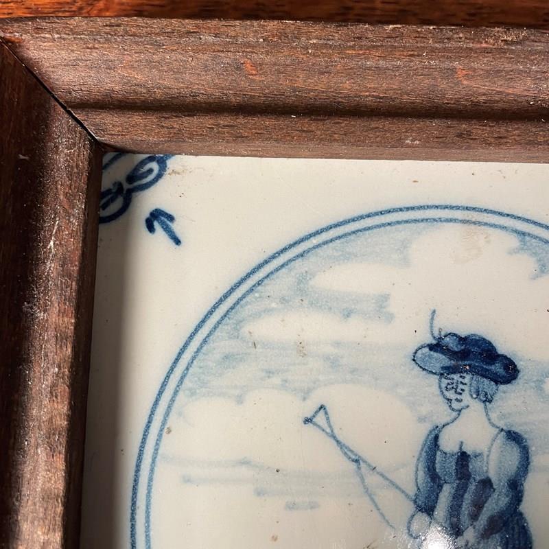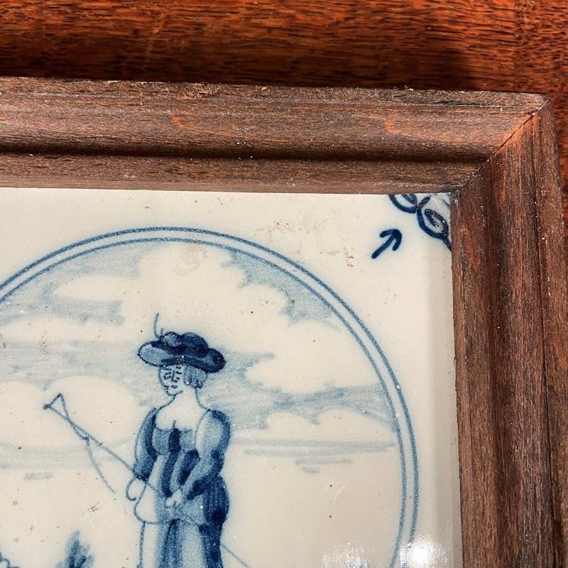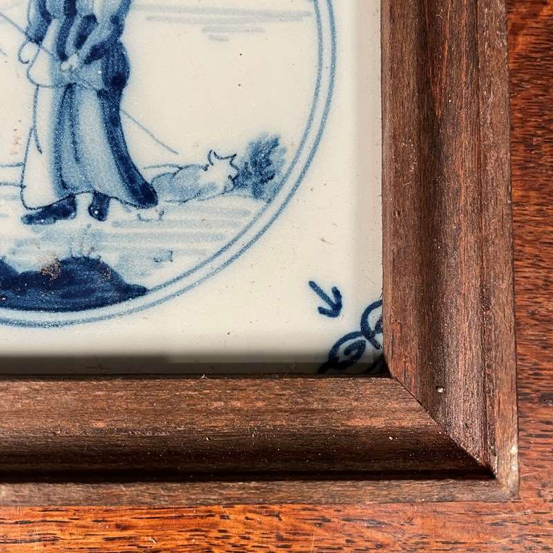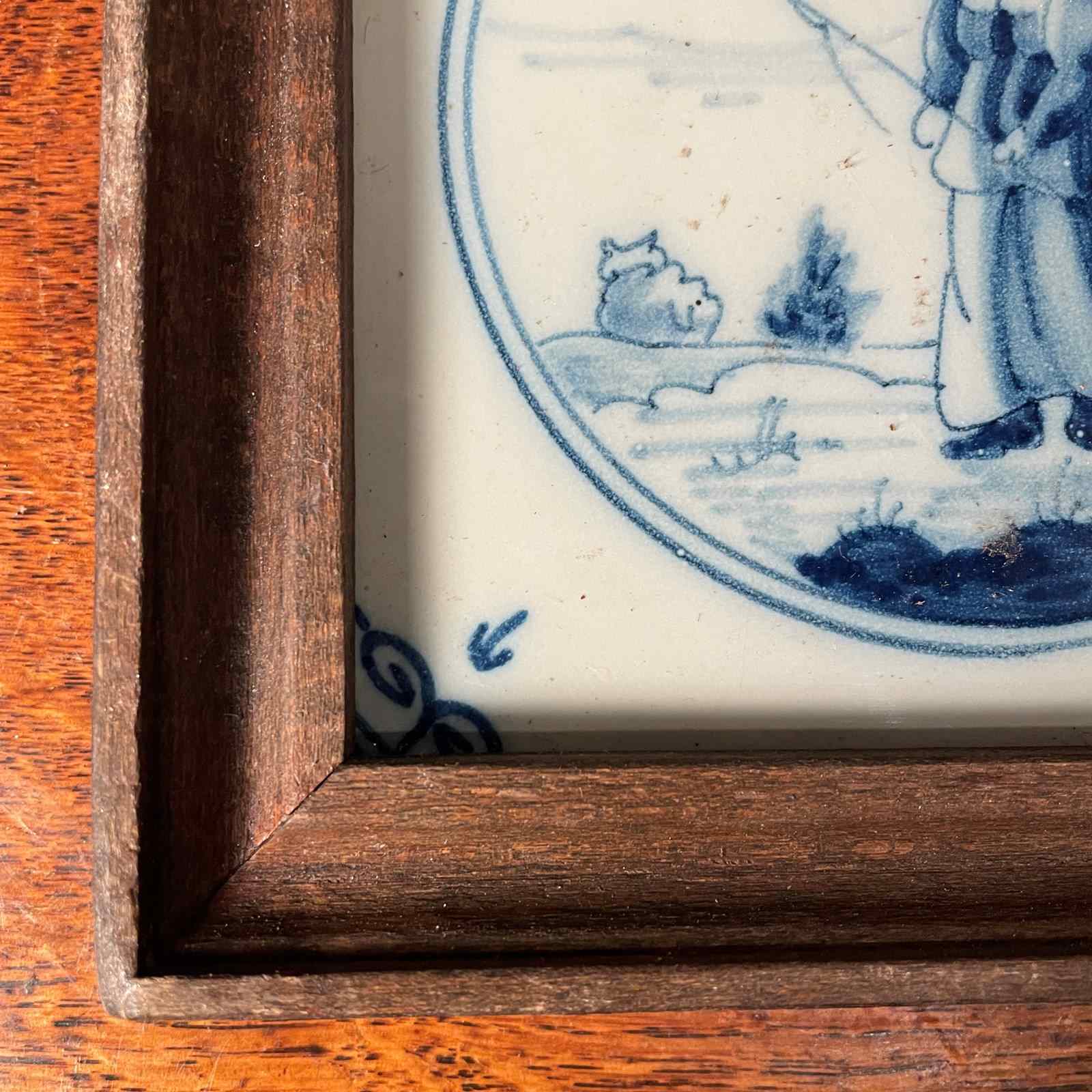 A blue and white Delft tile depicting a man hunting. This tile would have originally been mounted on the wall in a kitchen in Holland around 1800-1820 It has later been removed and framed in a wooden frame at the end of the 19th century.