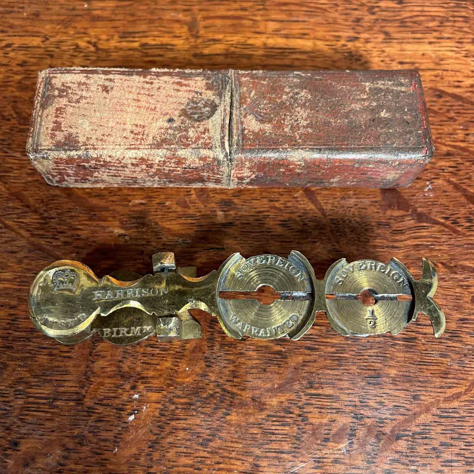 Victorian sovereign scales, I find these little things amazing! They have a crown duty stamp embossed into them and the makers name Harrison. These would be carried in a gentleman’s pocket ,he would be able to weigh a gold sovereign to ensure it was genuine. It has its original card box.c1850.