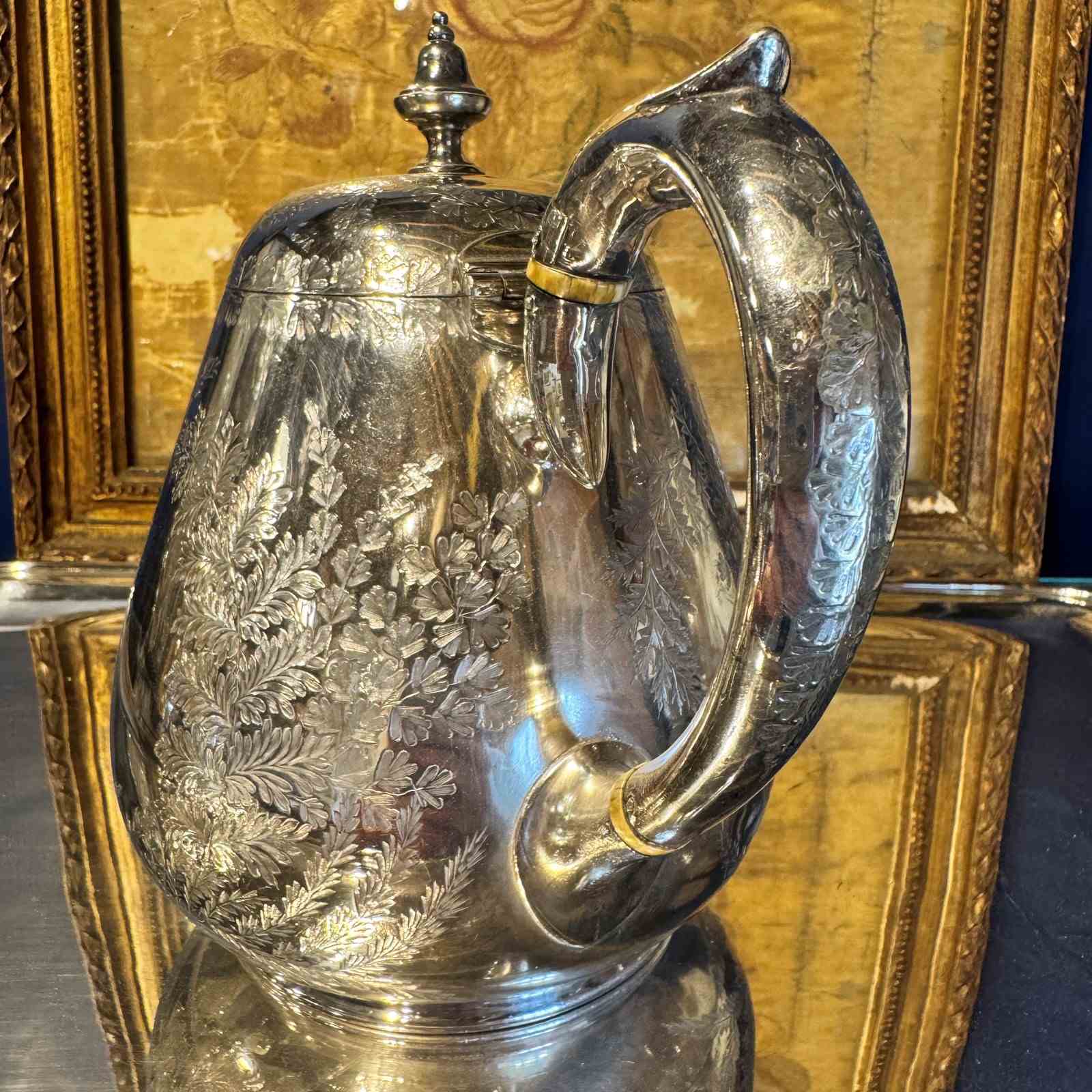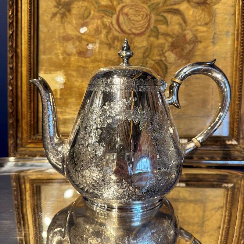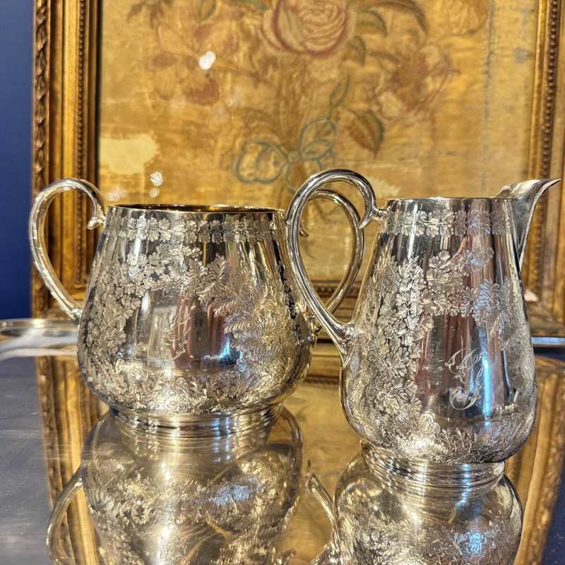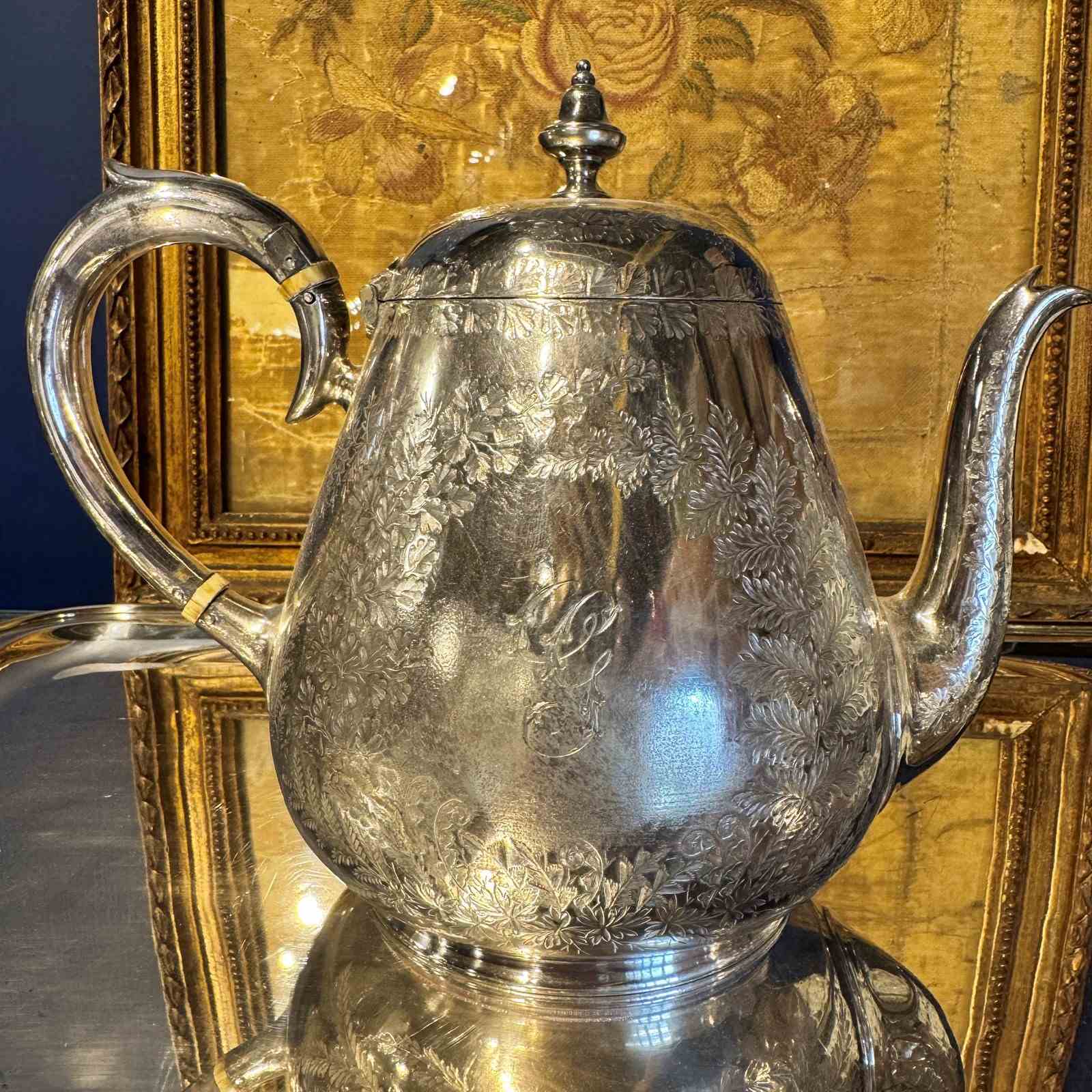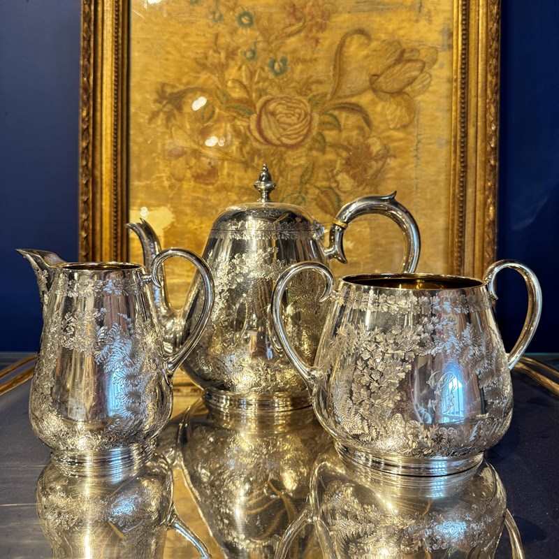A wonderful quality 3 piece silver plated tea set with gilded interior to the milk jug and sugar bowl. The set comprises: a tea pot, milk jug and sugar bowl all decorated with a elaborate design a very typical piece of high Victoriana. They are all engraved with the letter 'G'