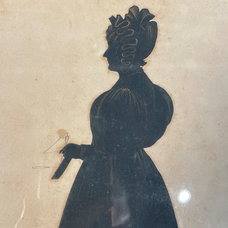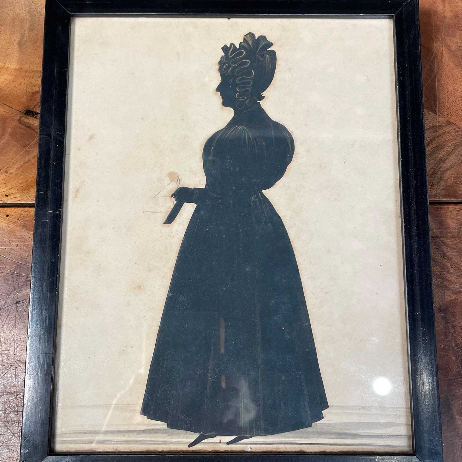 A full length silhouette a lady with gilded highlights, in slim black wooden frame.