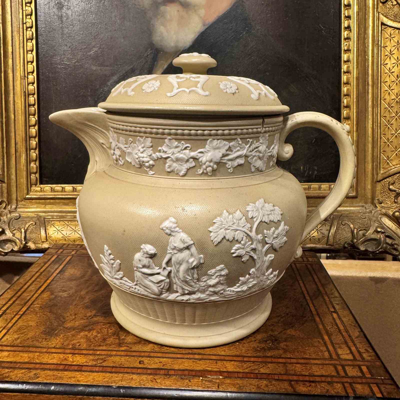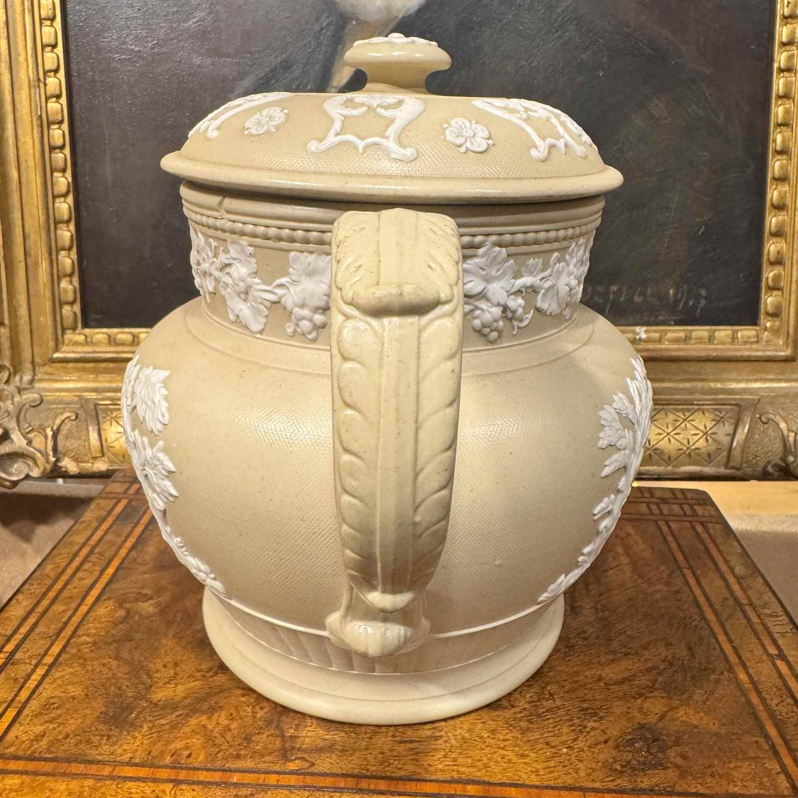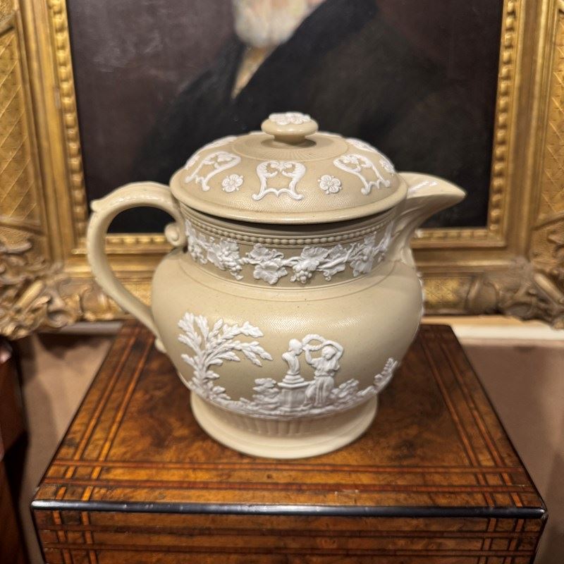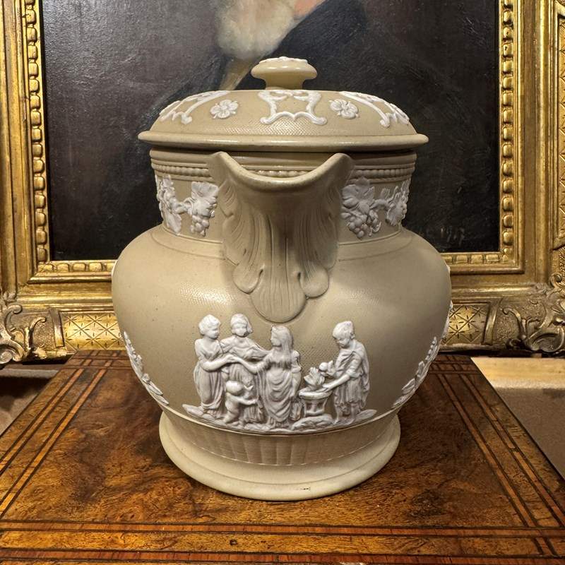 Large Jasperware teapot, very nice colour and detailed decoration.