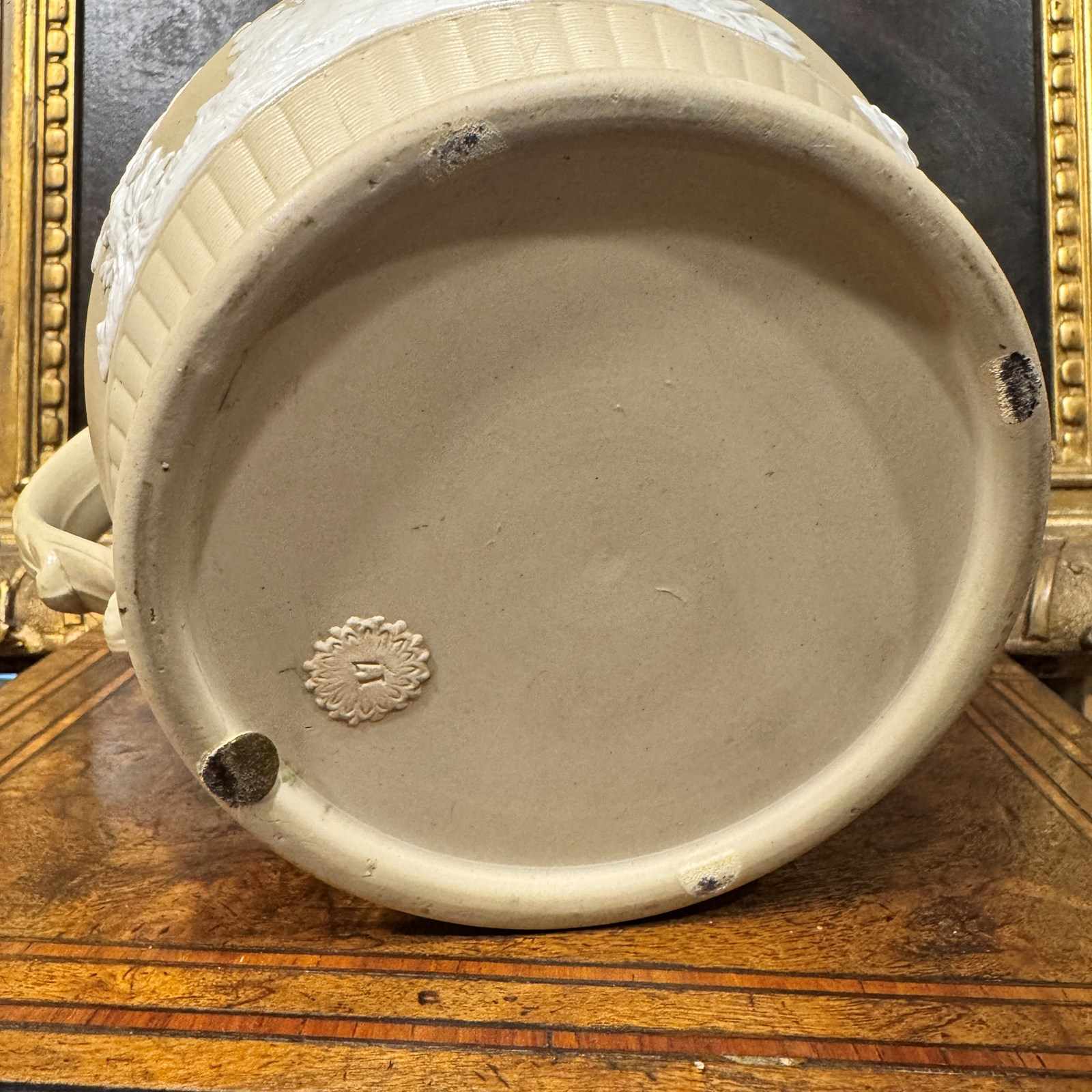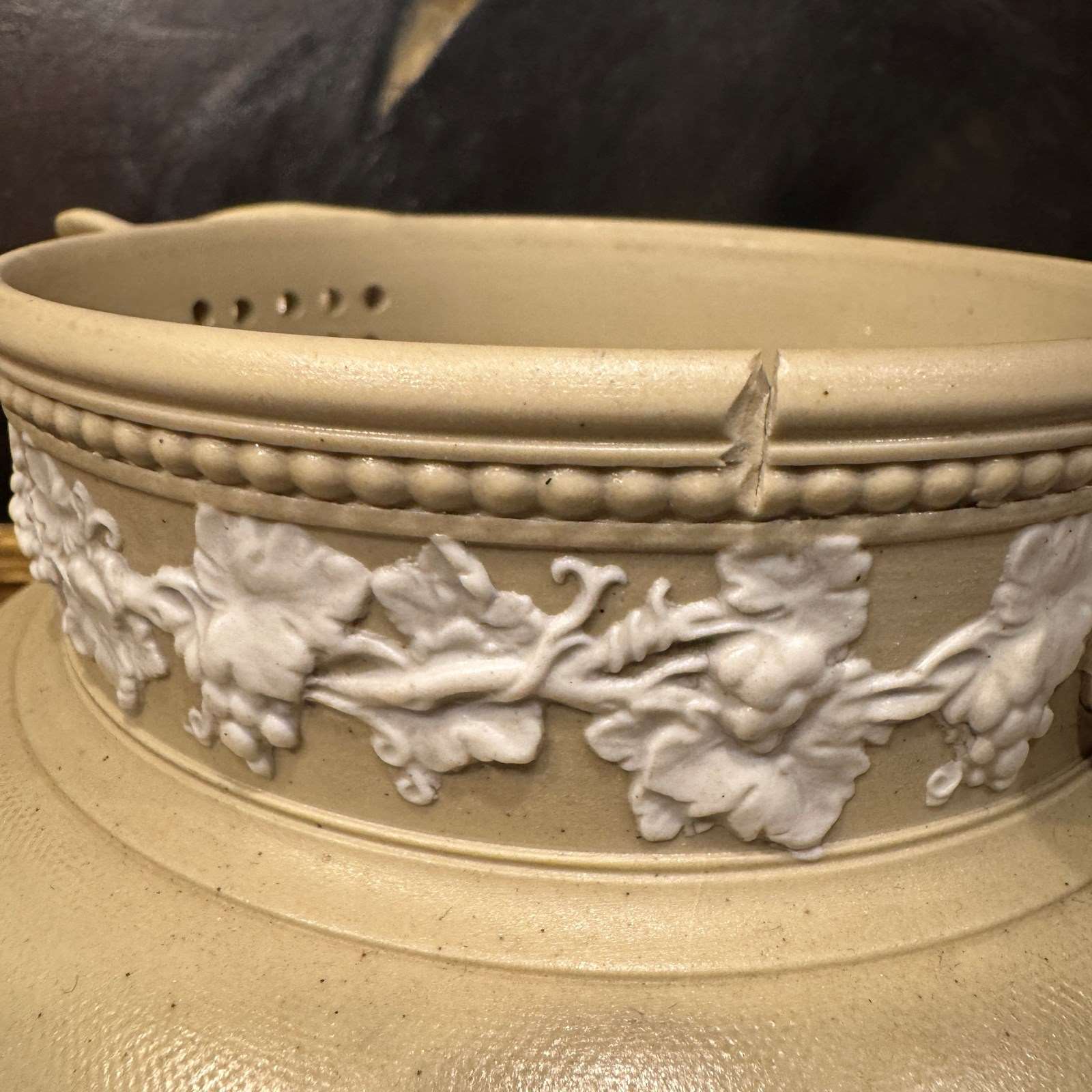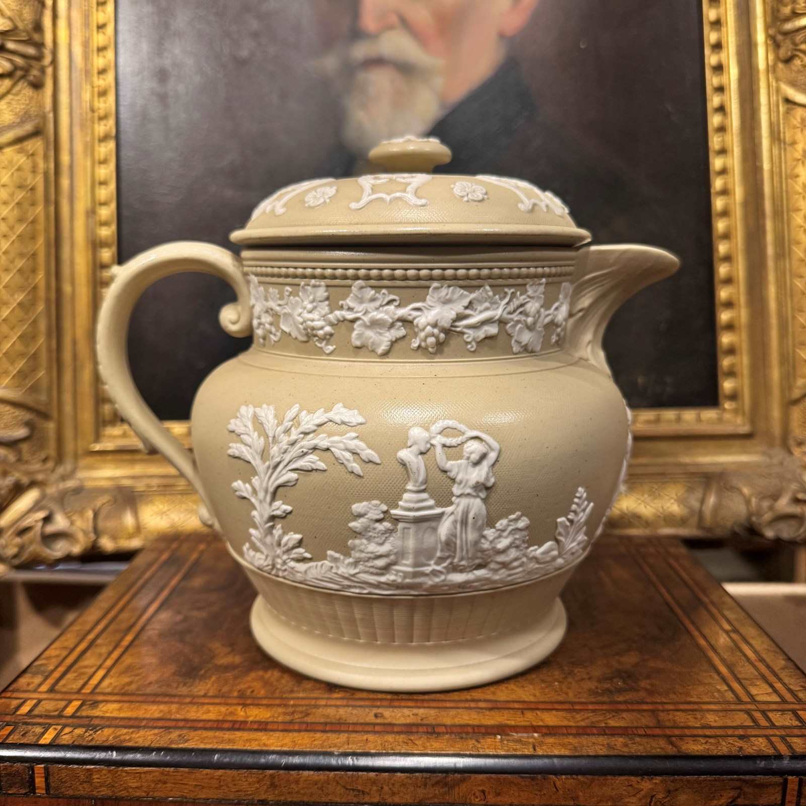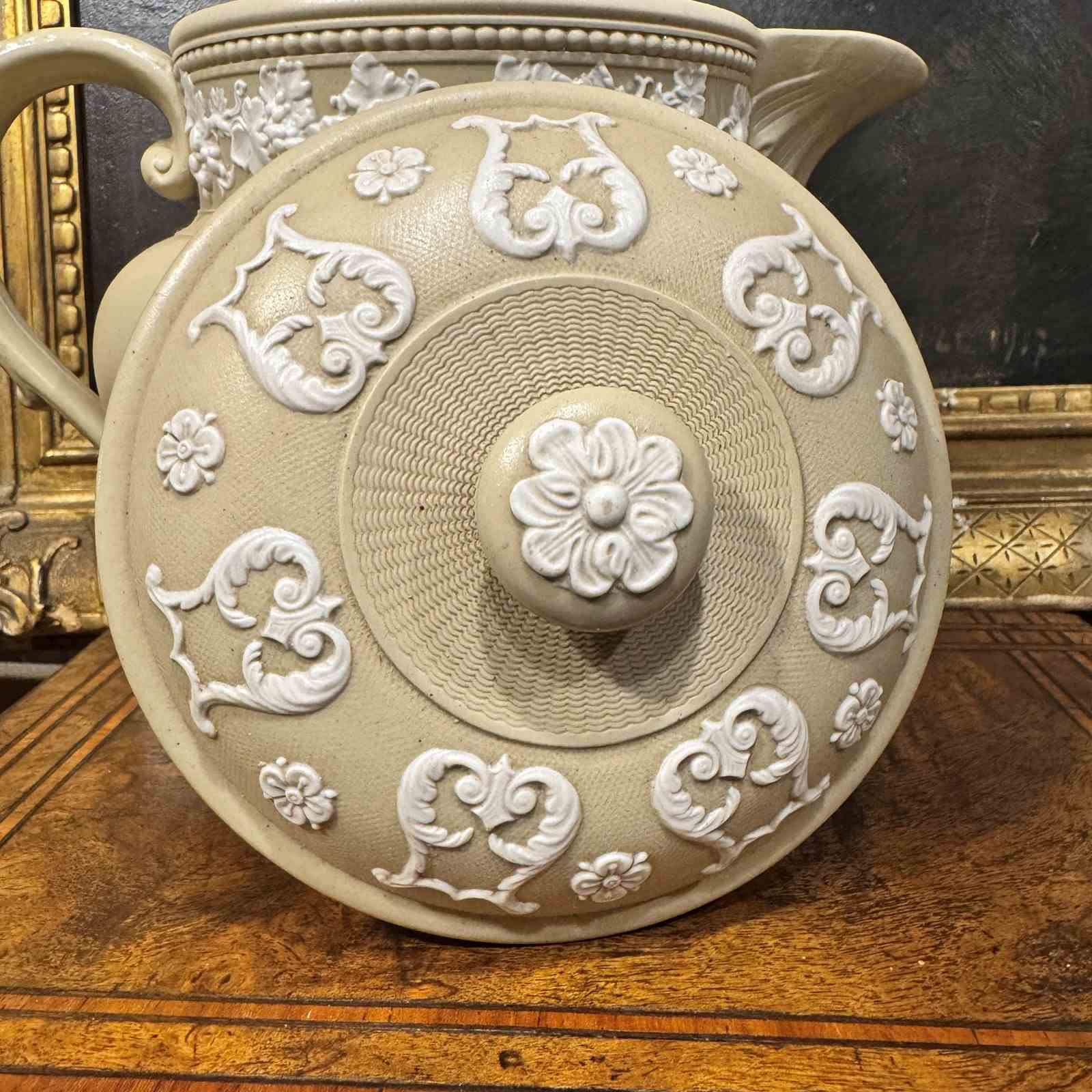 Large Jasperware teapot, very nice colour and detailed decoration.
